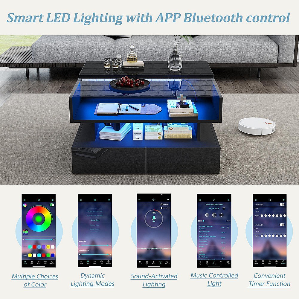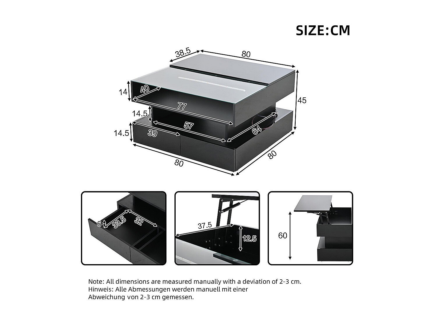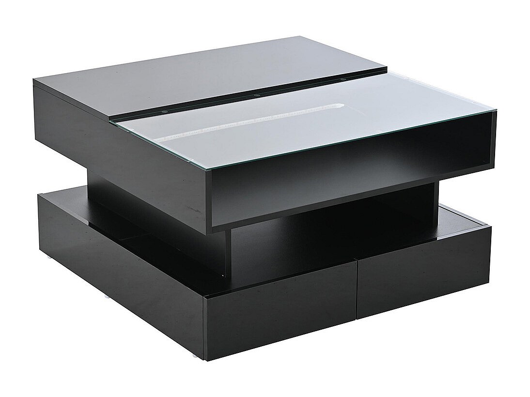 Table basse relevable - 80 x 80 x 45 cm - avec rangement dissimulé + 2 tiroirs + Leds - aggloméré + verre trempé - noire