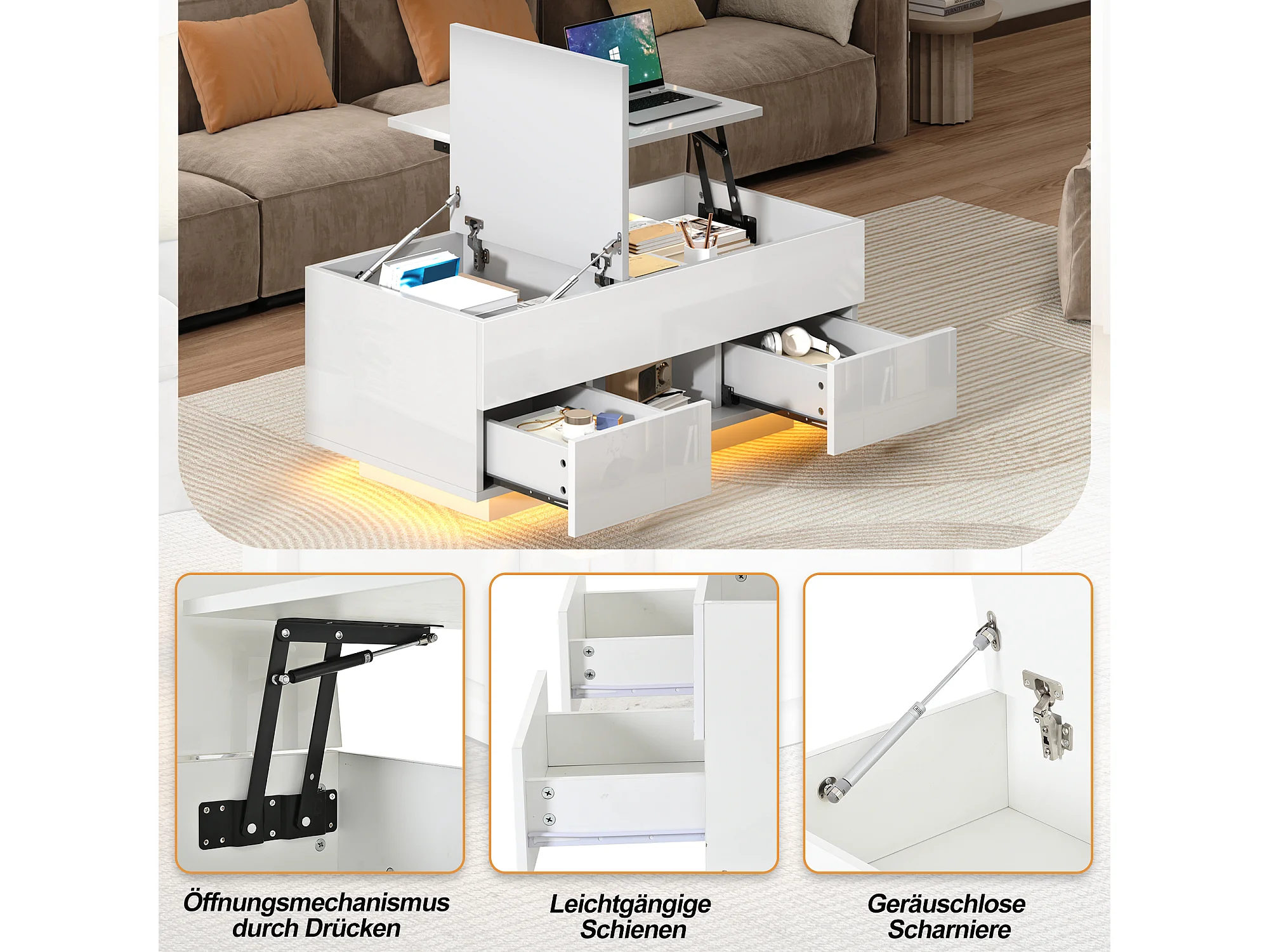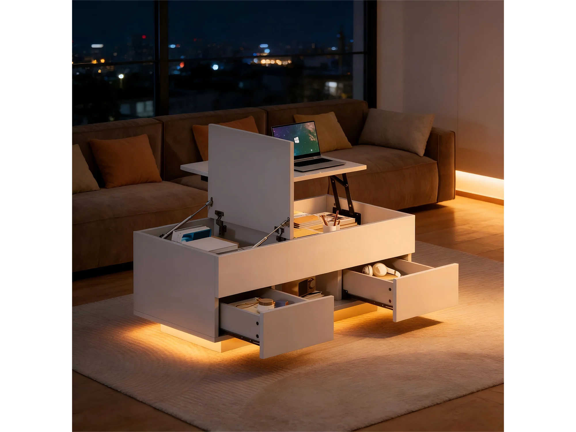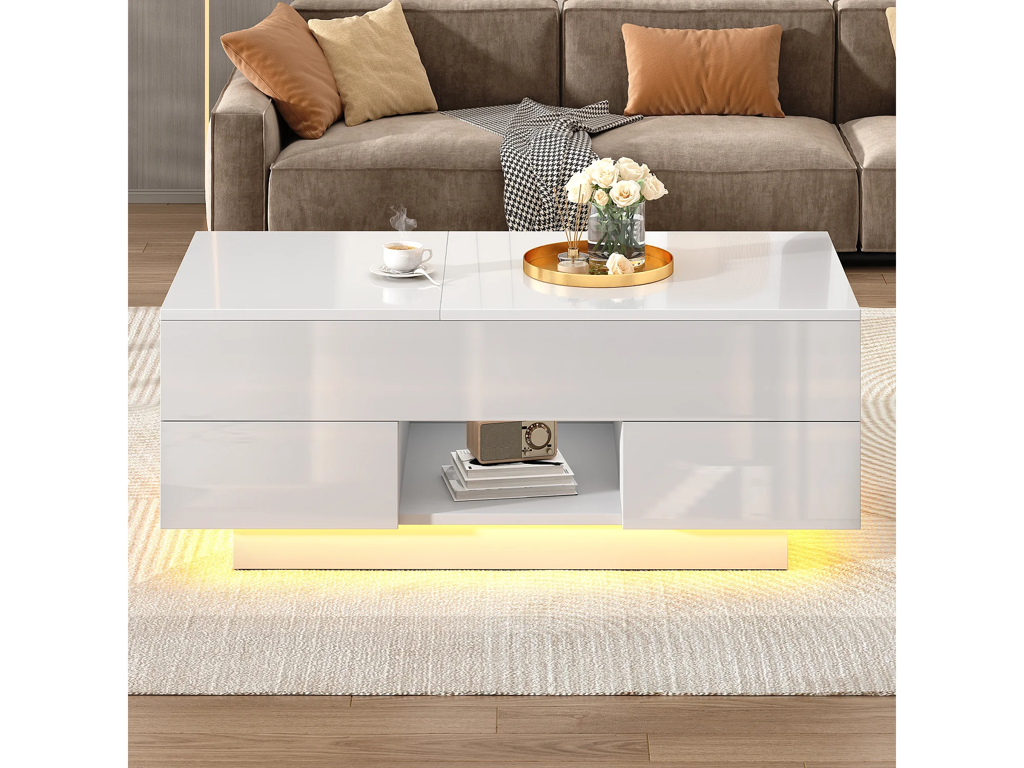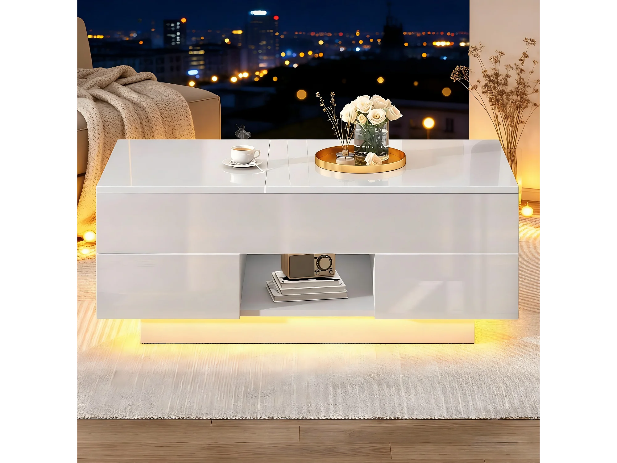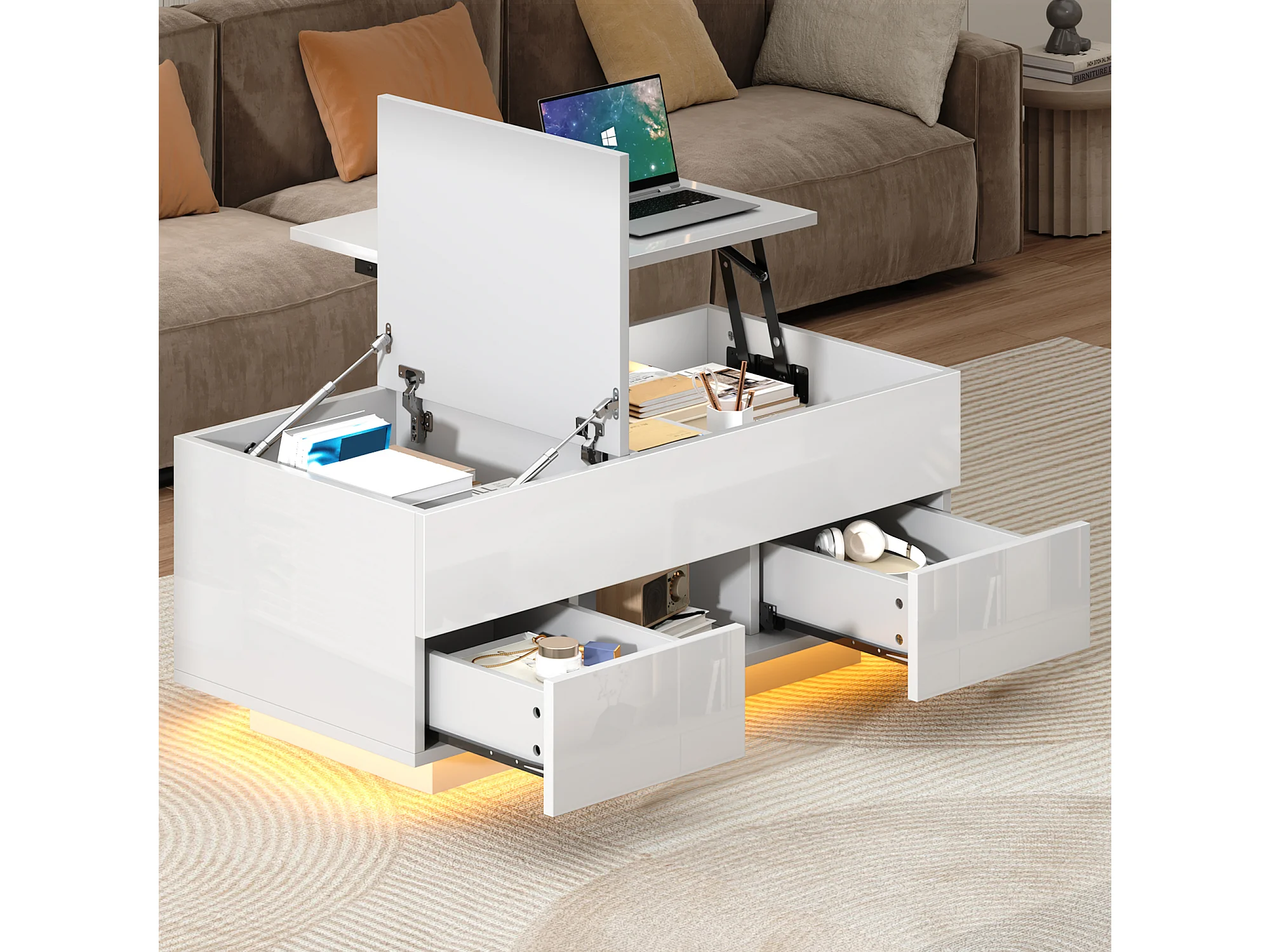 Table basse relevable laquée brillante - 100 x 45 x 43 cm - avec 2 tiroirs + Leds + rangement dissimulé - aggloméré - blanc