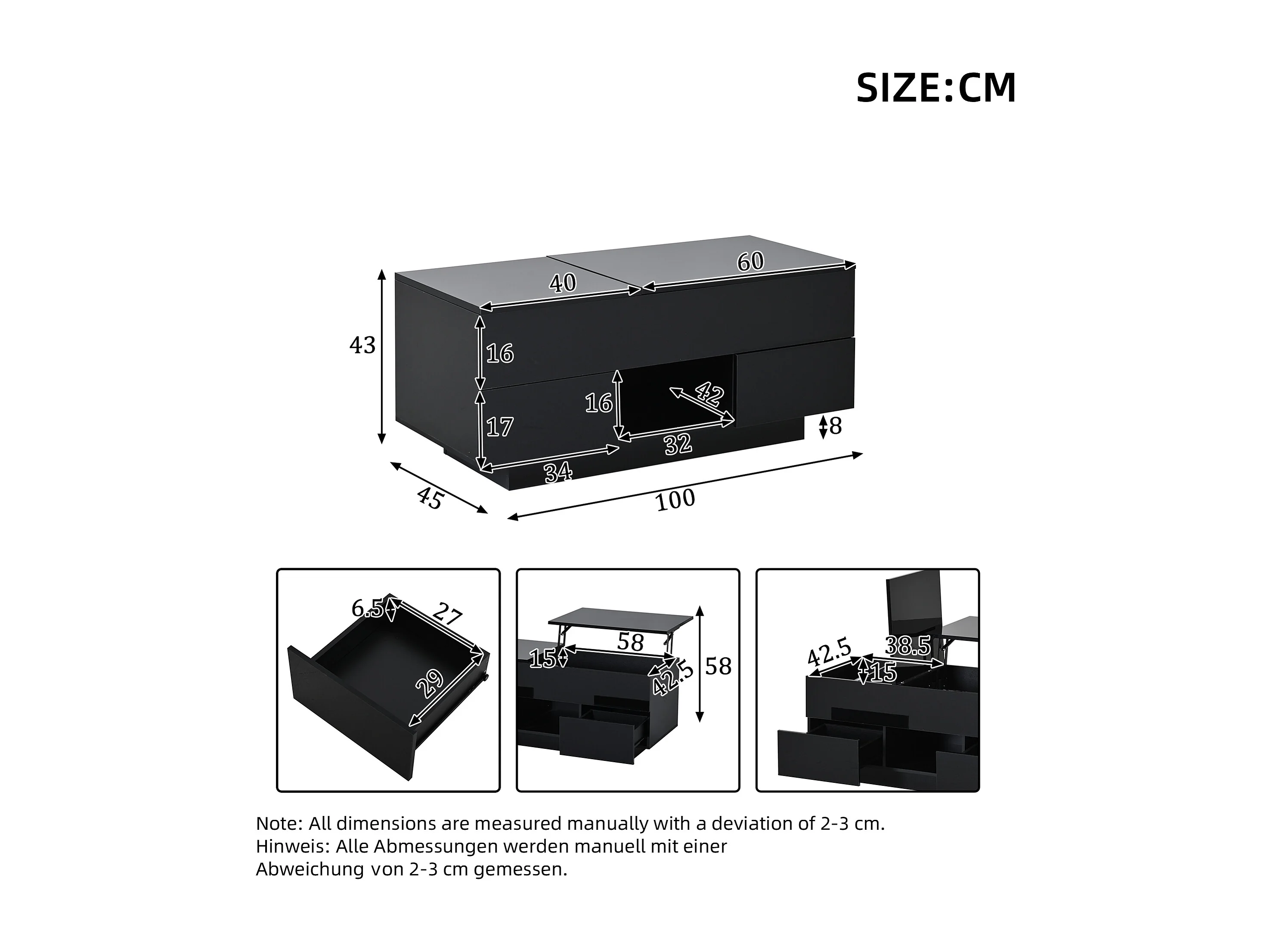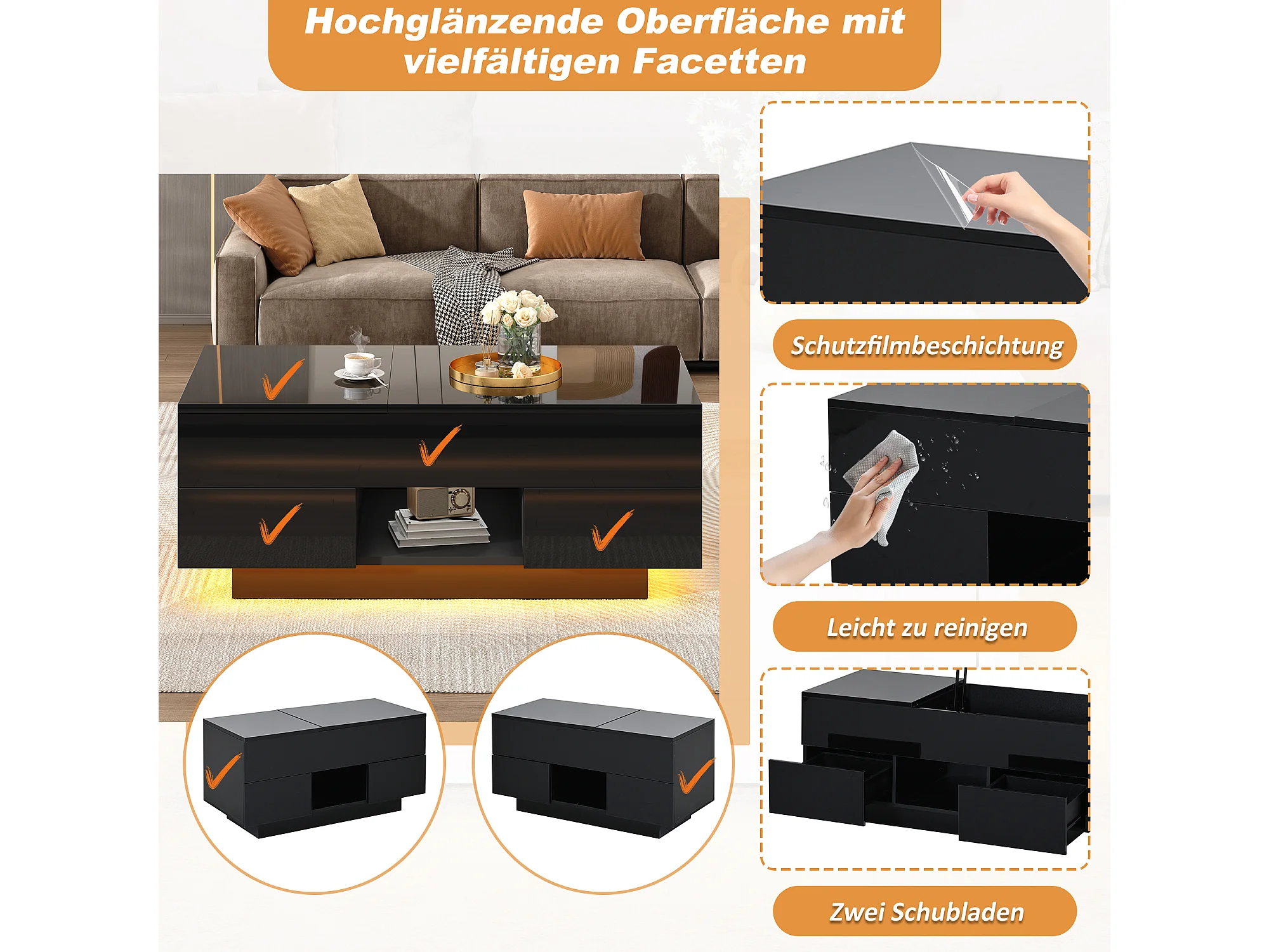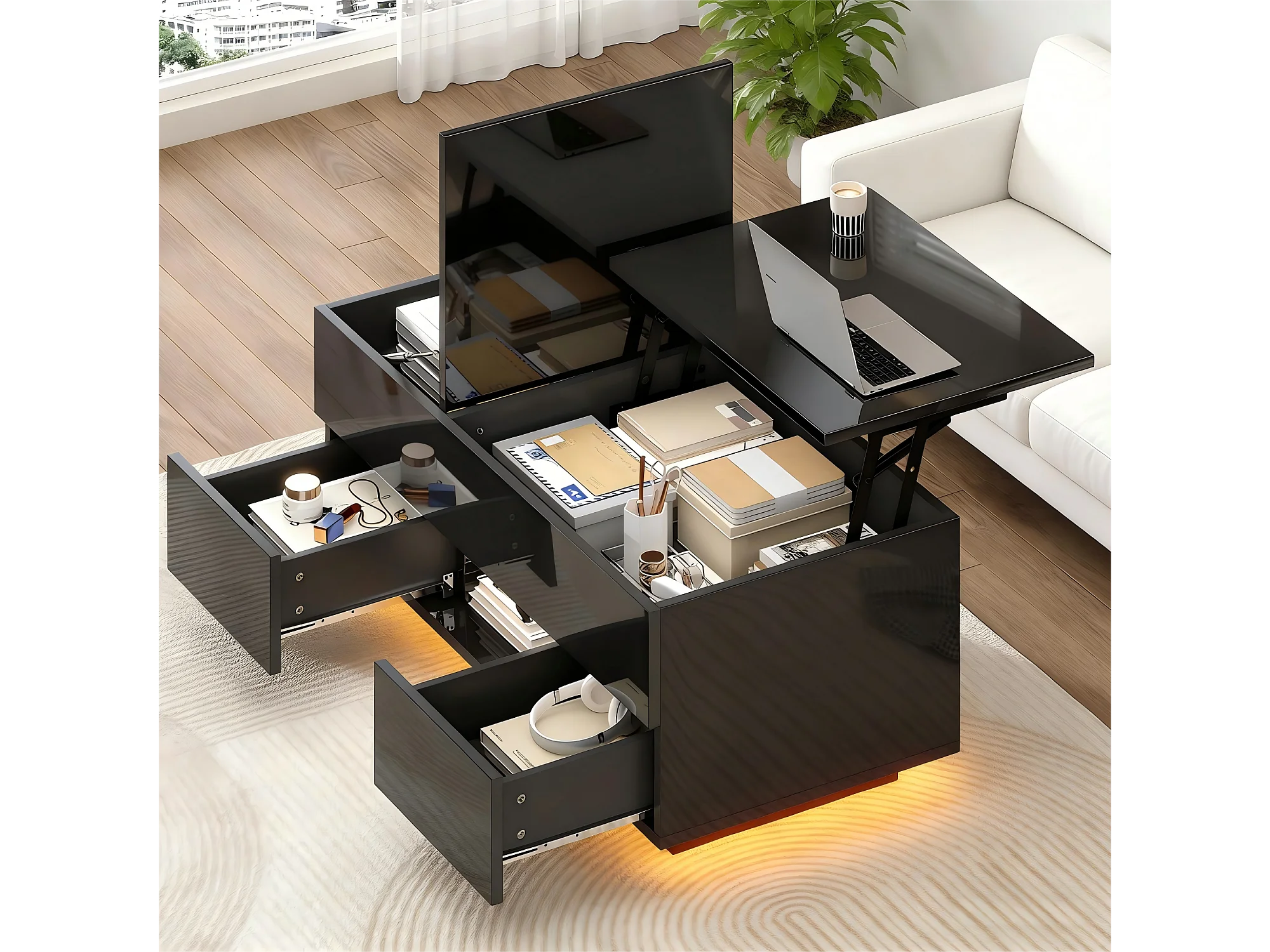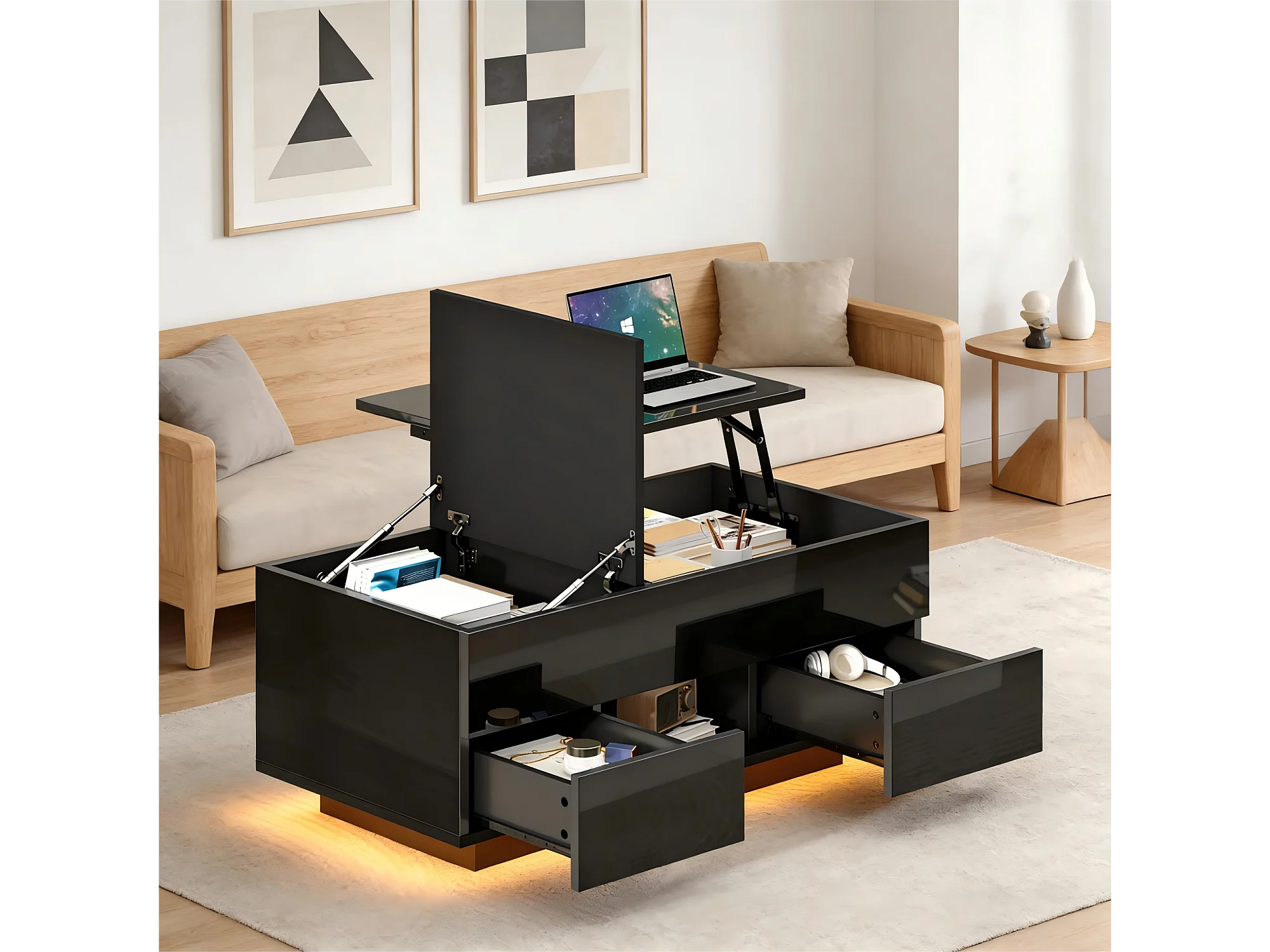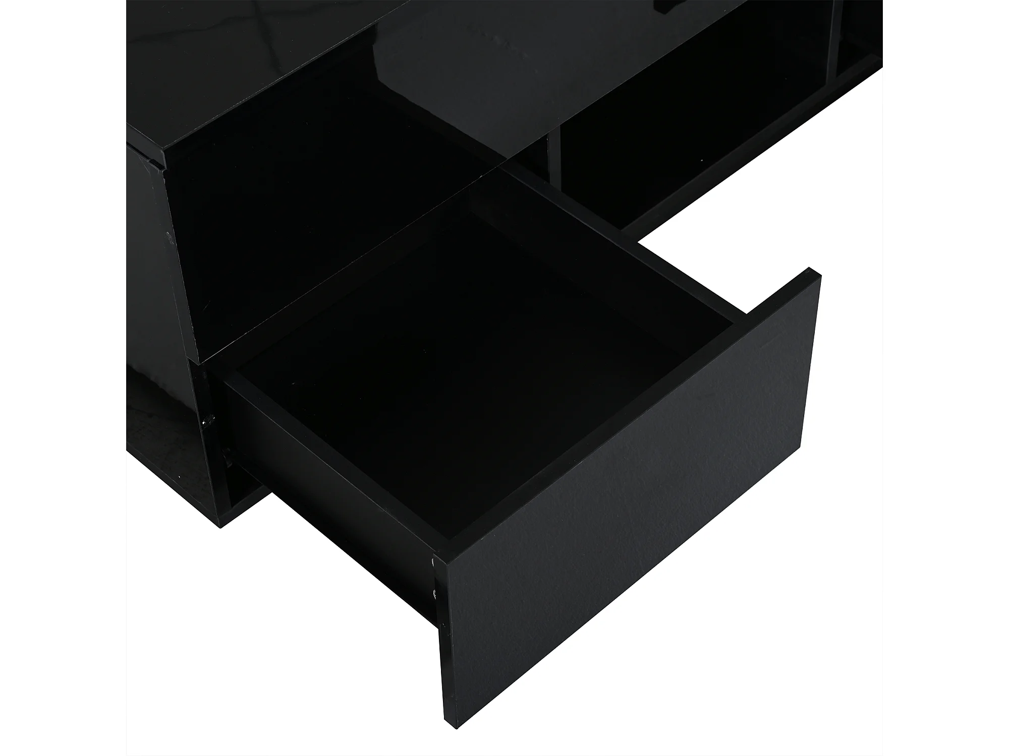 Table basse relevable laquée brillante - 100 x 45 x 43 cm - avec 2 tiroirs + Leds + rangement dissimulé - aggloméré - noir