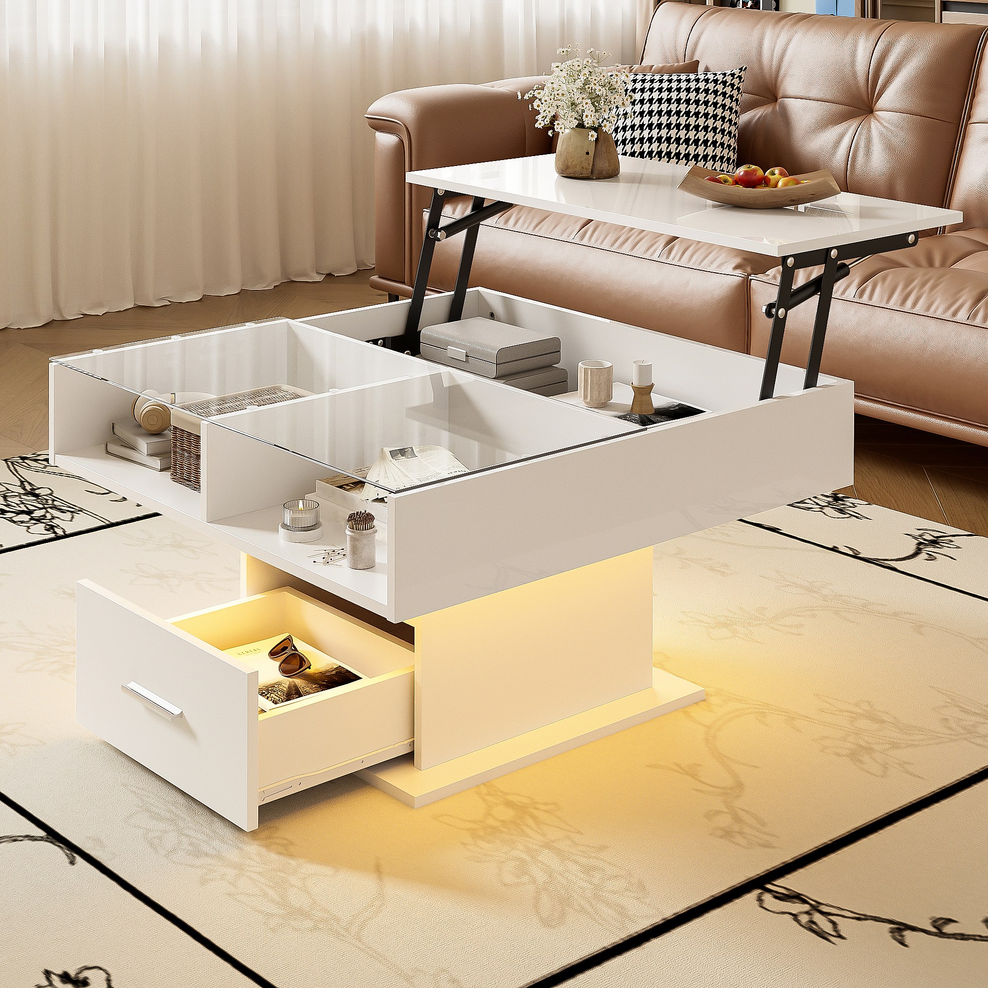 Table basse relevable multifonction brillante avec LED, hauteur réglable et rangement flexible, design moderne salon et bureau