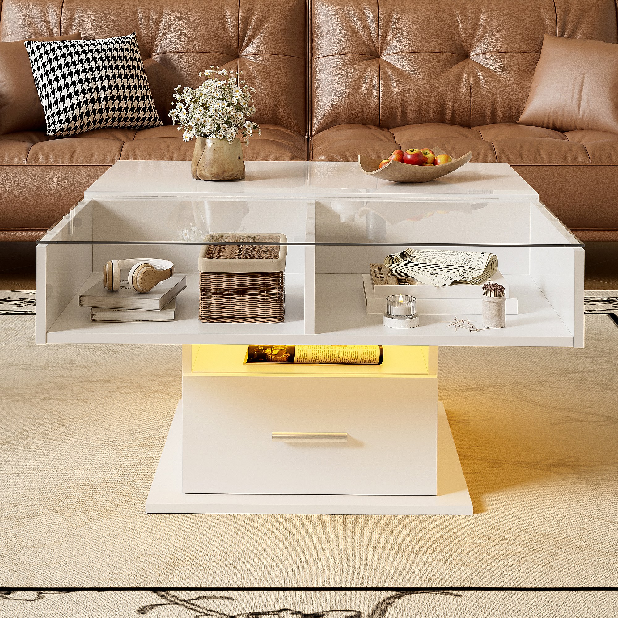 Table basse relevable - 80 x 80 x 45 cm - avec rangement dissimulé + 2 tiroirs + Leds - aggloméré + verre trempé - blanc
