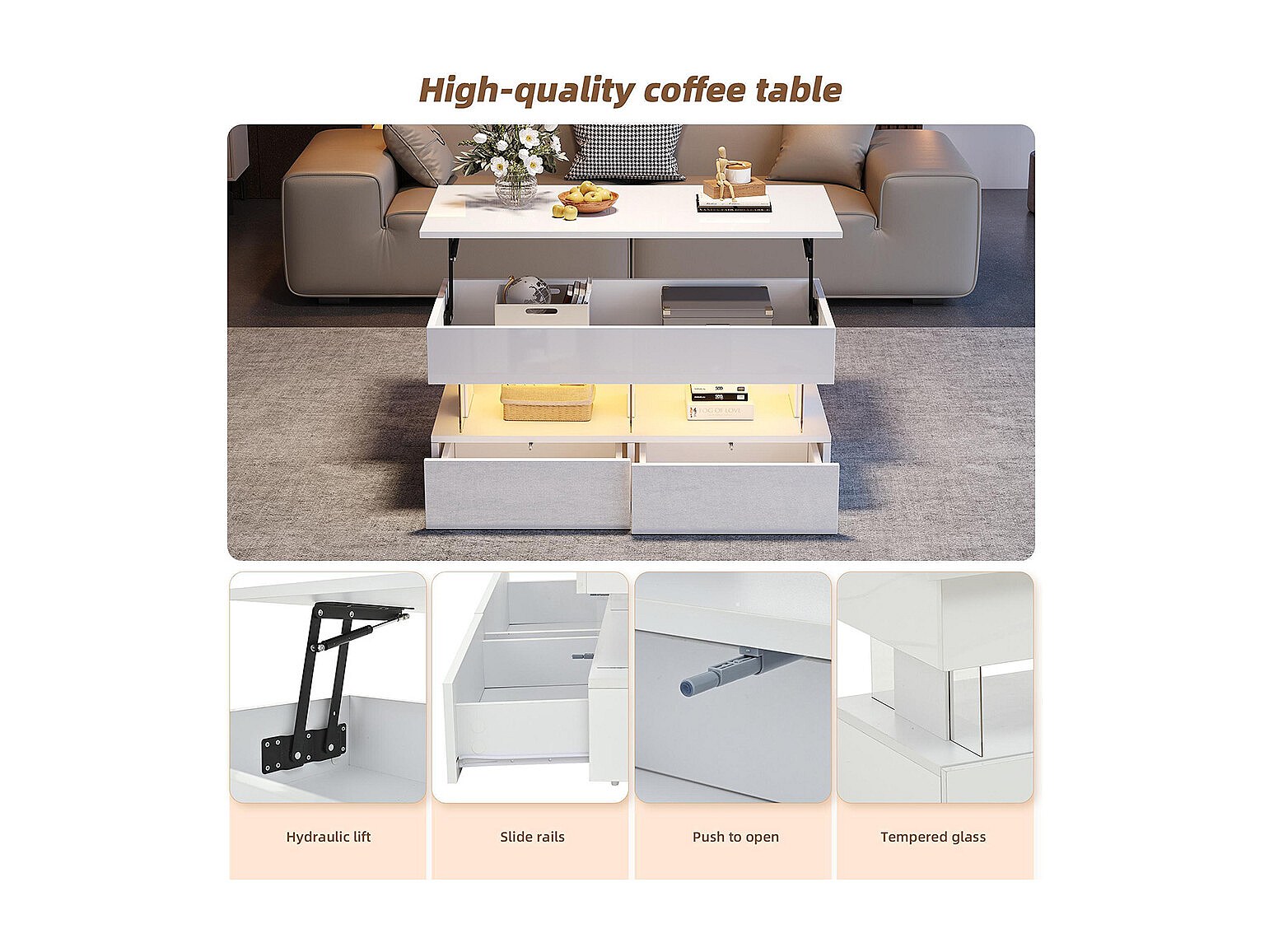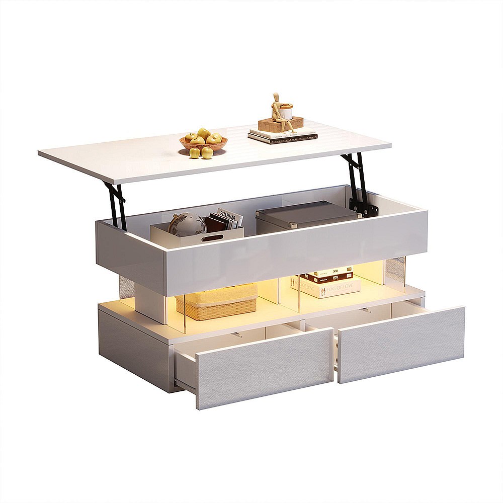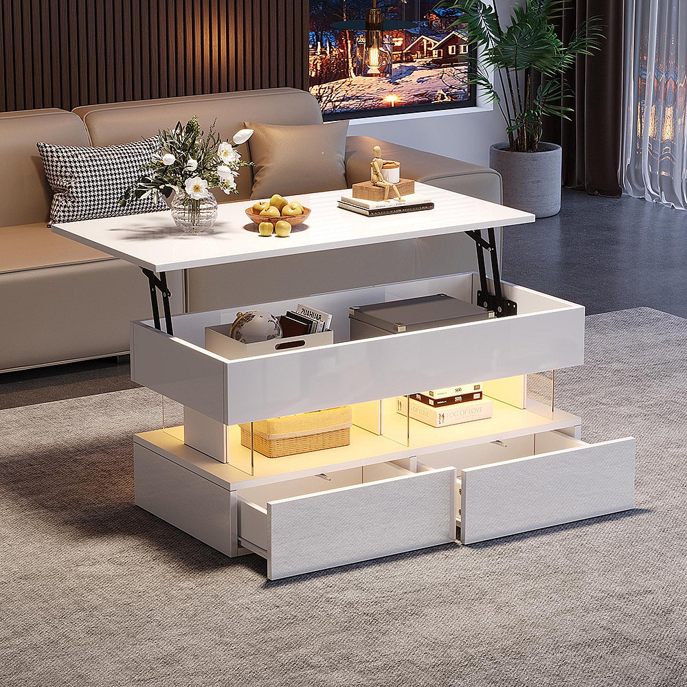 Table basse relevable avec rangement intelligent et LED, suface laqué blanc