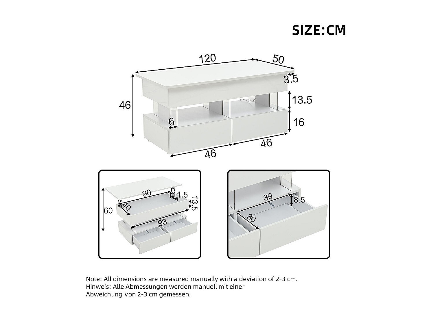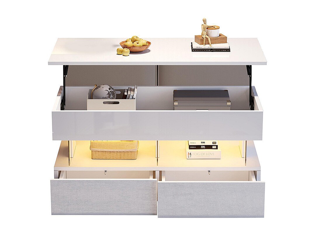 Table basse relevable 90x55x41-54cm avec 4 tiroirs, corps en blanc laqué, LED inclus