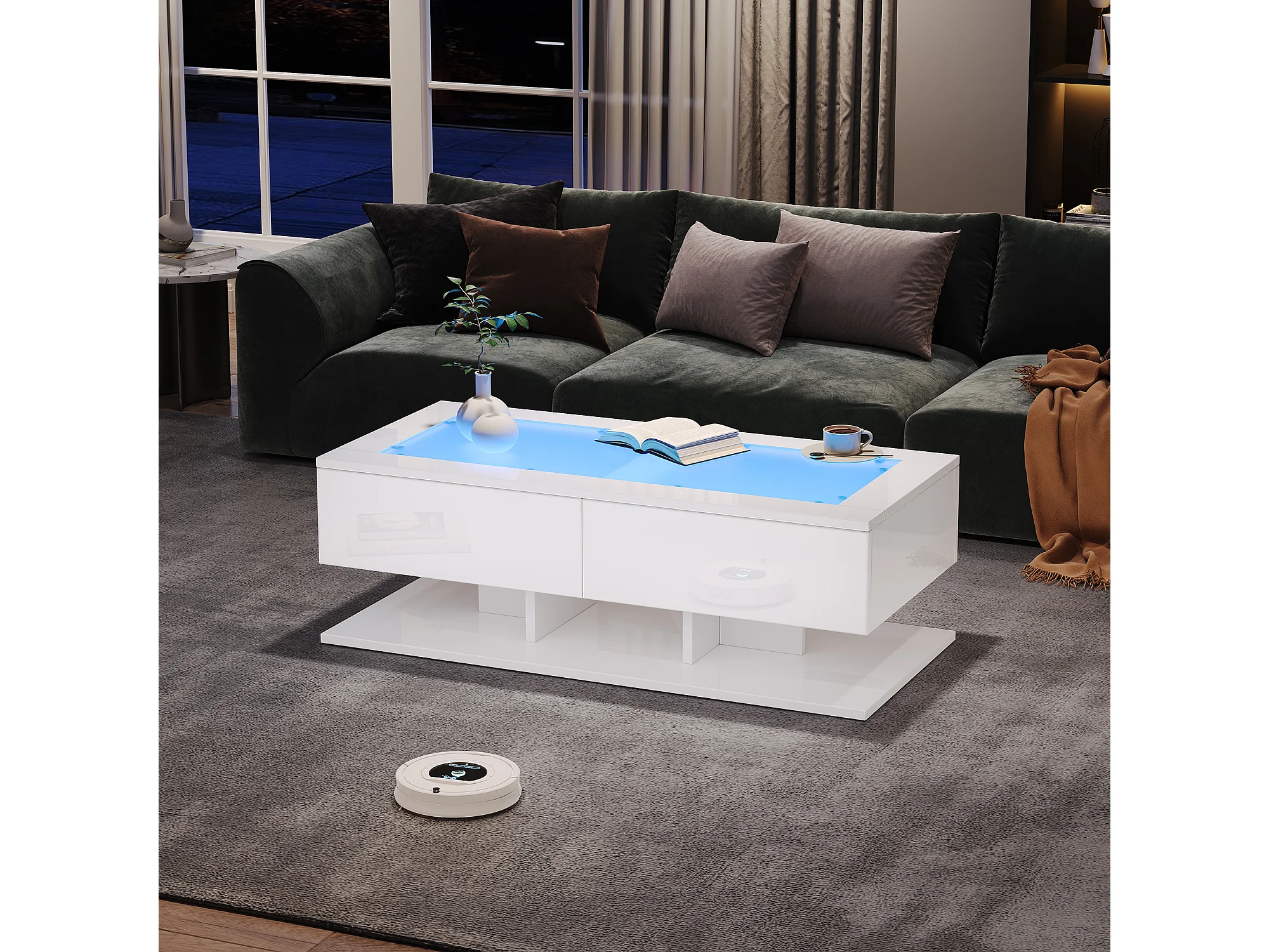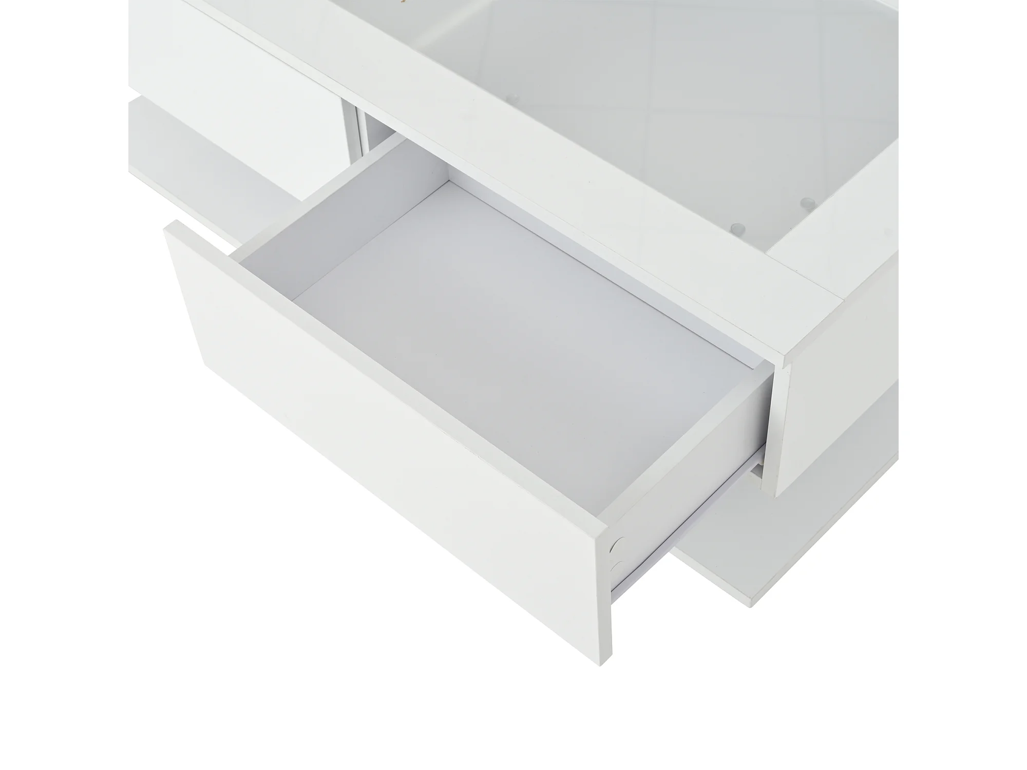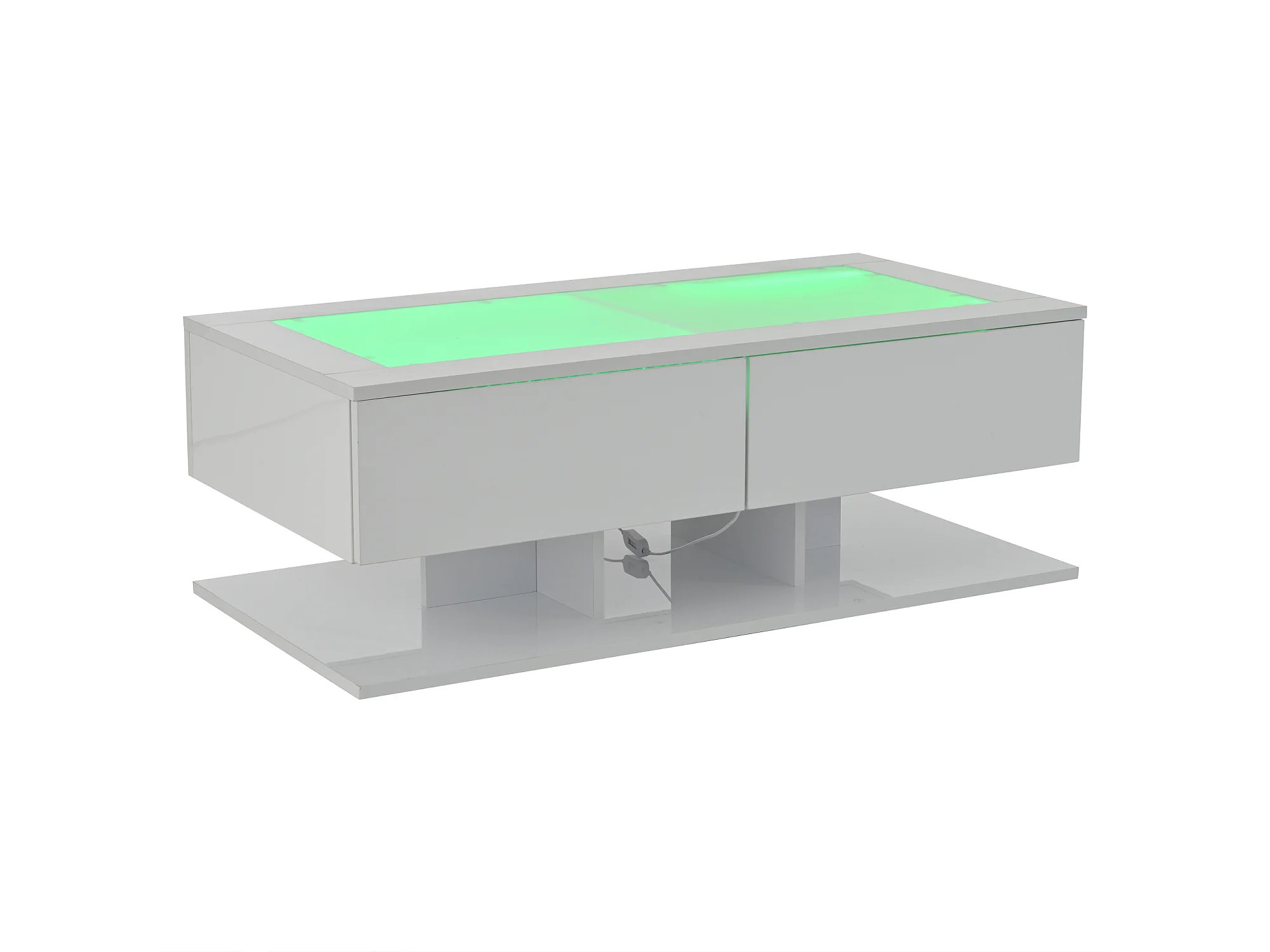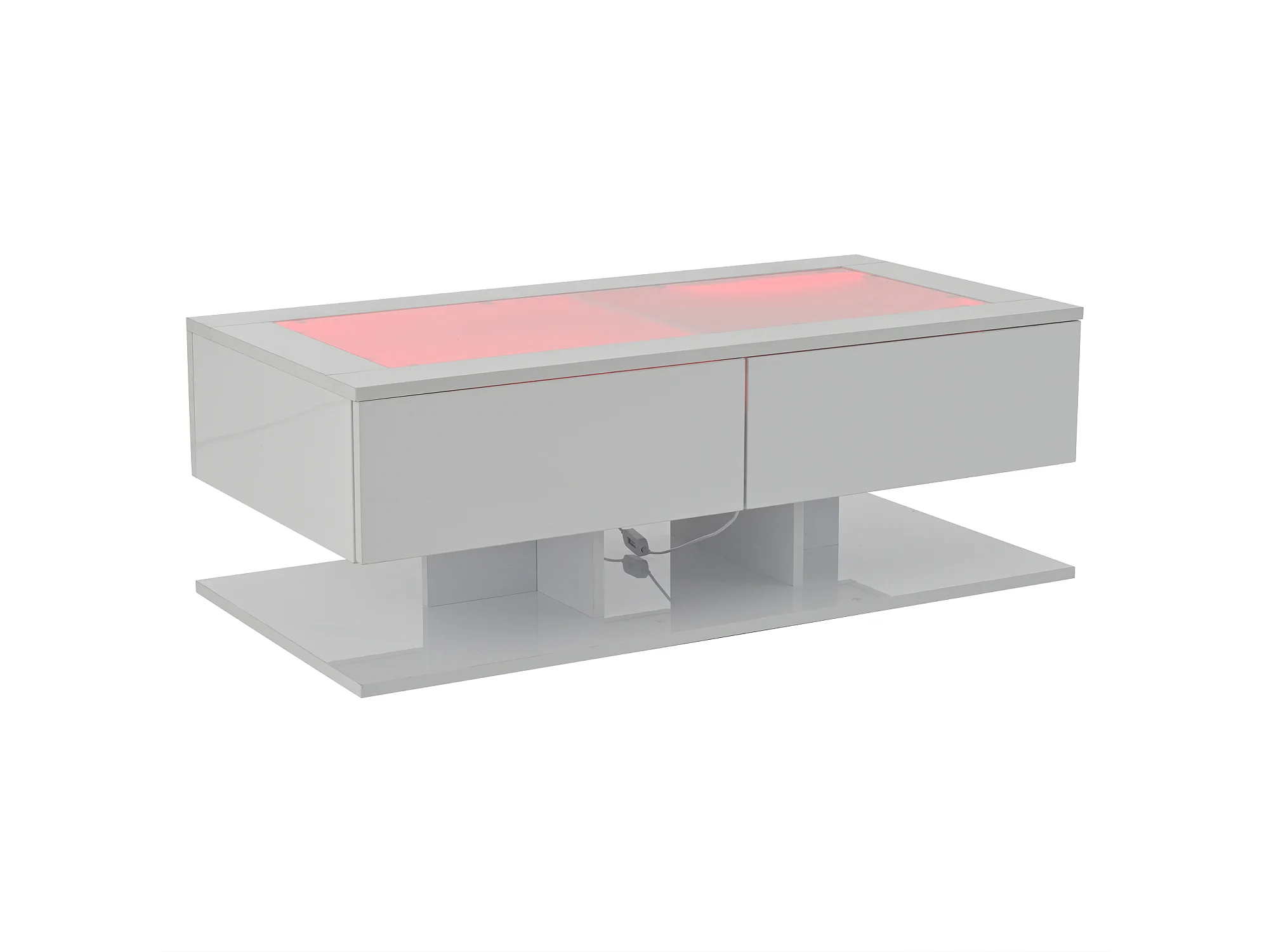 Table basse 100x50x35cm avec LED et tiroir plateau de table en verre en blanc pour salon