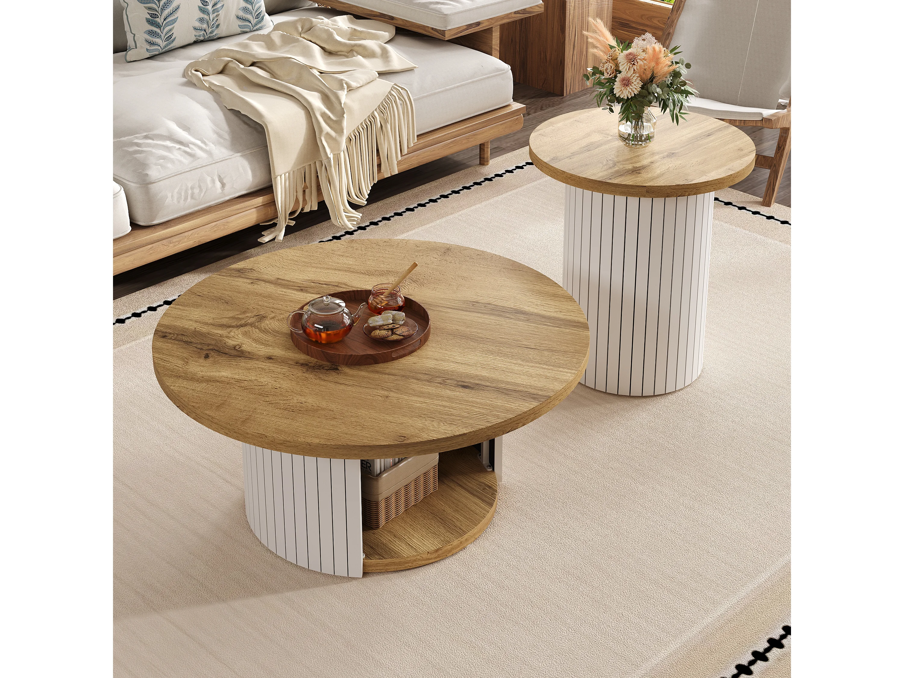 Table basse rond avec rangement - Lot de 2 - Rayures verticales blanches -Couleur bois
