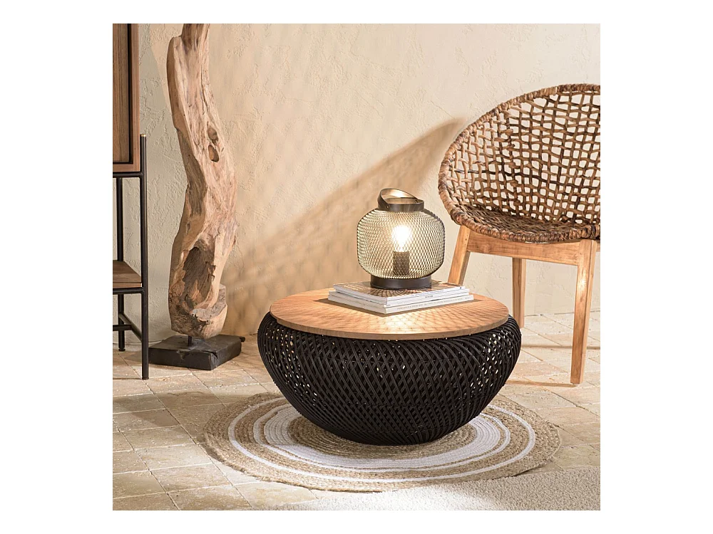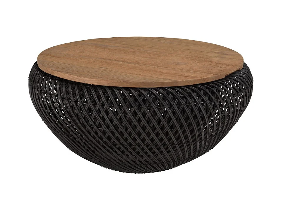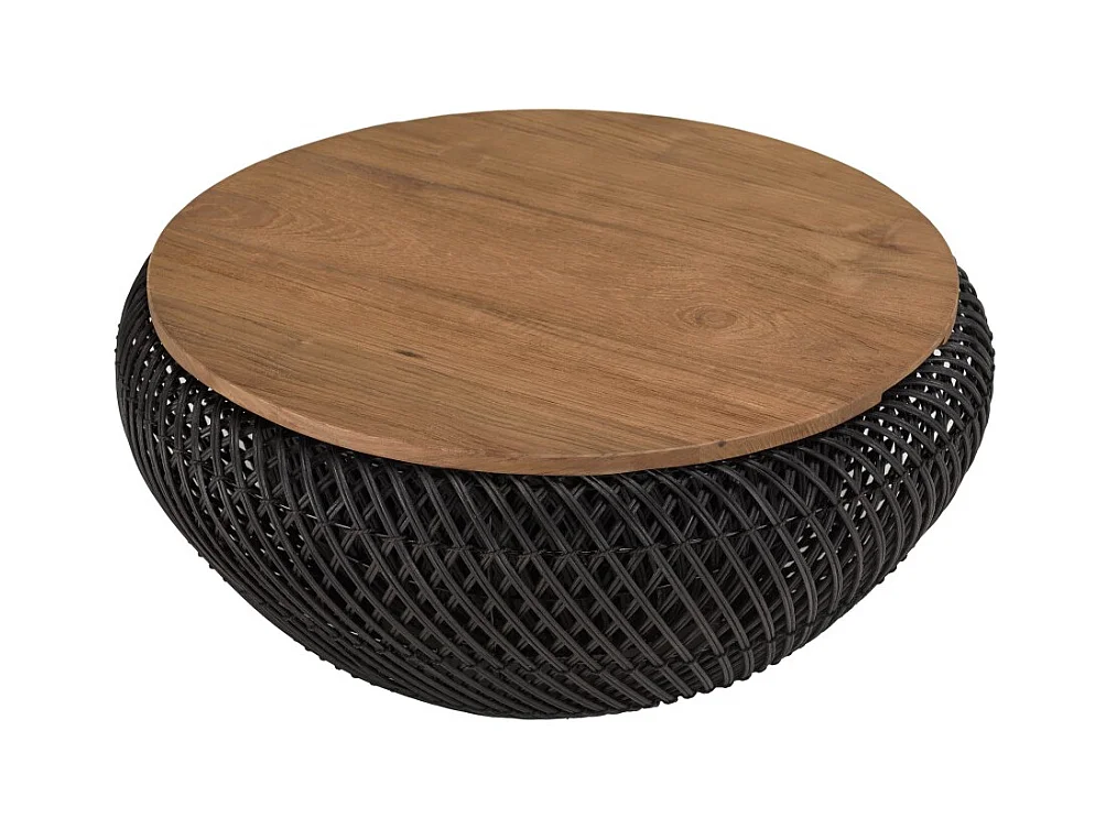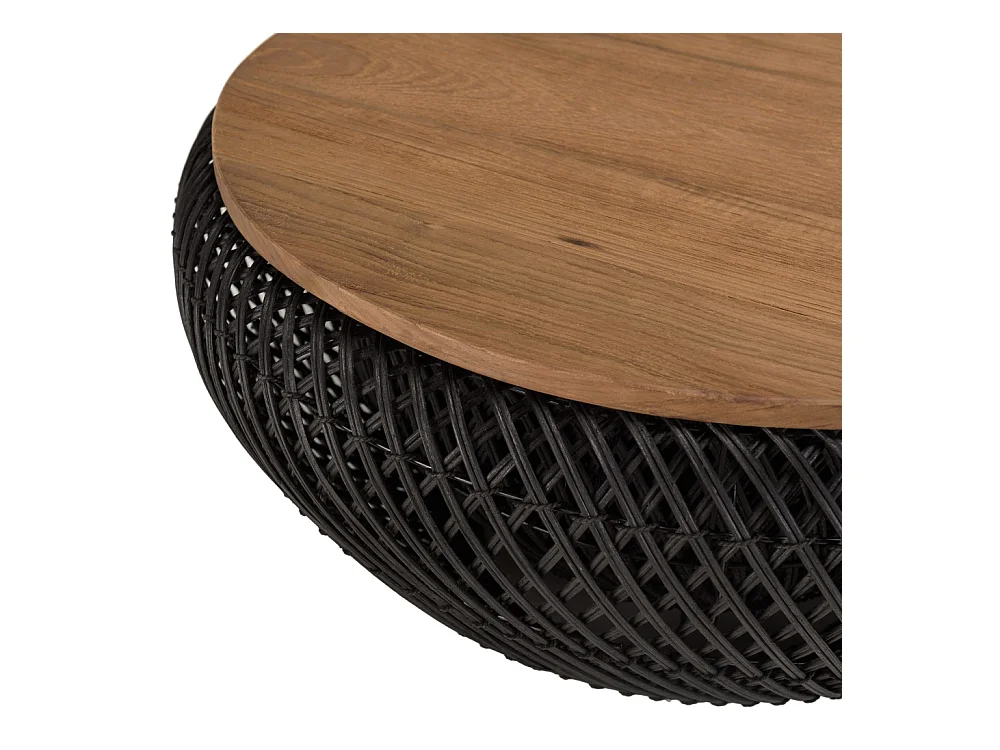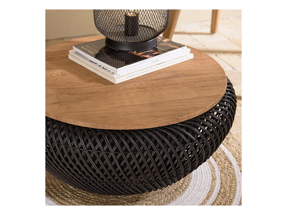 SIXTINE - Table basse ronde diam65 plateau bois teck recyclé rotin noir