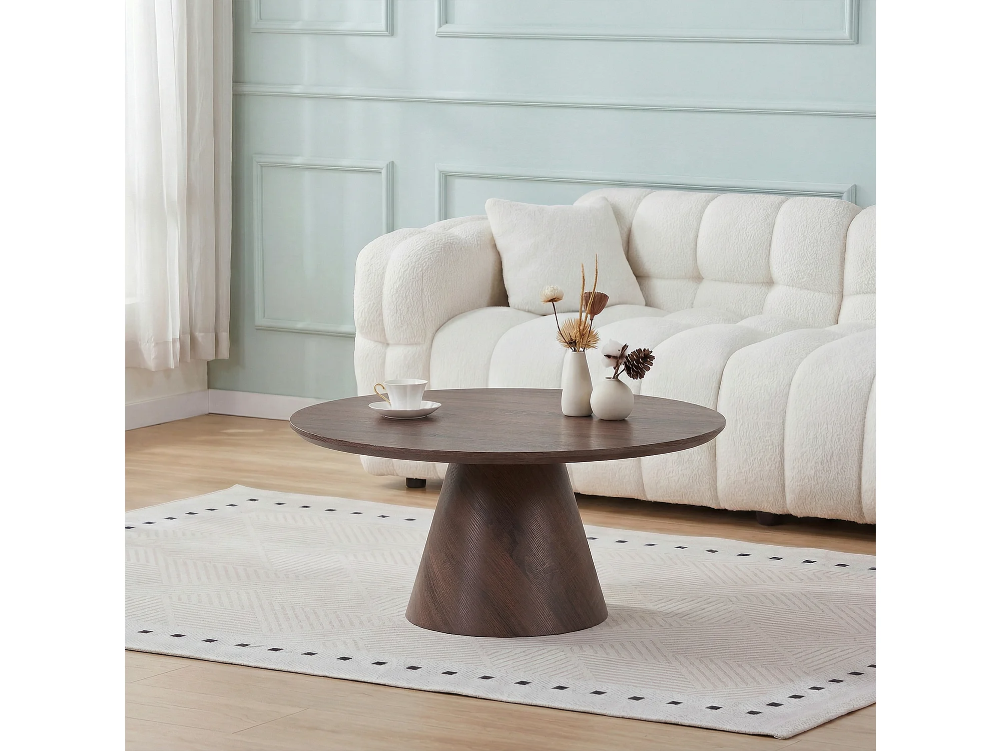 Table basse ronde 80cm - Effet noyer foncé - Pied central conique - MANON