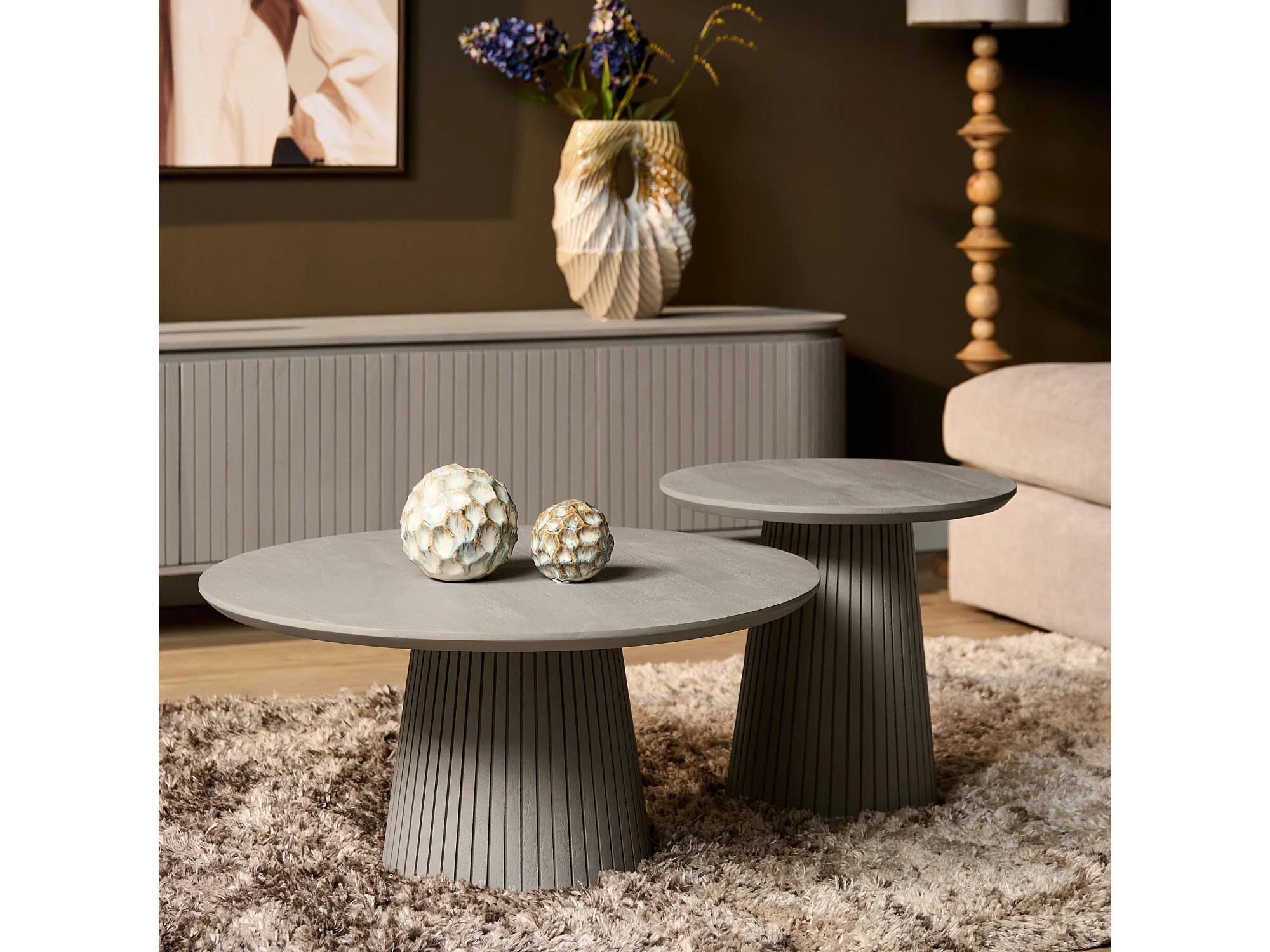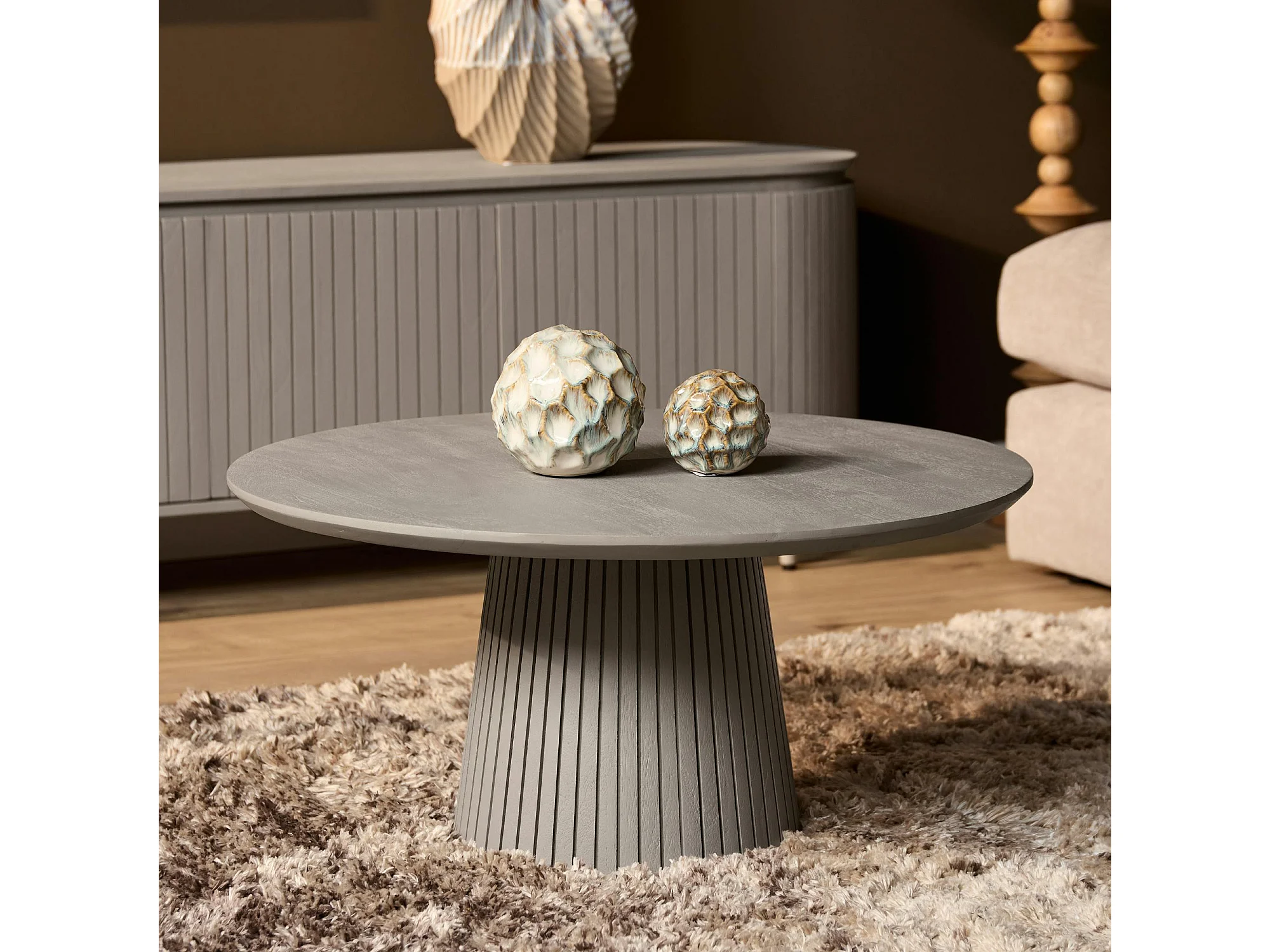 Table basse ronde bois gris à pied rainuré CALERO