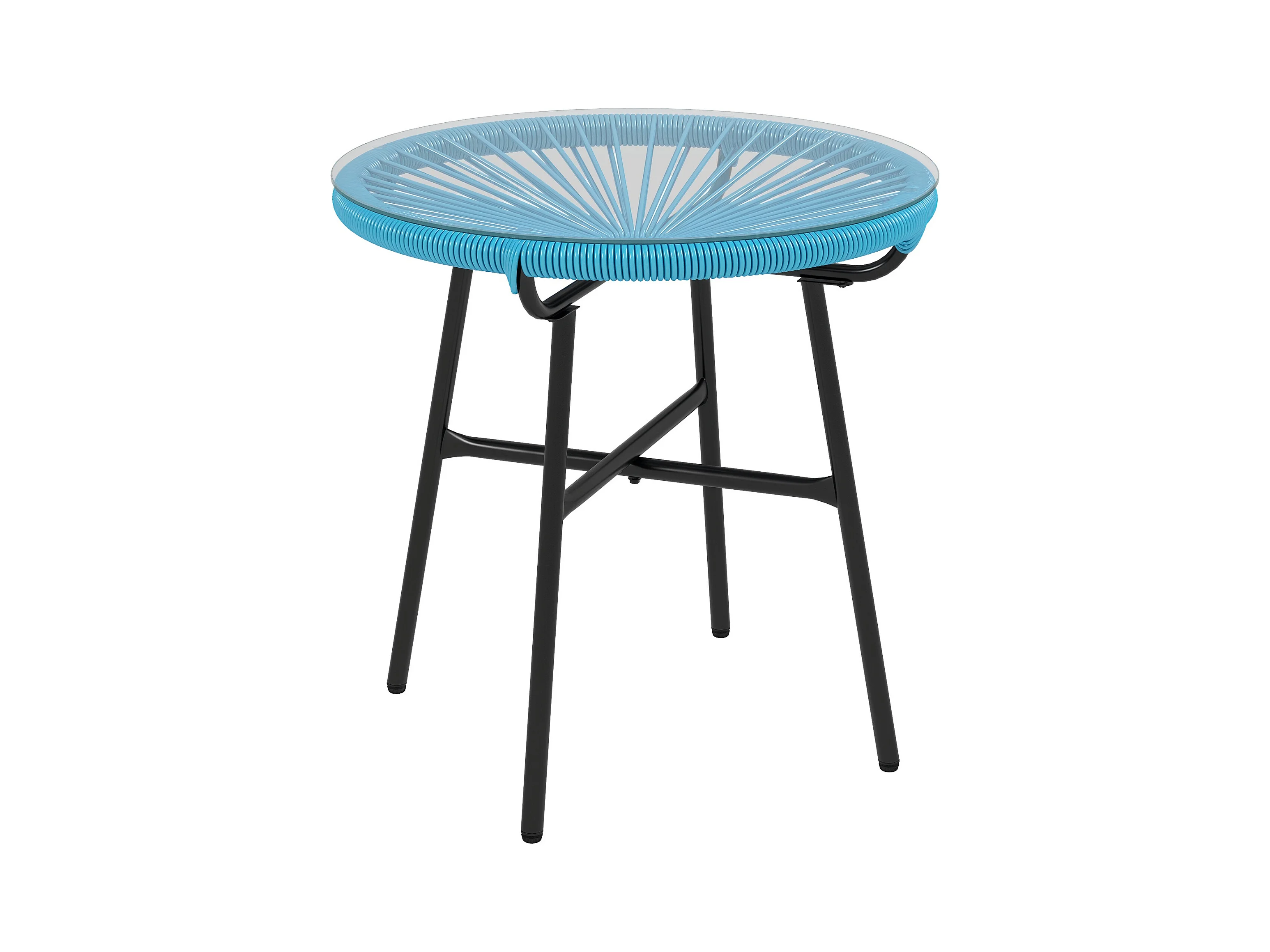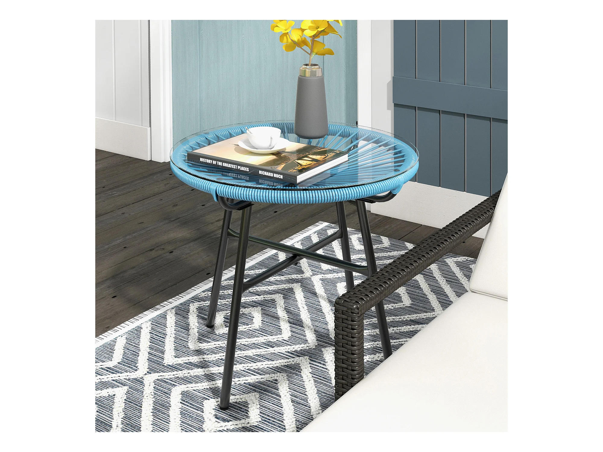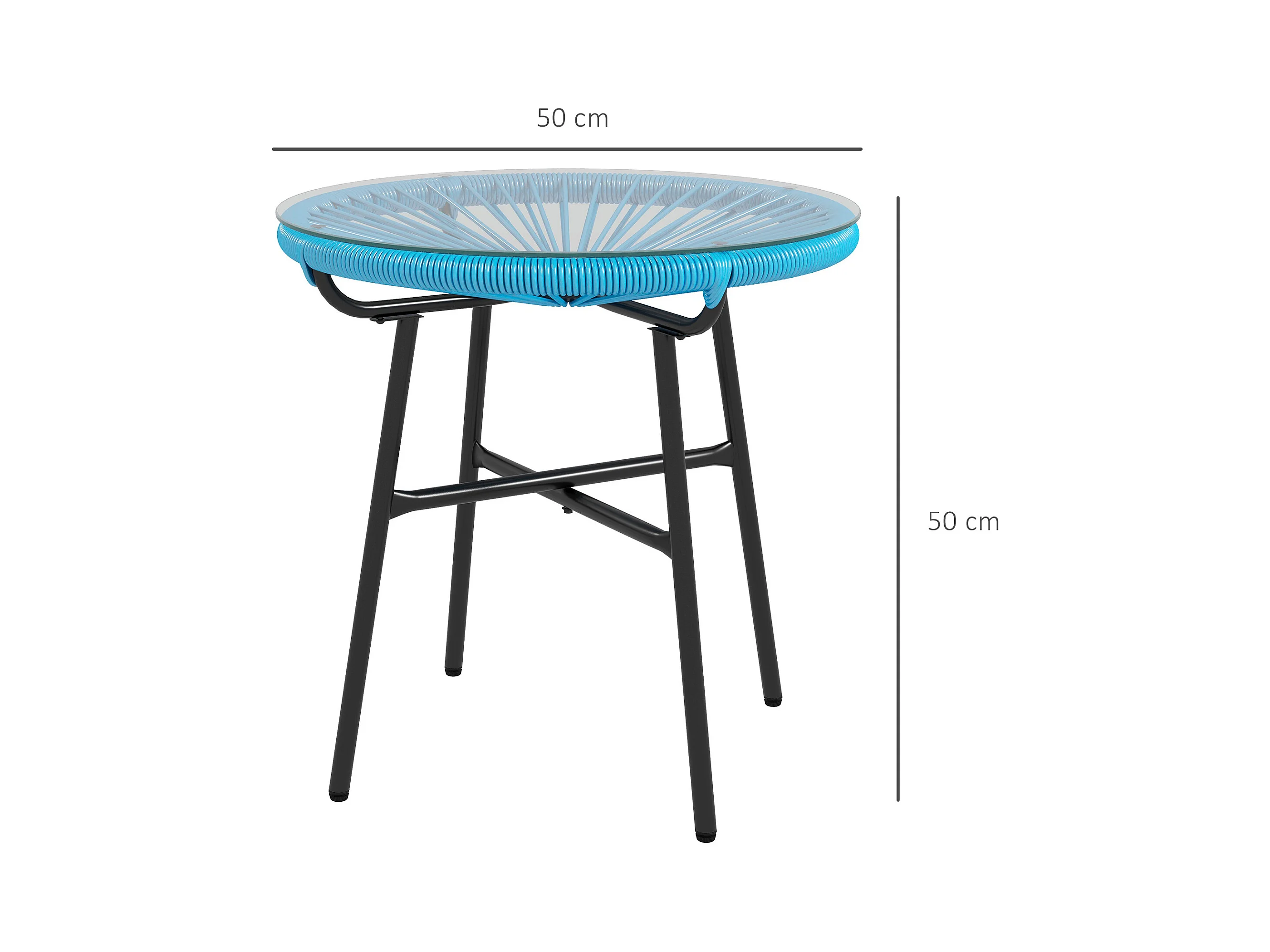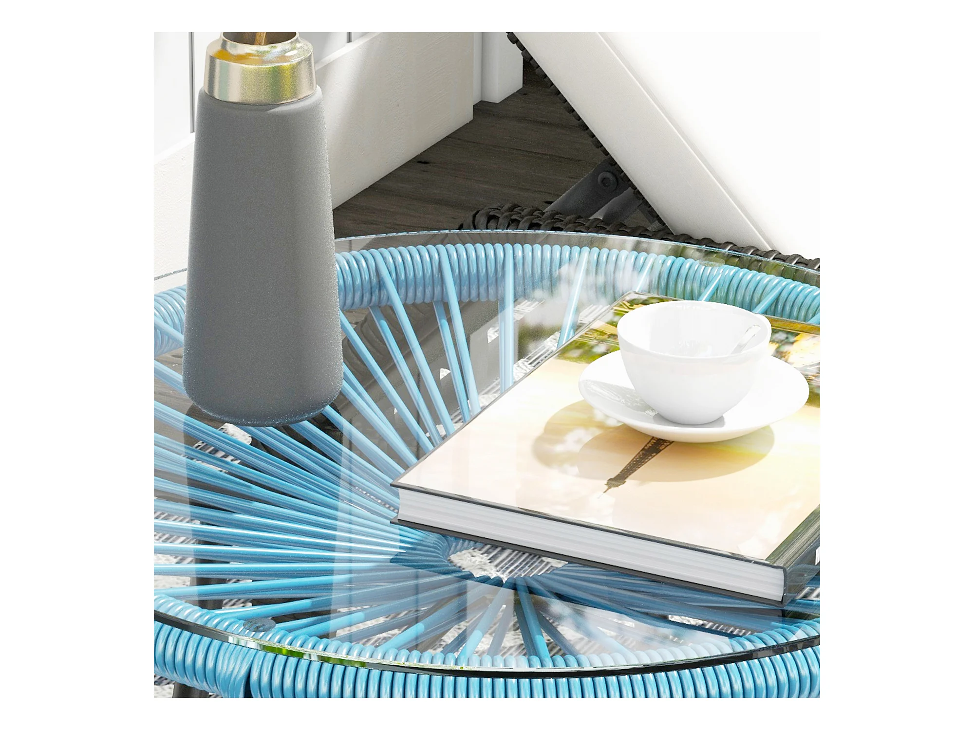 Table basse ronde de jardin en résine aspect rotin métal et plateau verre trempé Ø 50 x 50H cm bleu