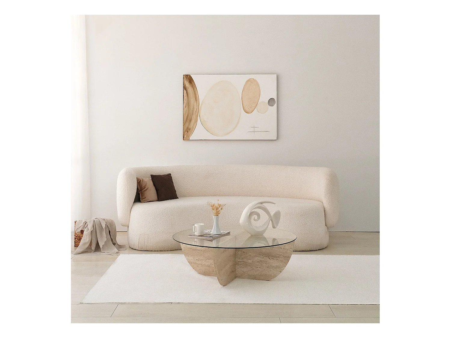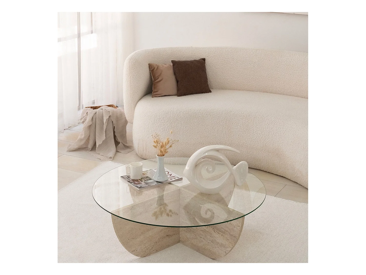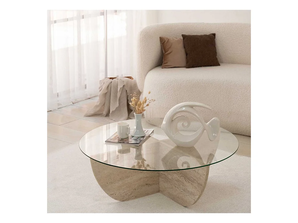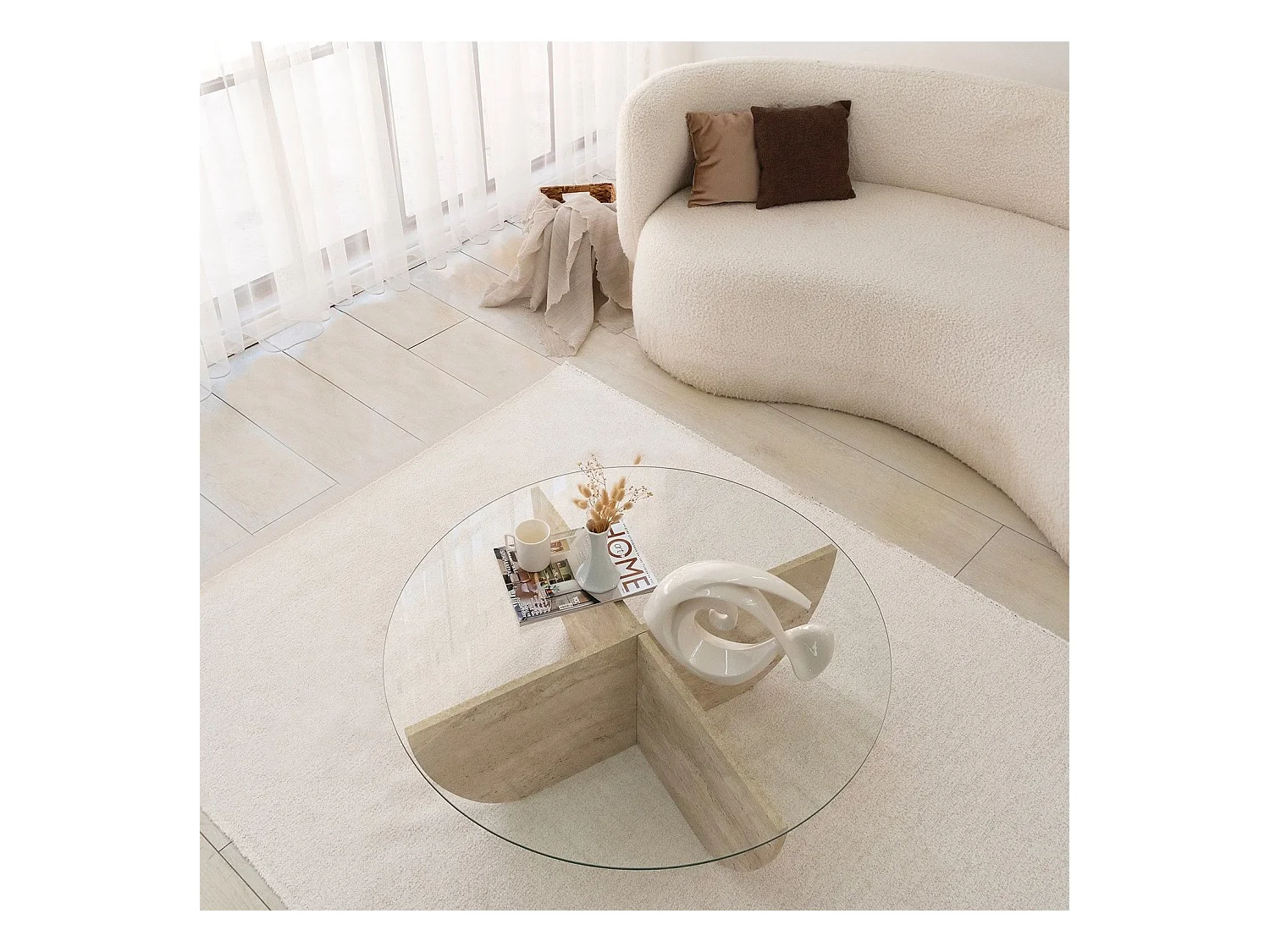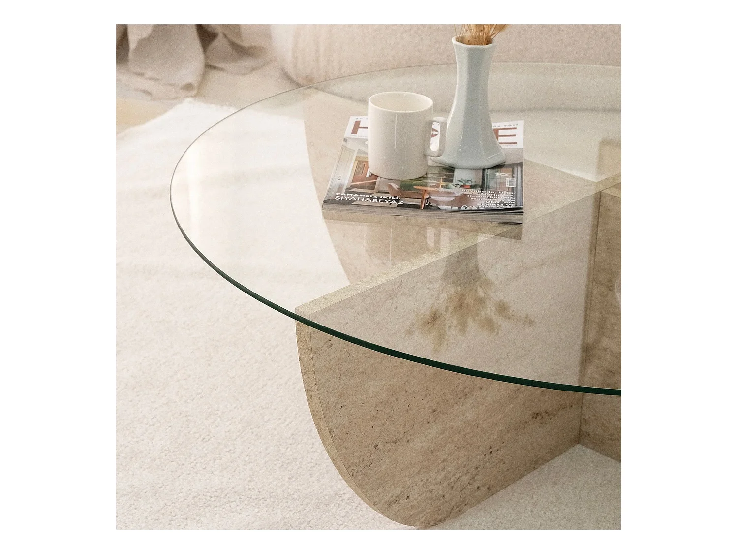 Table basse ronde design Luxy D90cm Verre Transparent et Effet travertin Beige