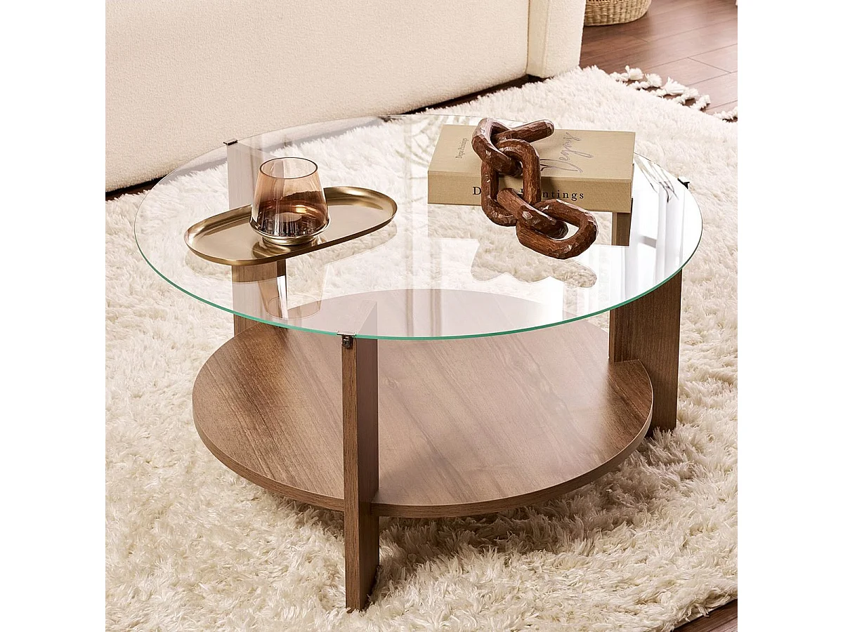 Table basse ronde effet Noyer et verre Ø75 cm - Eolia