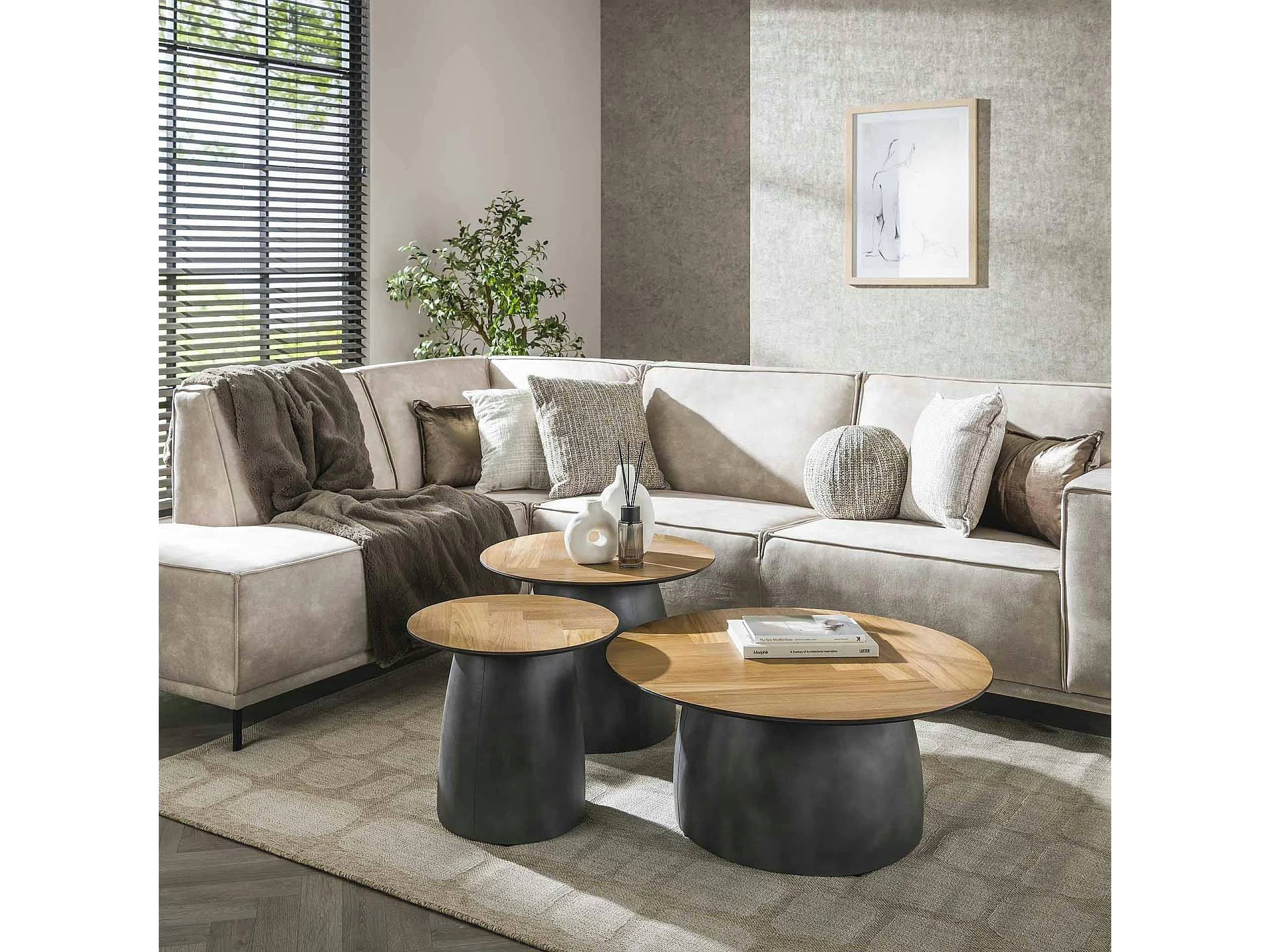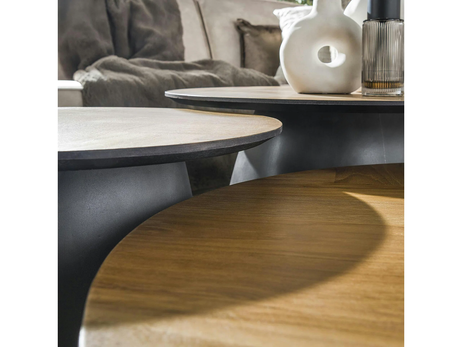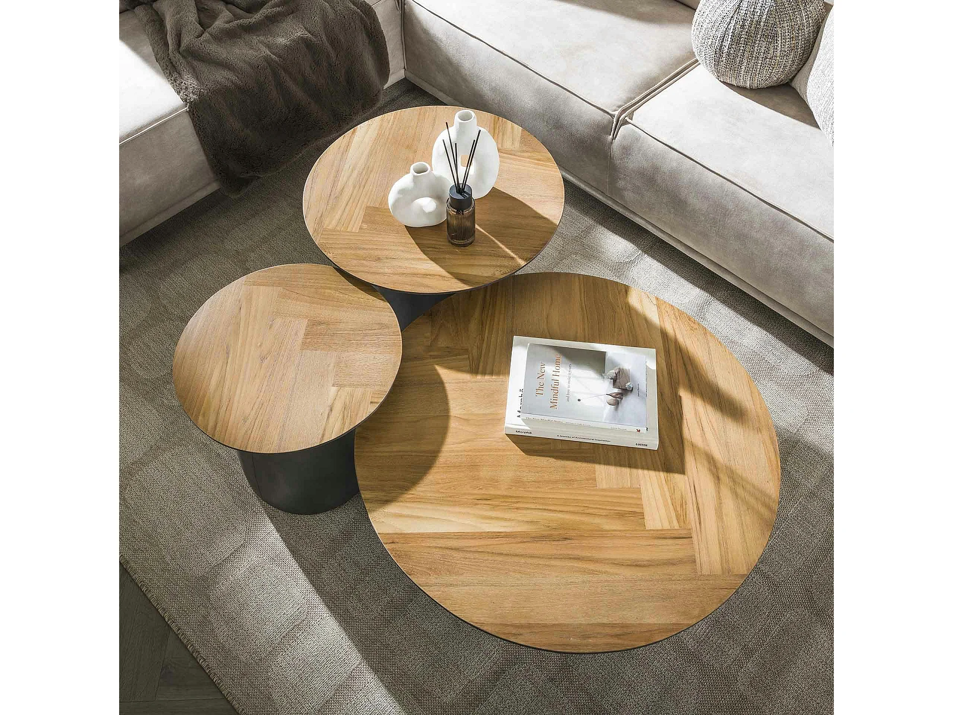 Table basse ronde en bois de teck et métal motif chevron (lot de 3) MAYA