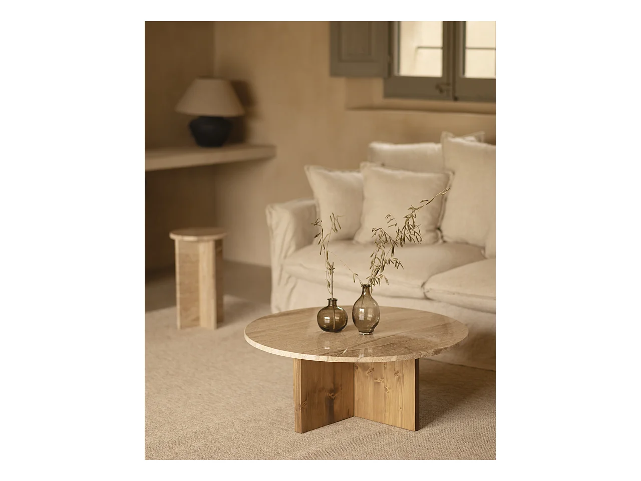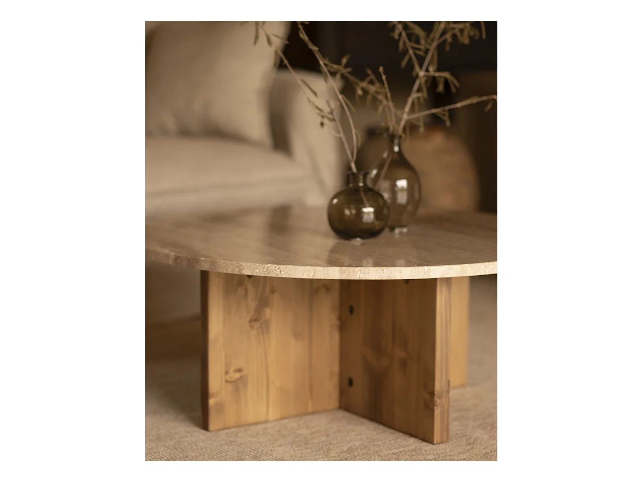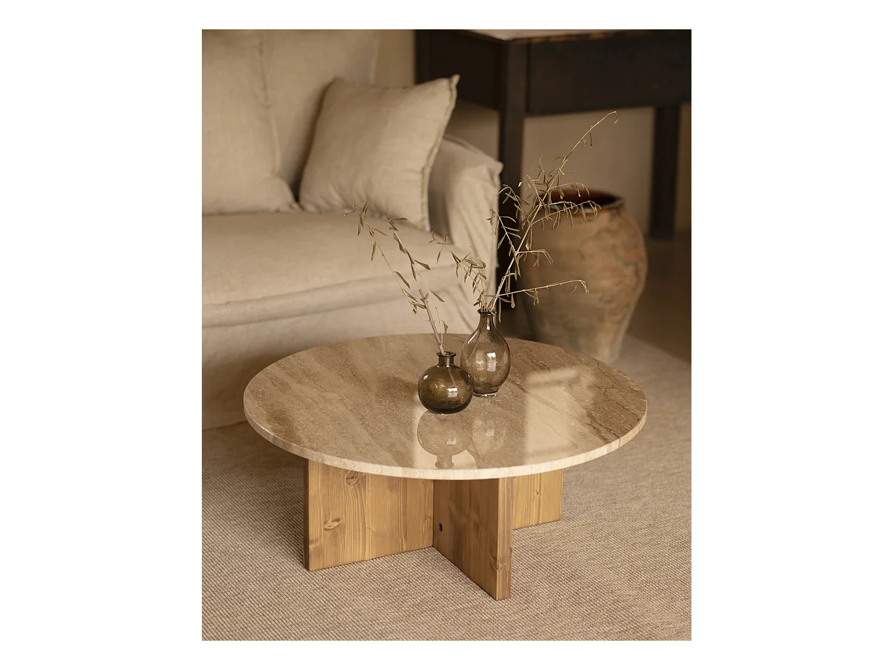Table basse ronde en marbre daino reale avec pieds en bois massif Ø60cm - TOSCANA - DECOWOOD