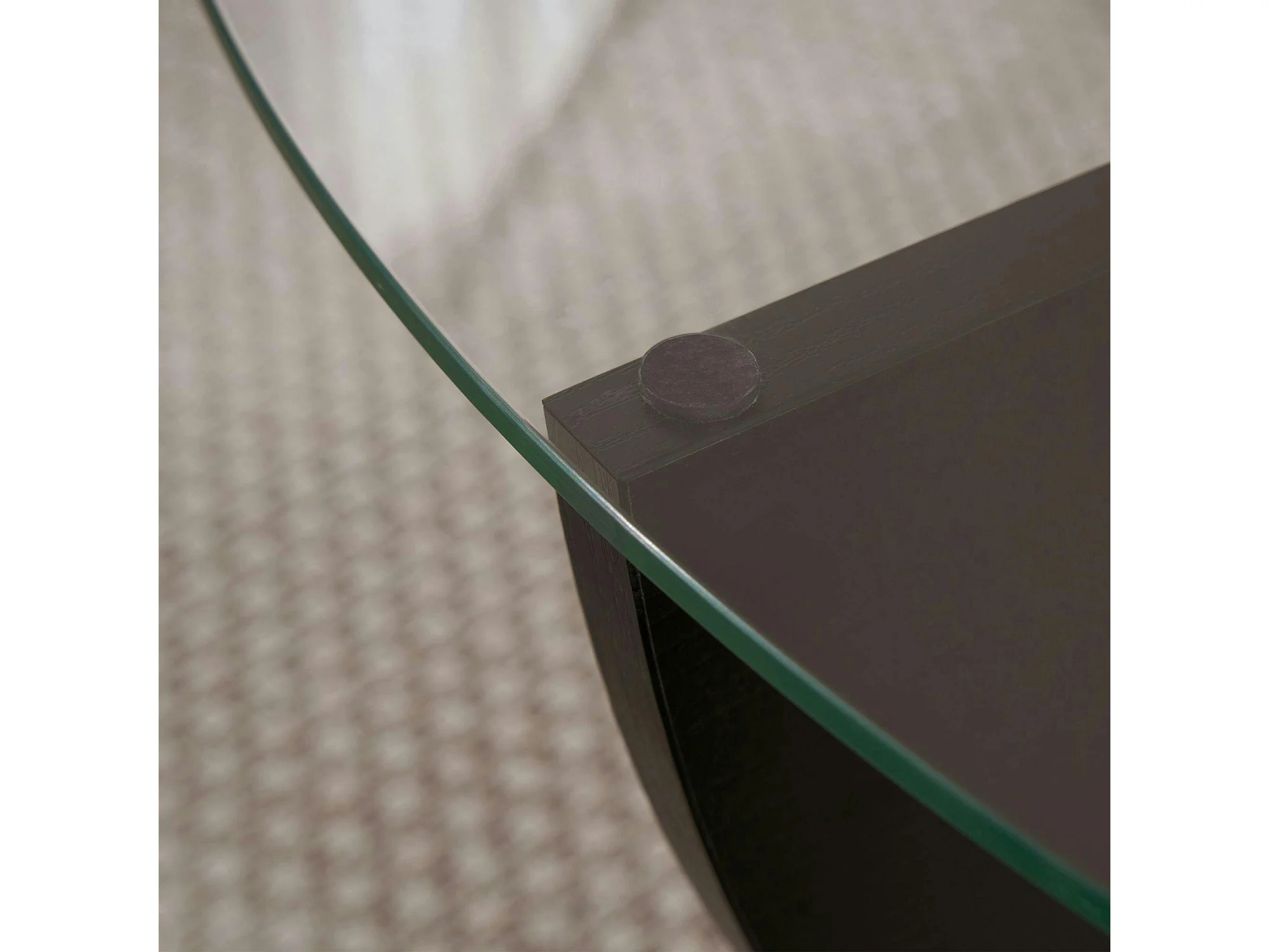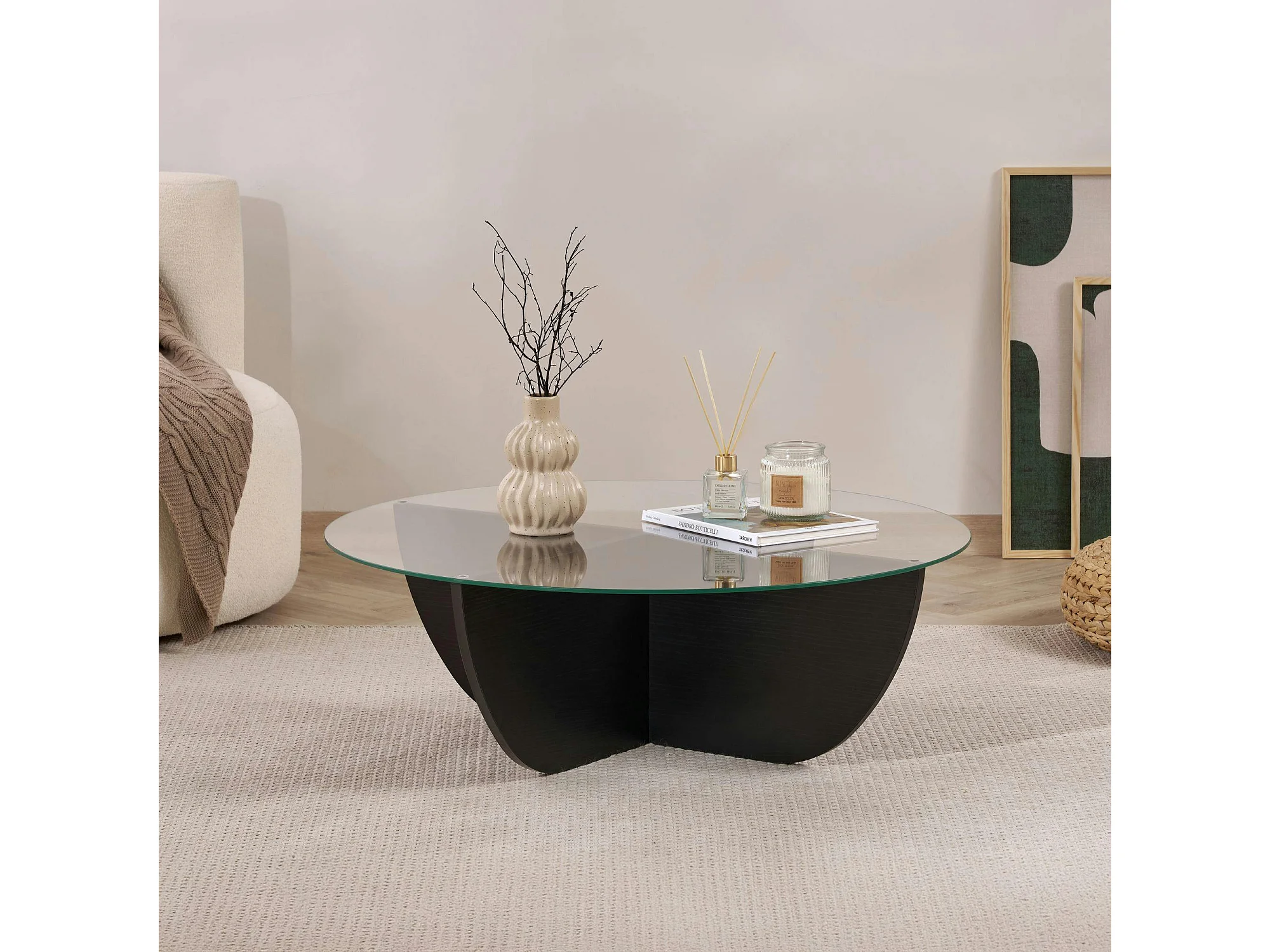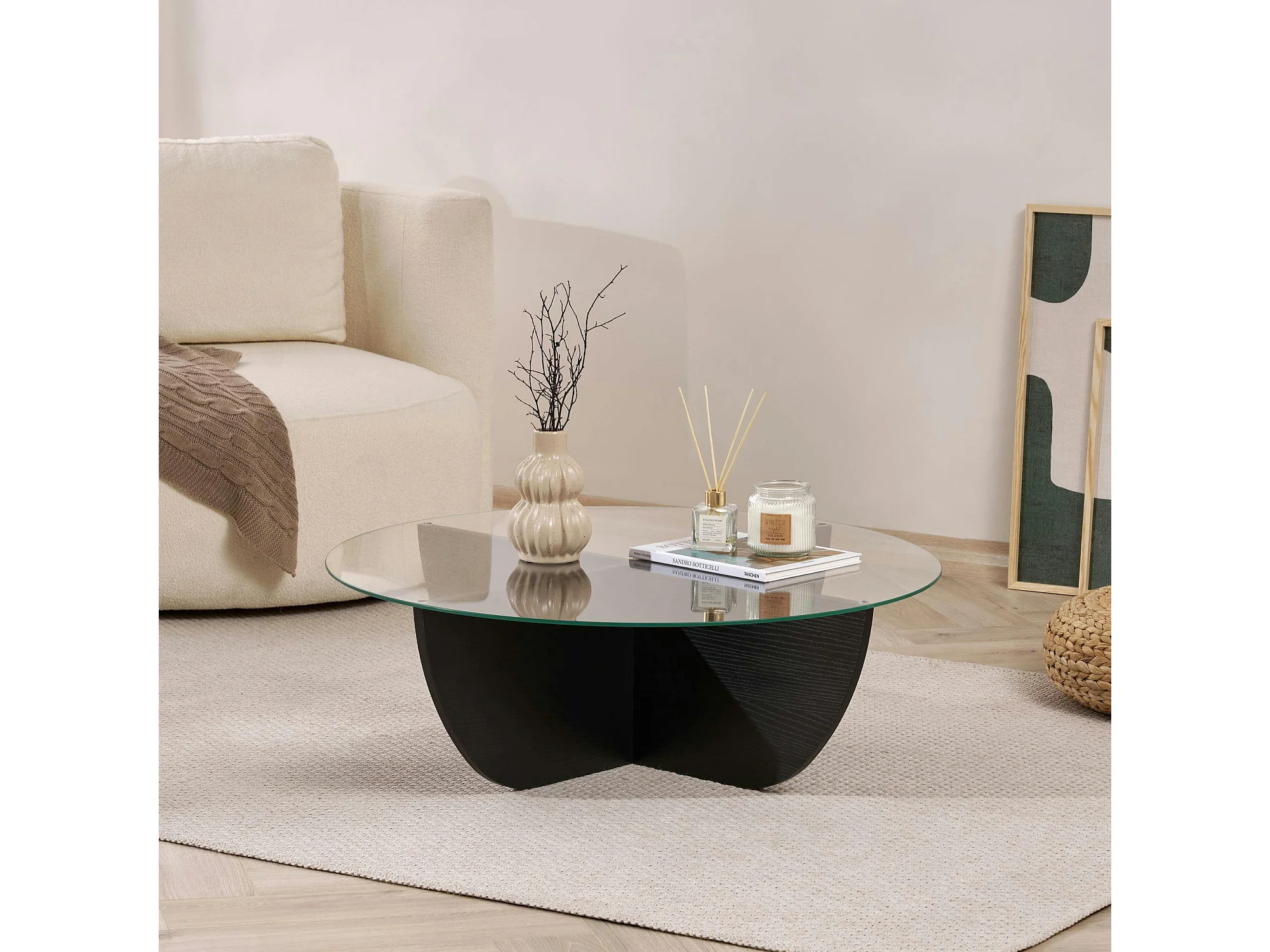 Table basse ronde en verre pied croisé effet bois noir SALTA