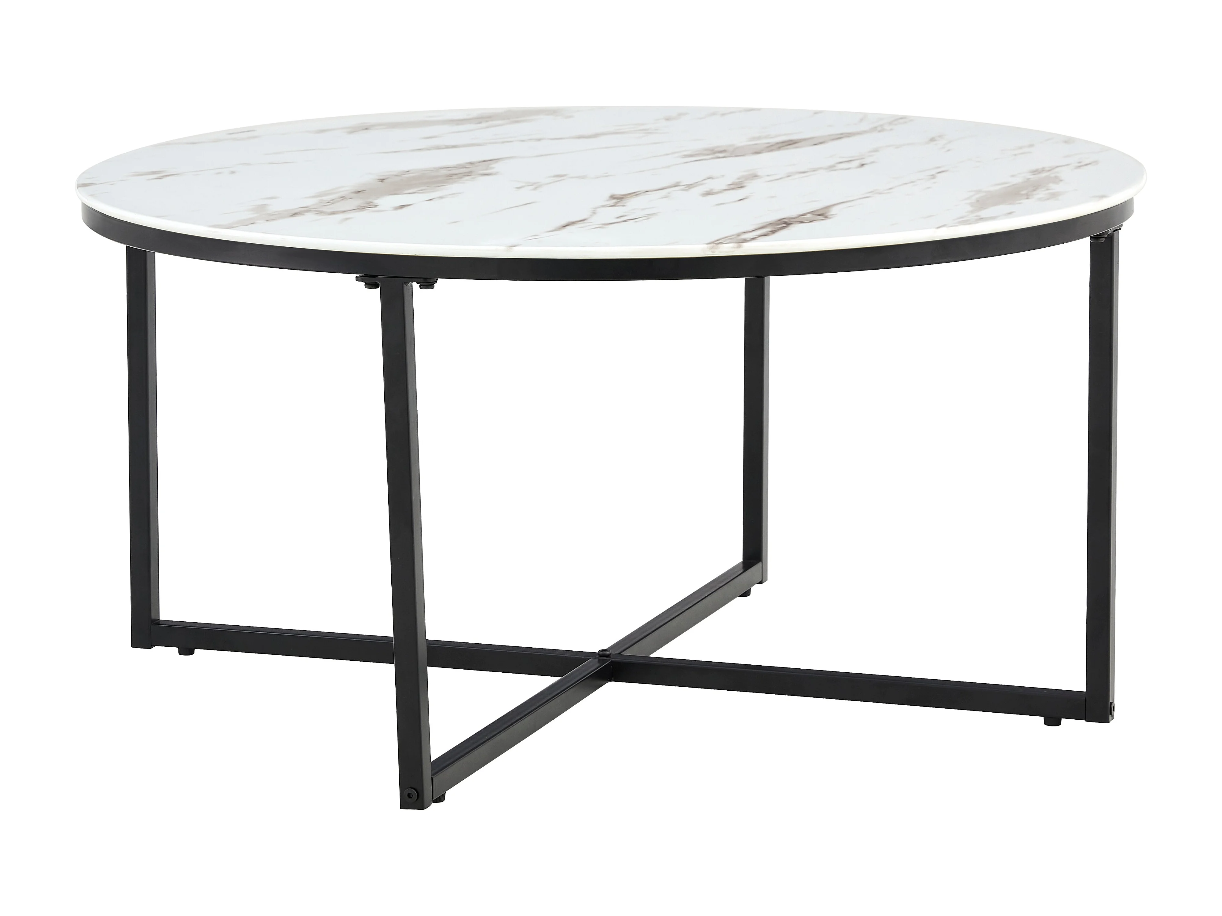 Table Basse LORIE Ronde Plateau Verre Trempé Marbré Blanc Structure Métal Noir D90x45cm
