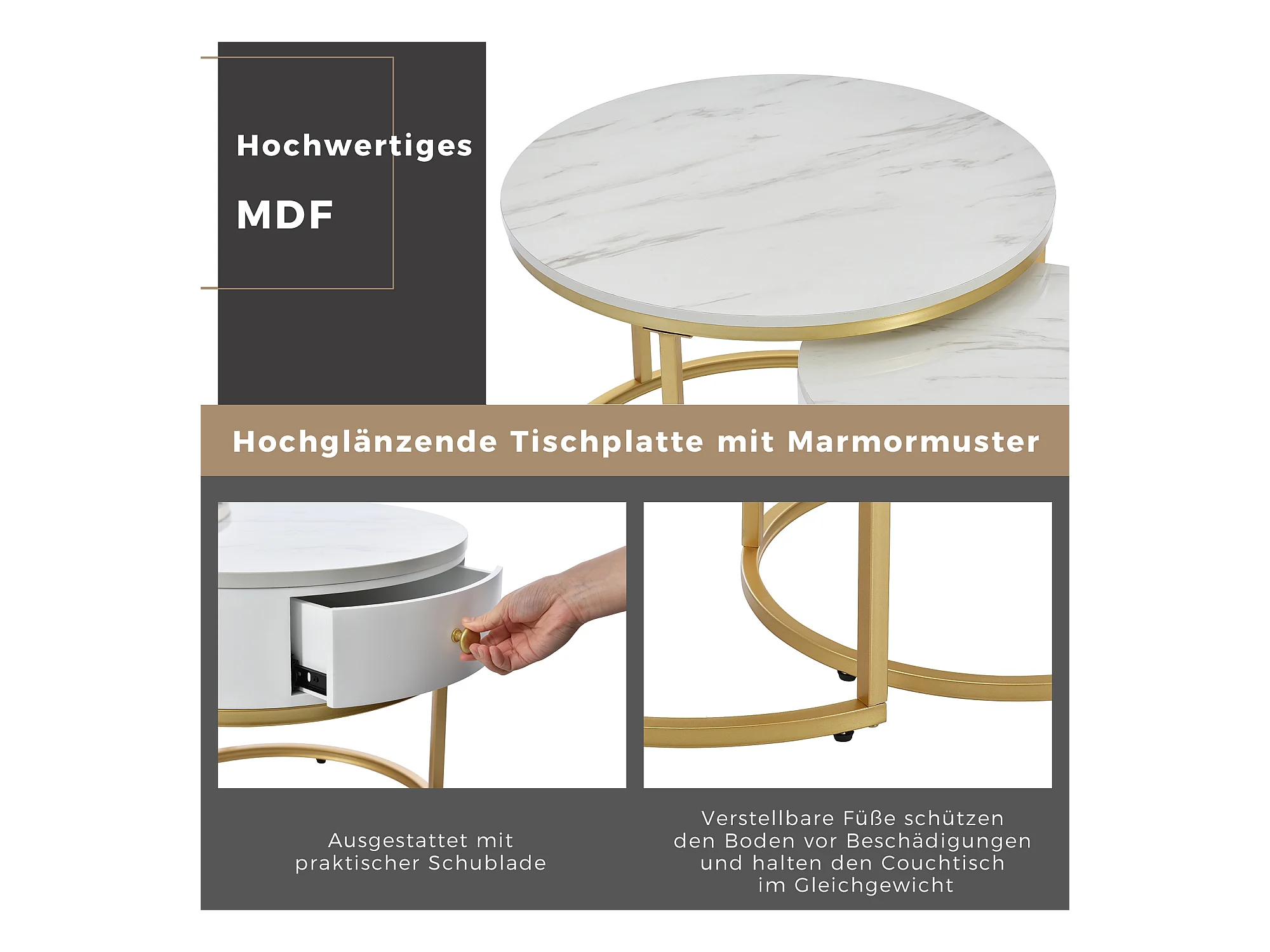 Table basse ronde moderne en marbre haute brillance, set de 2 tables gigognes avec cadre en métal doré, design élégant pour salon, table d'appoint