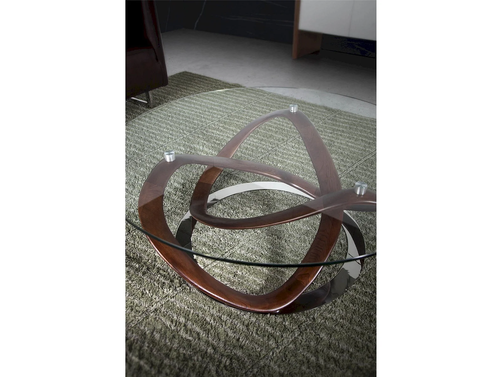 Table basse ronde plateau verre structure courbée bois massif base ronde acier chromé