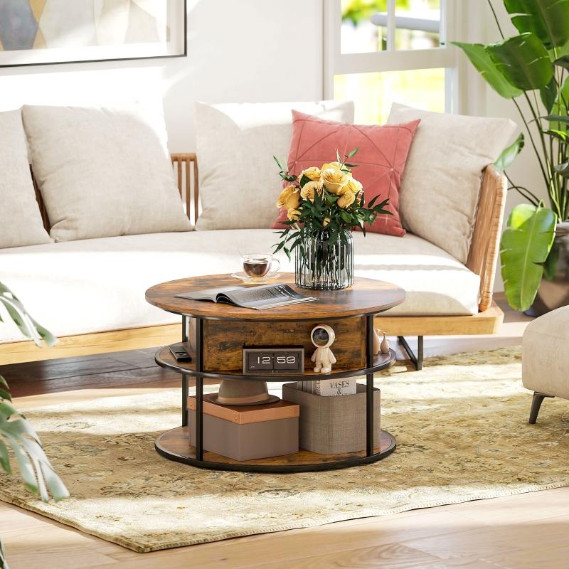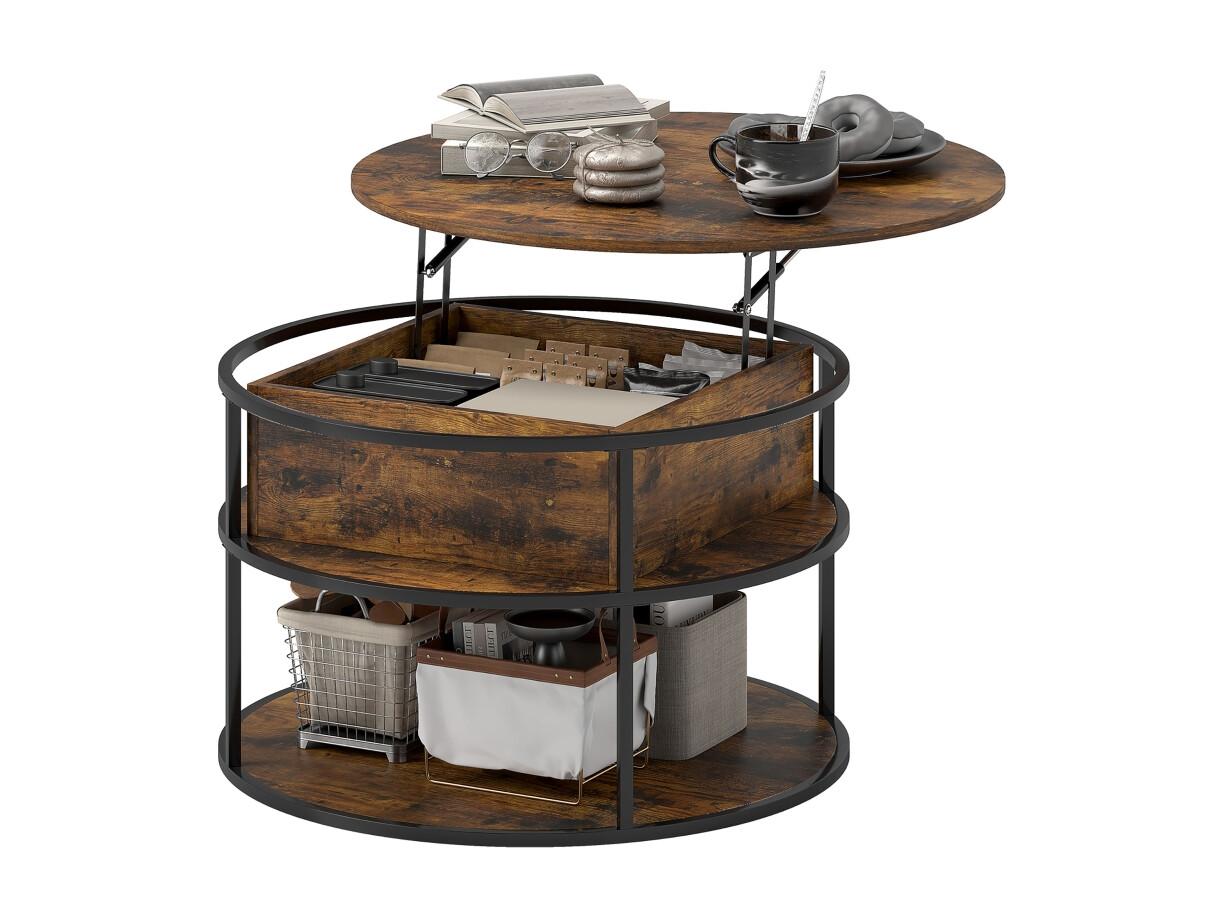 Table Basse Ronde Réglable en Hauteur Ø80 cm - Table de Salon avec Surface de Rangement et Espace de Rangement Caché, Table d'Appoint pour Salon, Marron