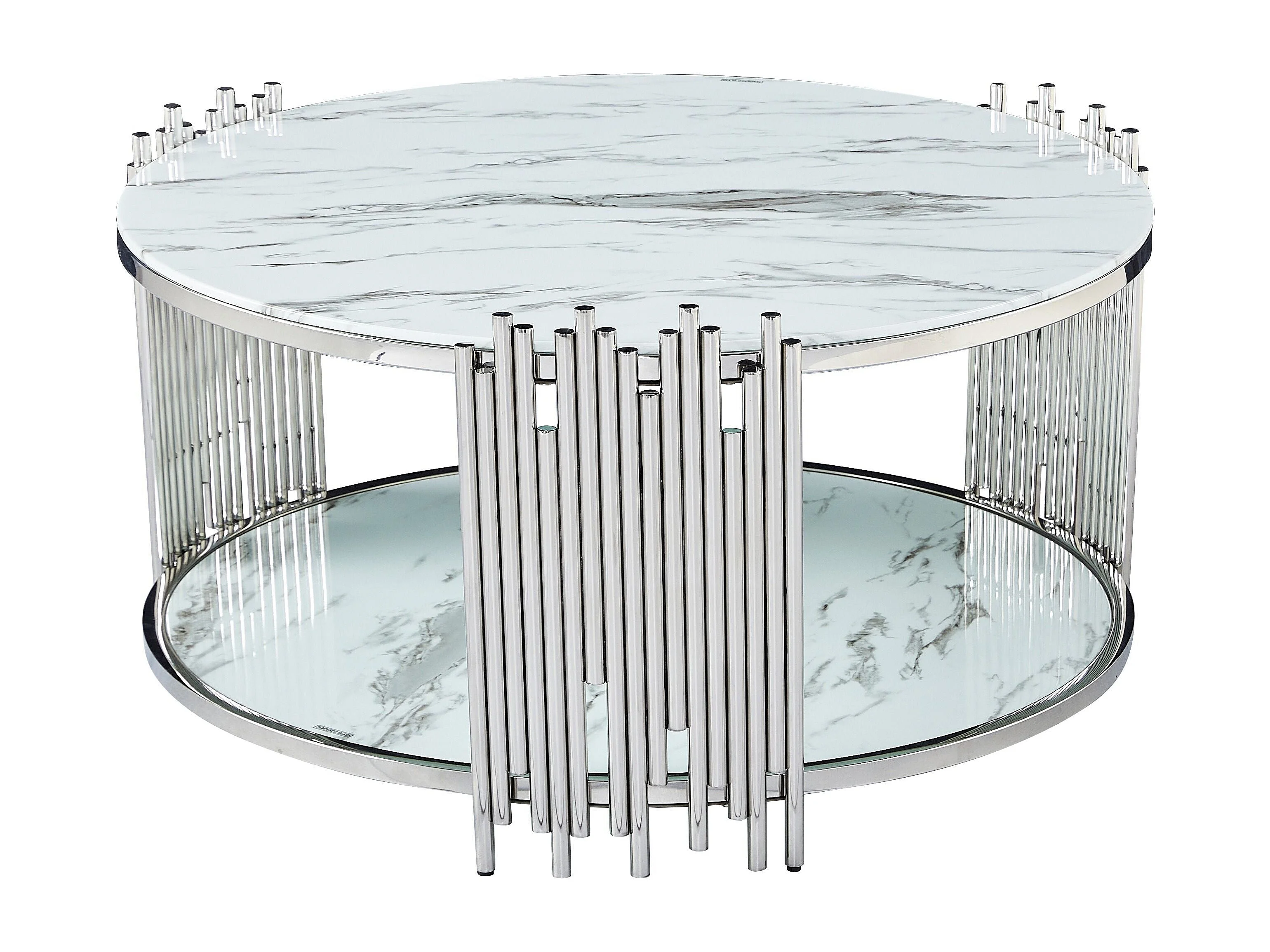 Table Basse ronde STICK Chrome et plateau en verre MARBRE BLANC D90 H45 cm
