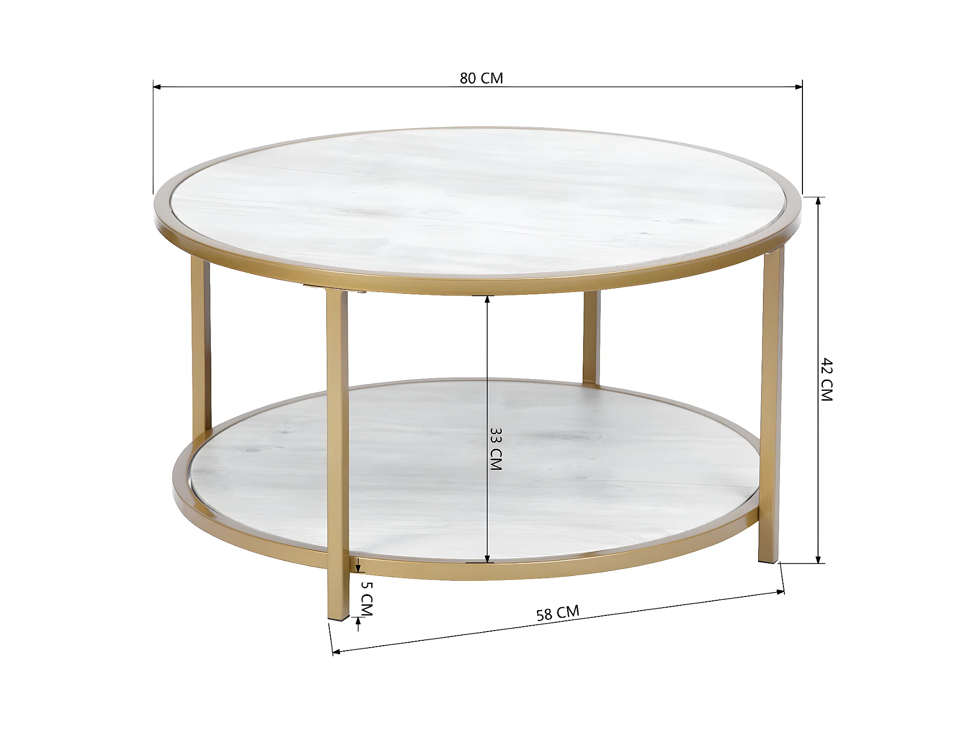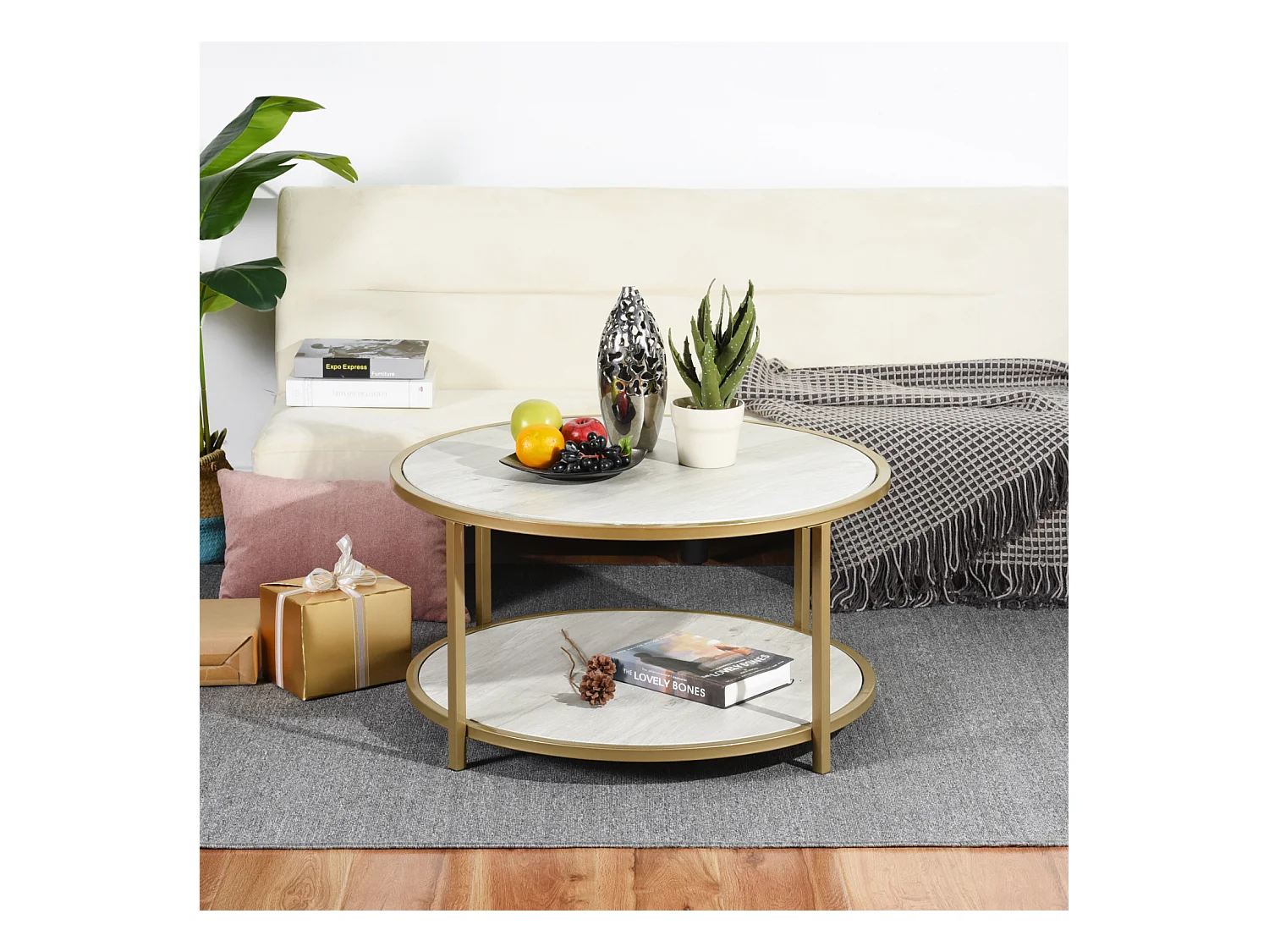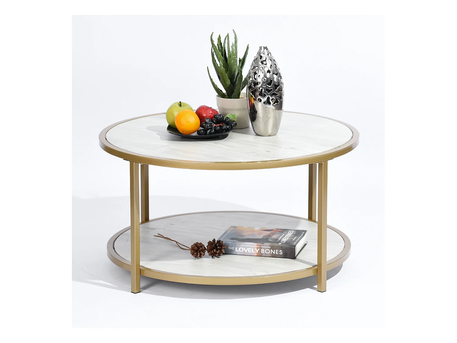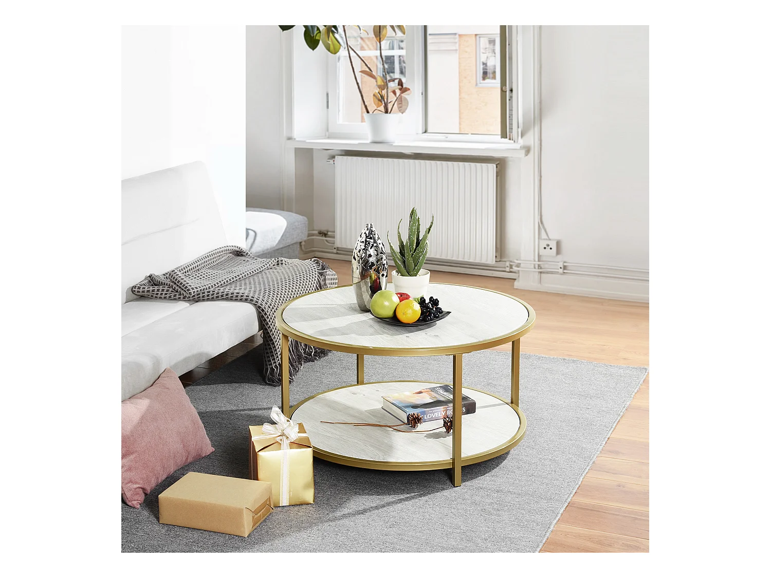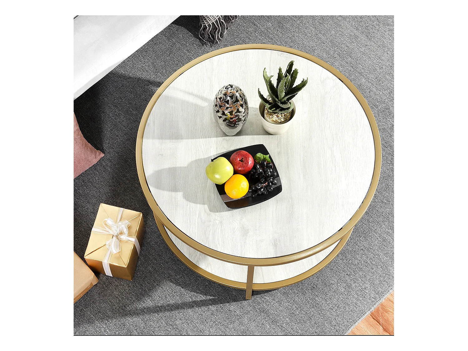Table basse ronde, style scandinavie, table d'appoint de salon, cadre en métal doré, plateaux et étagère en MDF blanc