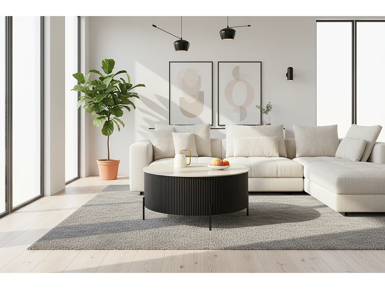 Table Basse RUBY Ronde Plateau Céramique Effet Travertin Noir Pied Métal Noir D100xH45 cm