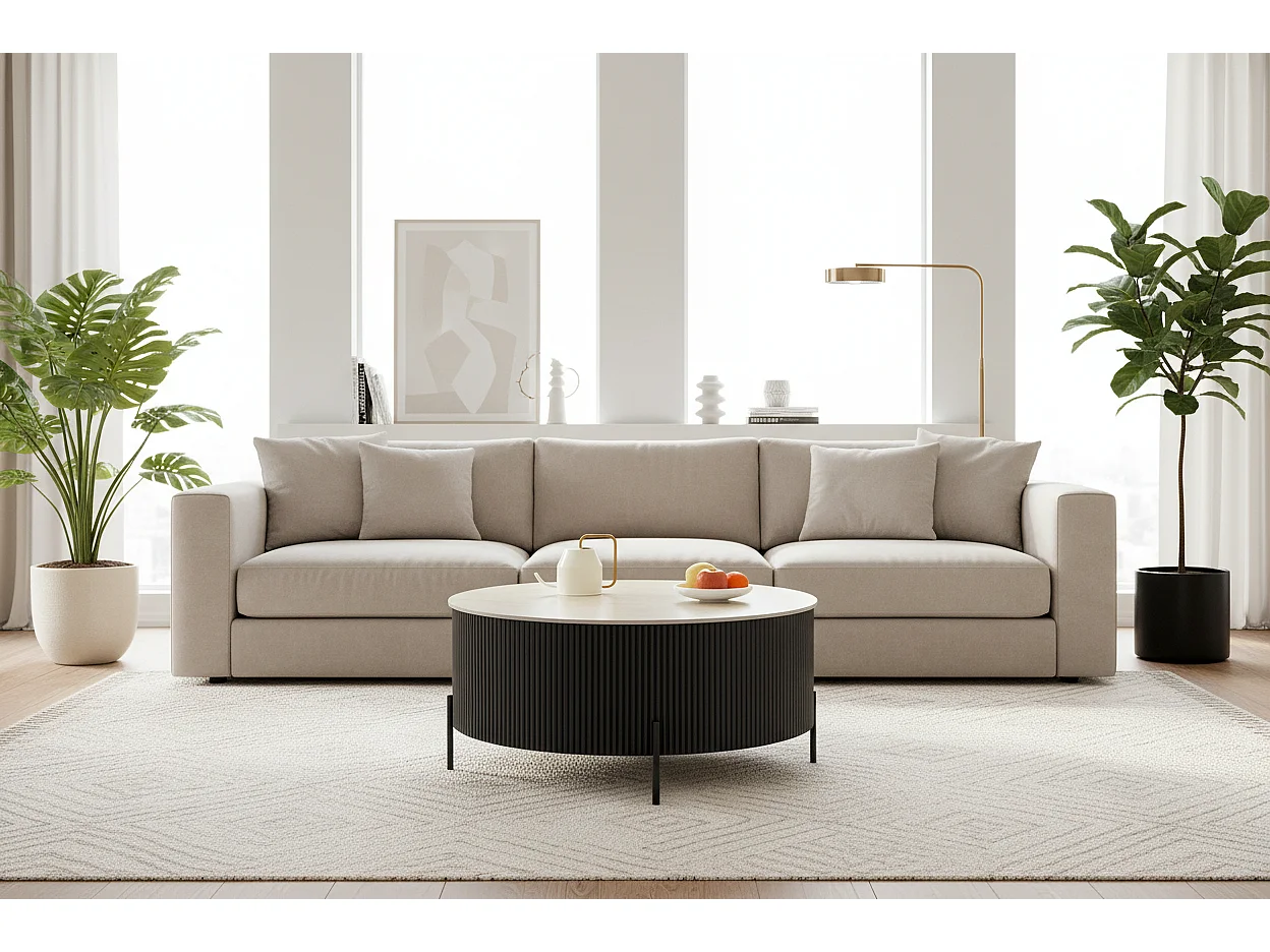 Table Basse RUBY Ronde Plateau Céramique Effet Travertin Noir Pied Métal Noir D90xH45 cm