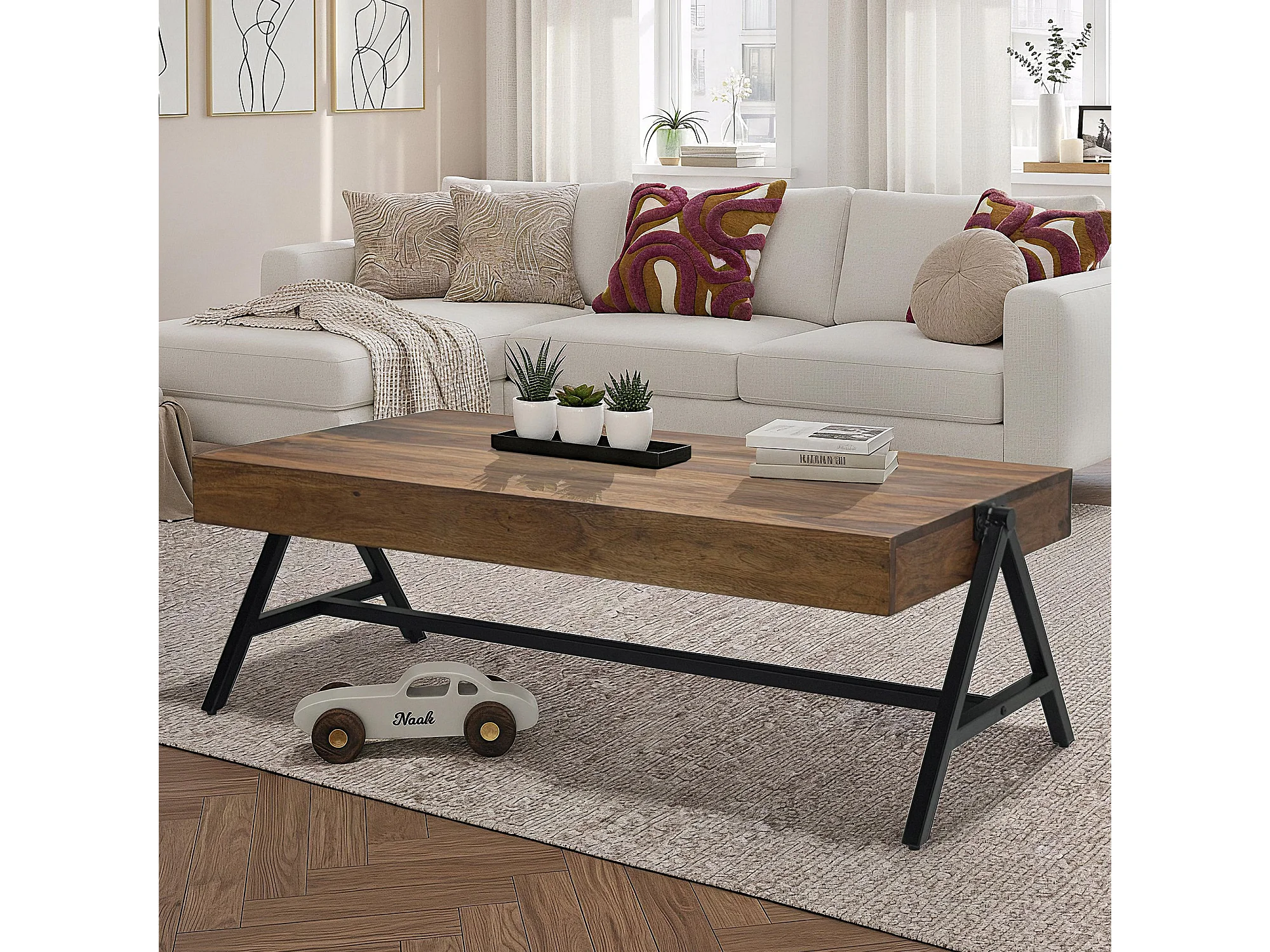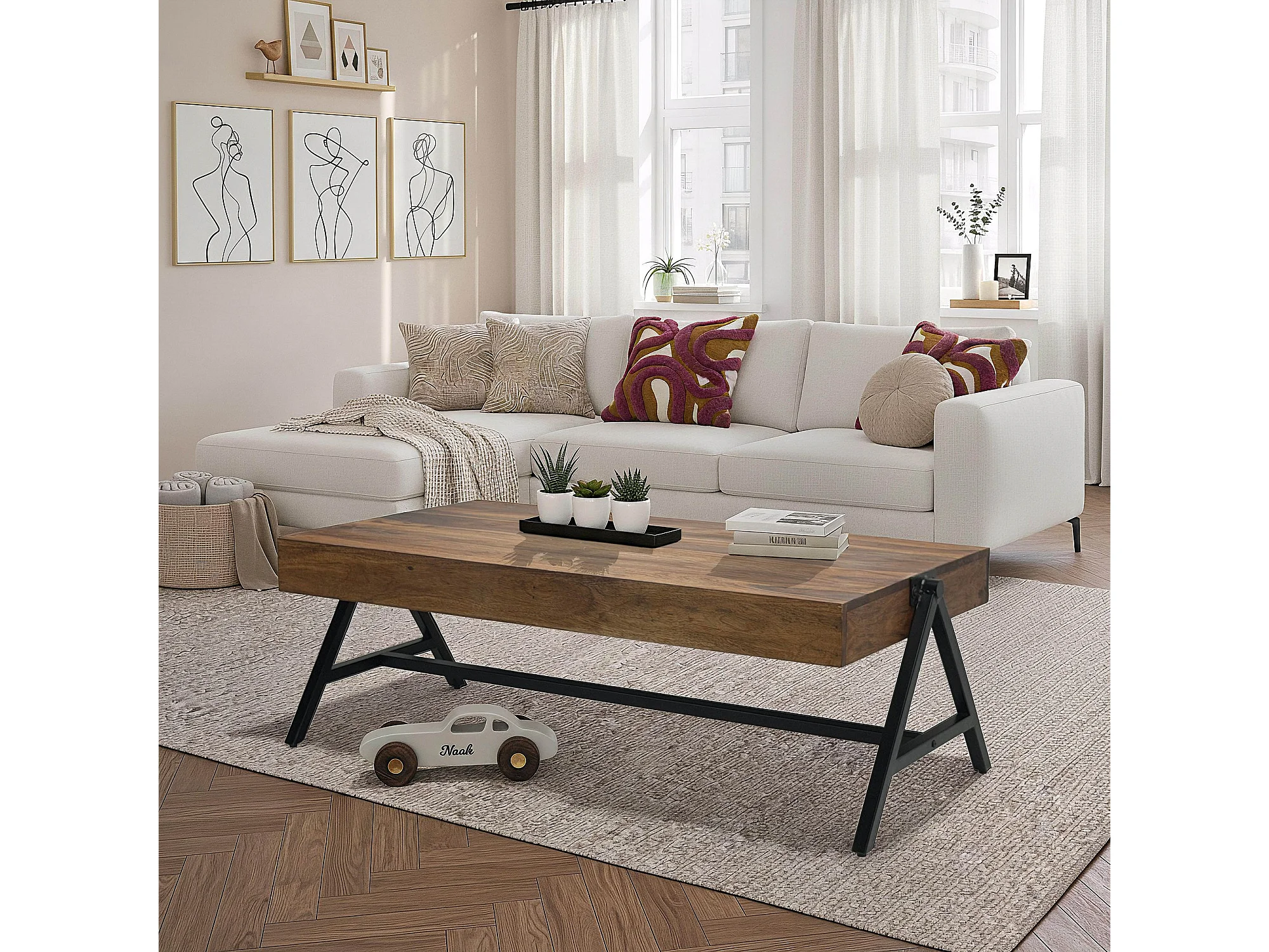 Table Basse Sheesham Bois Massif 120cm Table de Salon Rectangulaire Industrielle