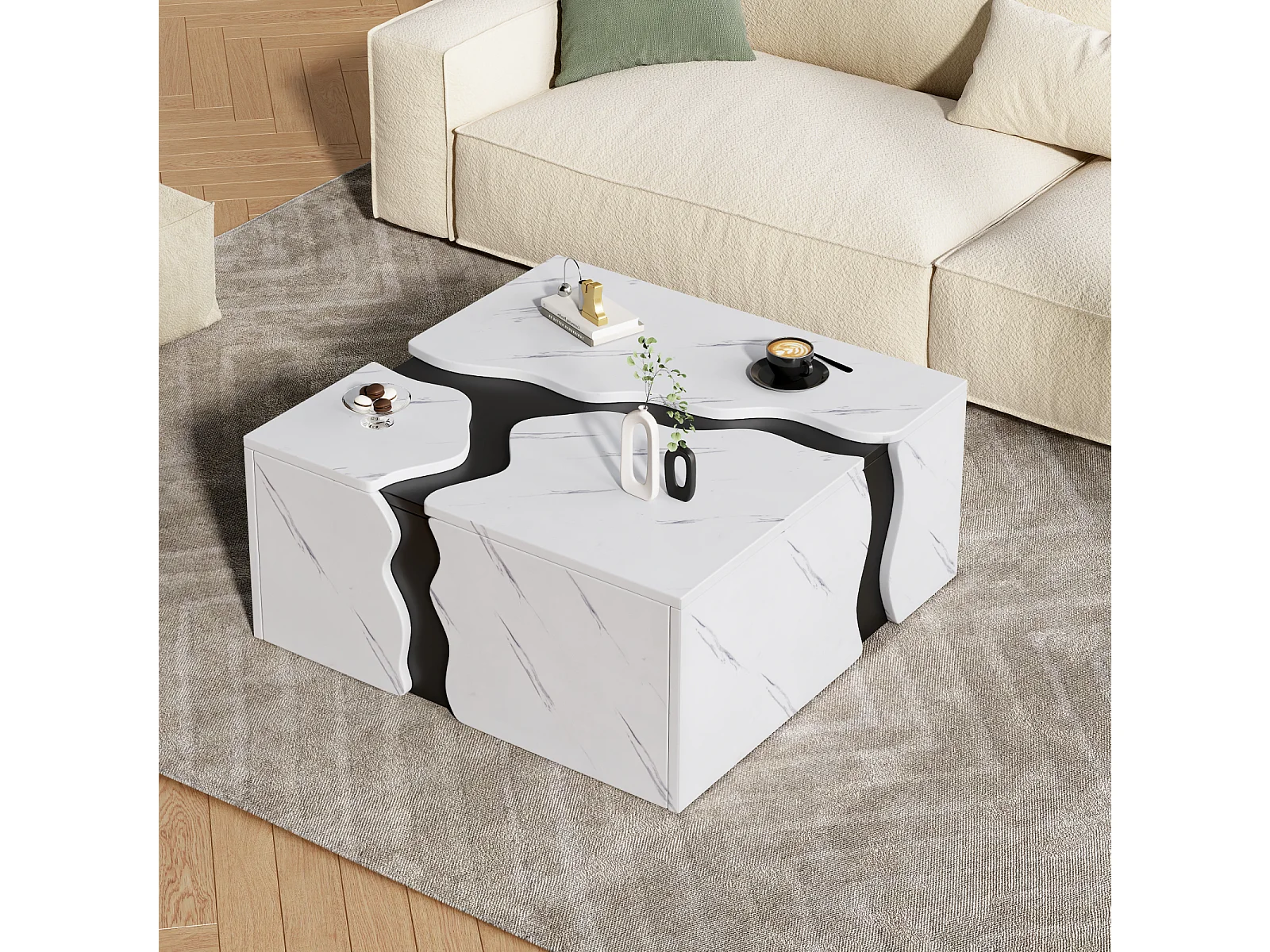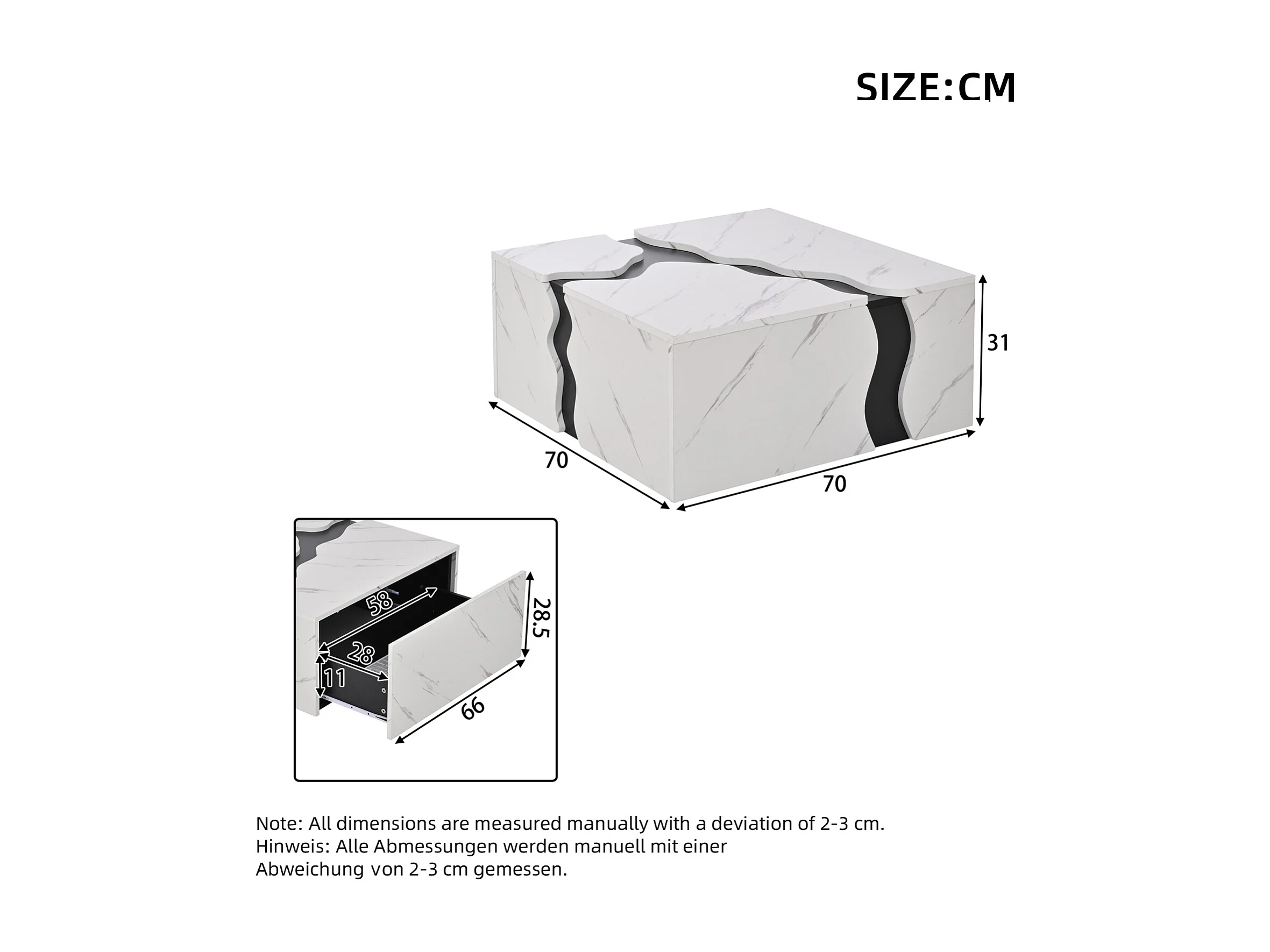 Table basse en placage marbre de salon - 70 x 70 x 31 cm - design géométrique - avec tiroir - aggloméré - blanc