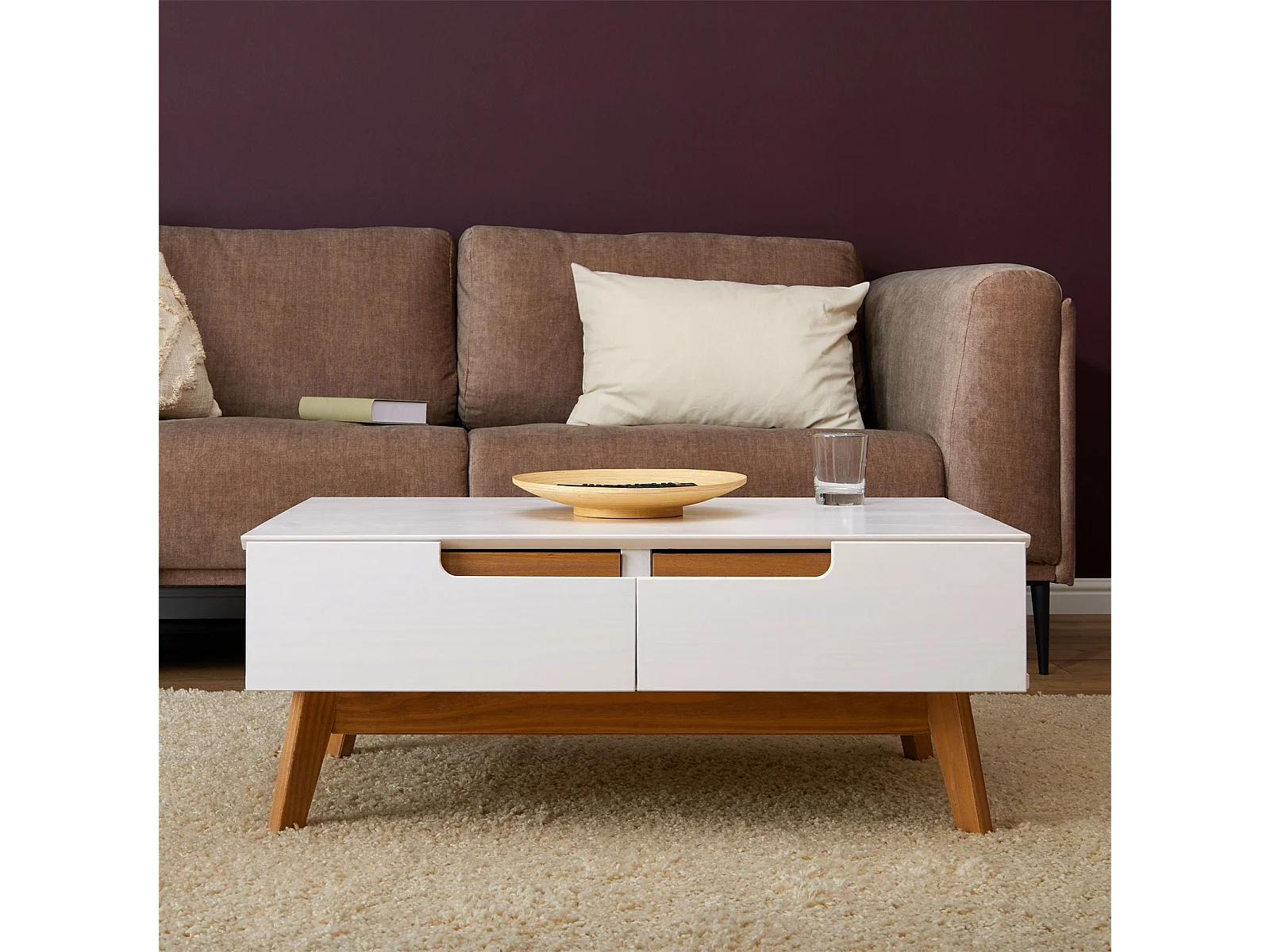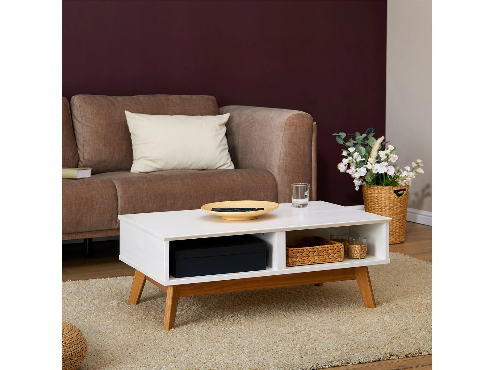 Table basse TIBOR style scandinave design vintage nordique table de salon rectangulaire 2 tiroirs 2 niches pin massif lasuré blanc