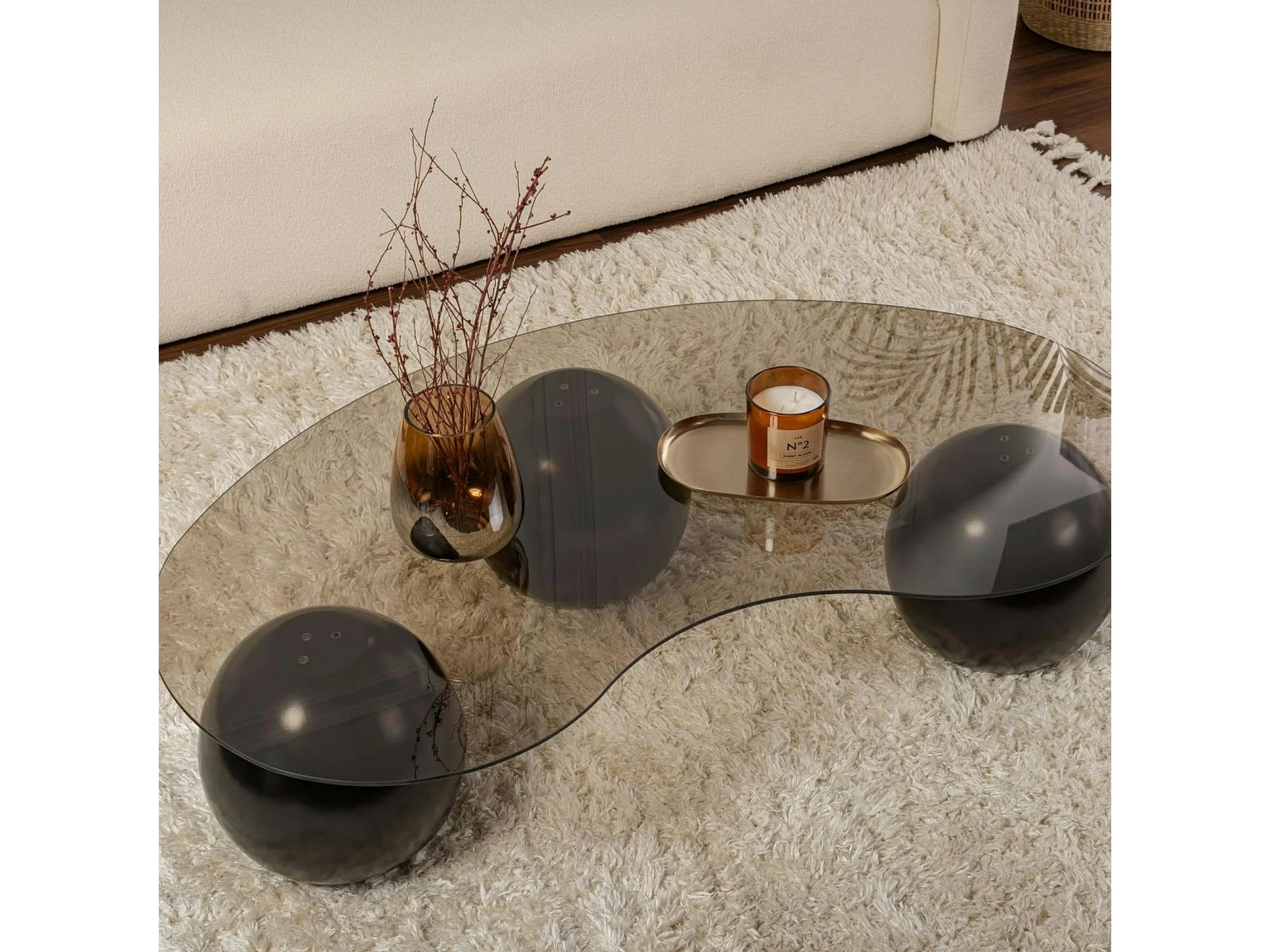Table basse verre ambré design - 3 pieds boules noirs KOCHI