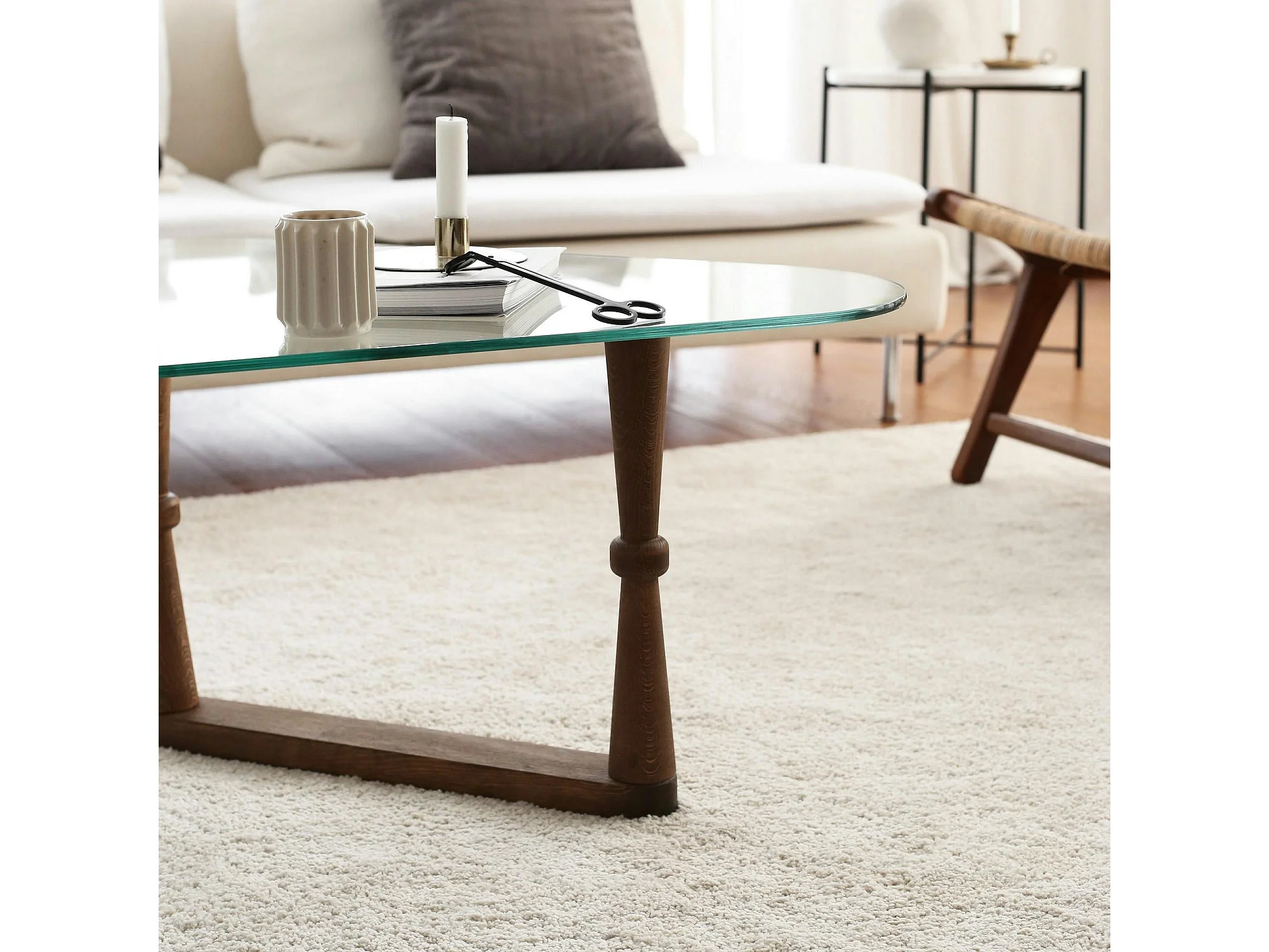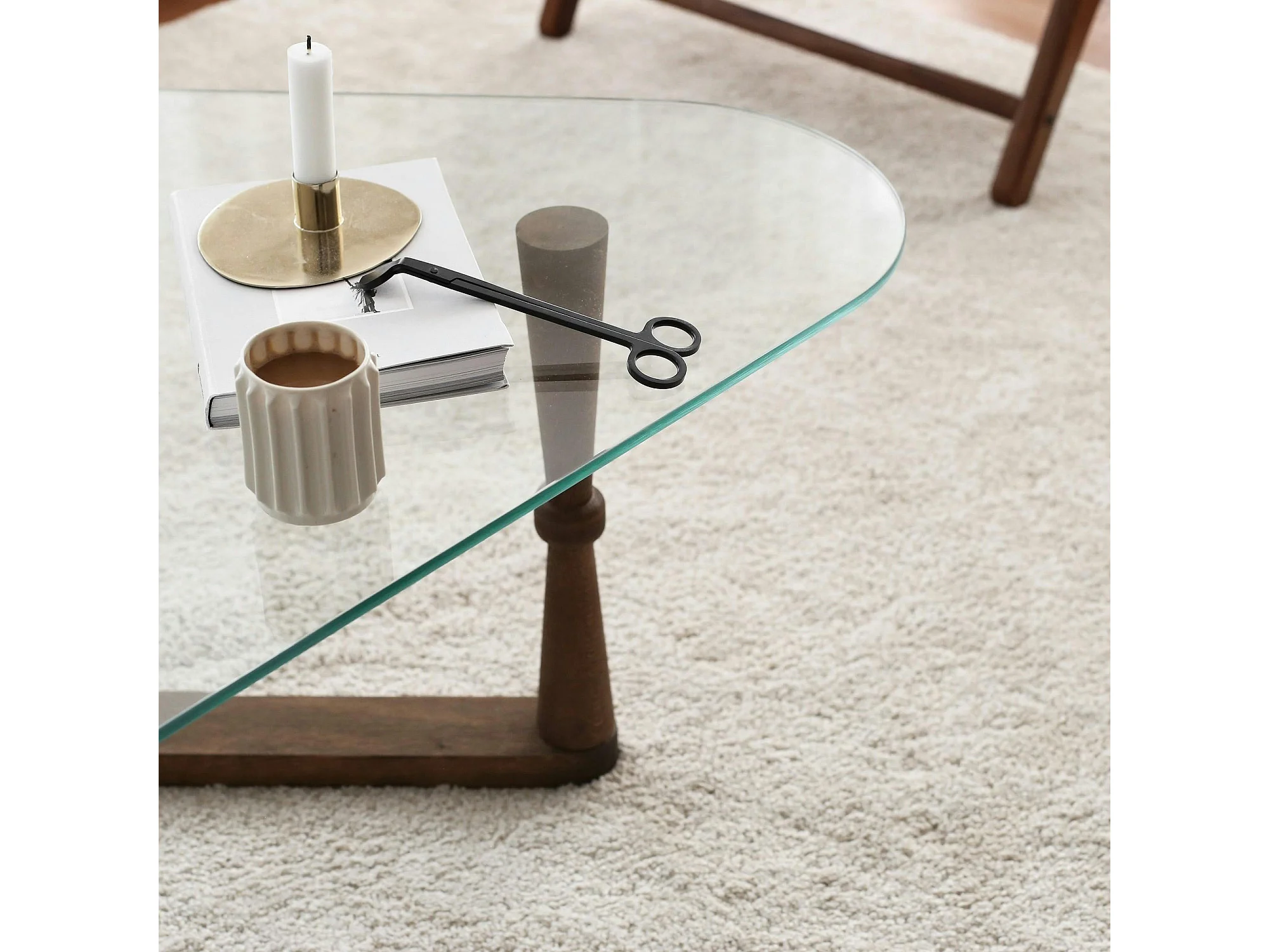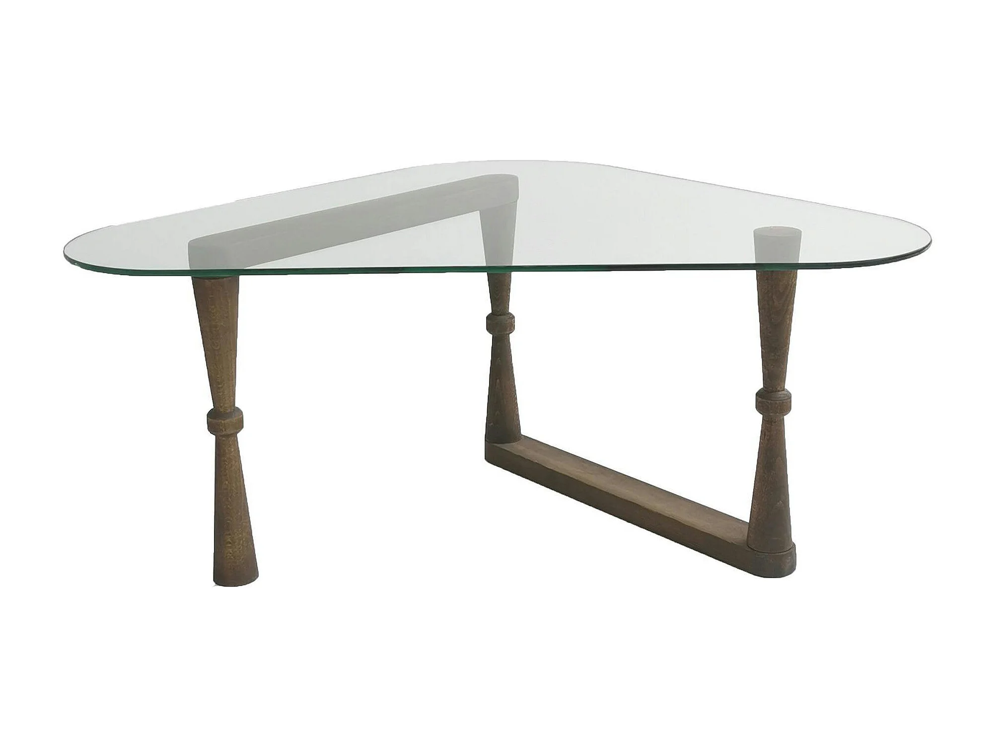 Table basse verre - forme triangle, pied bois sculpté BOMA