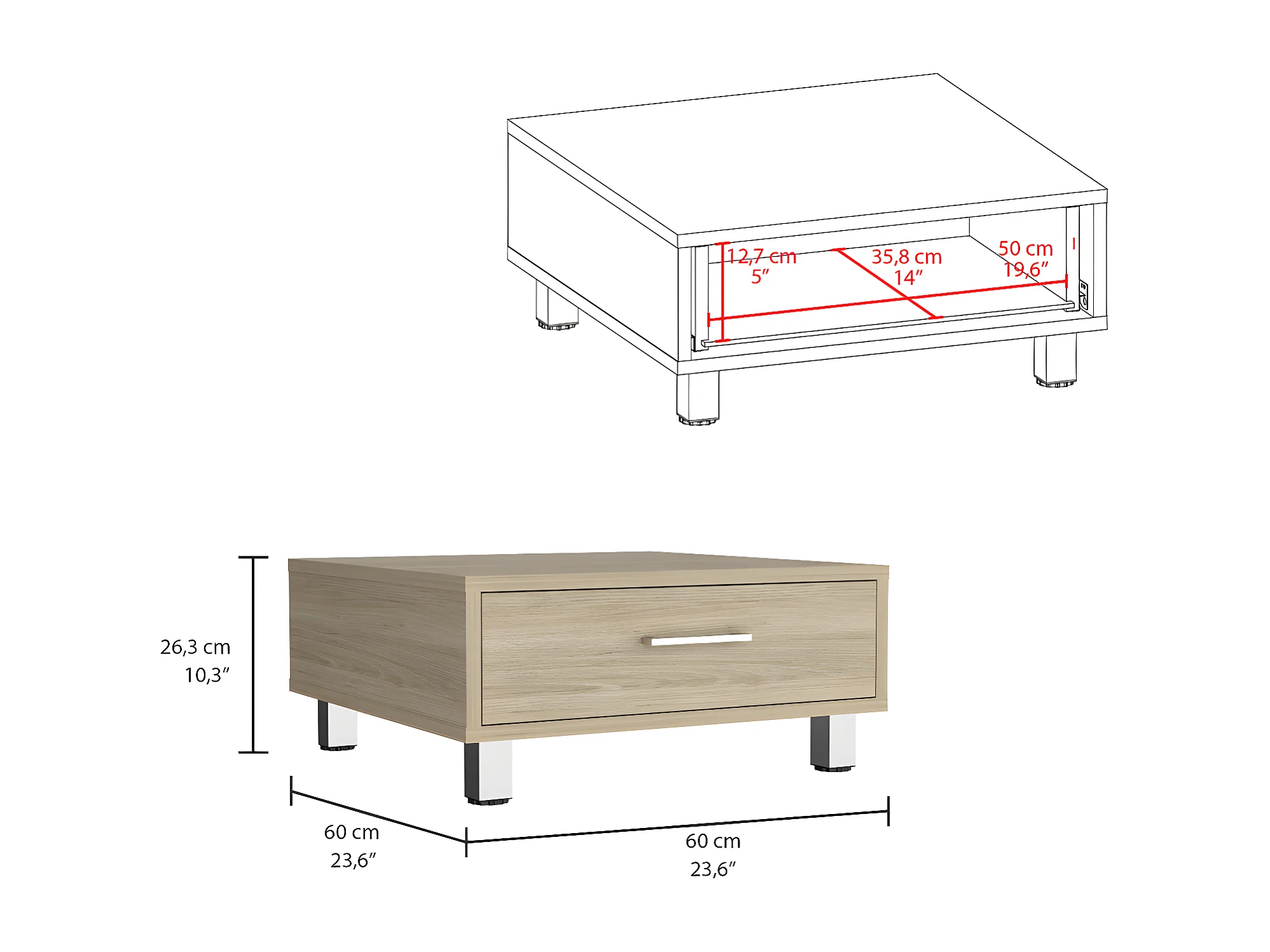 Table centrale de Beijing avec 1 tiroir, 26,3 cm à x 60 cm P x 60 cm et miel