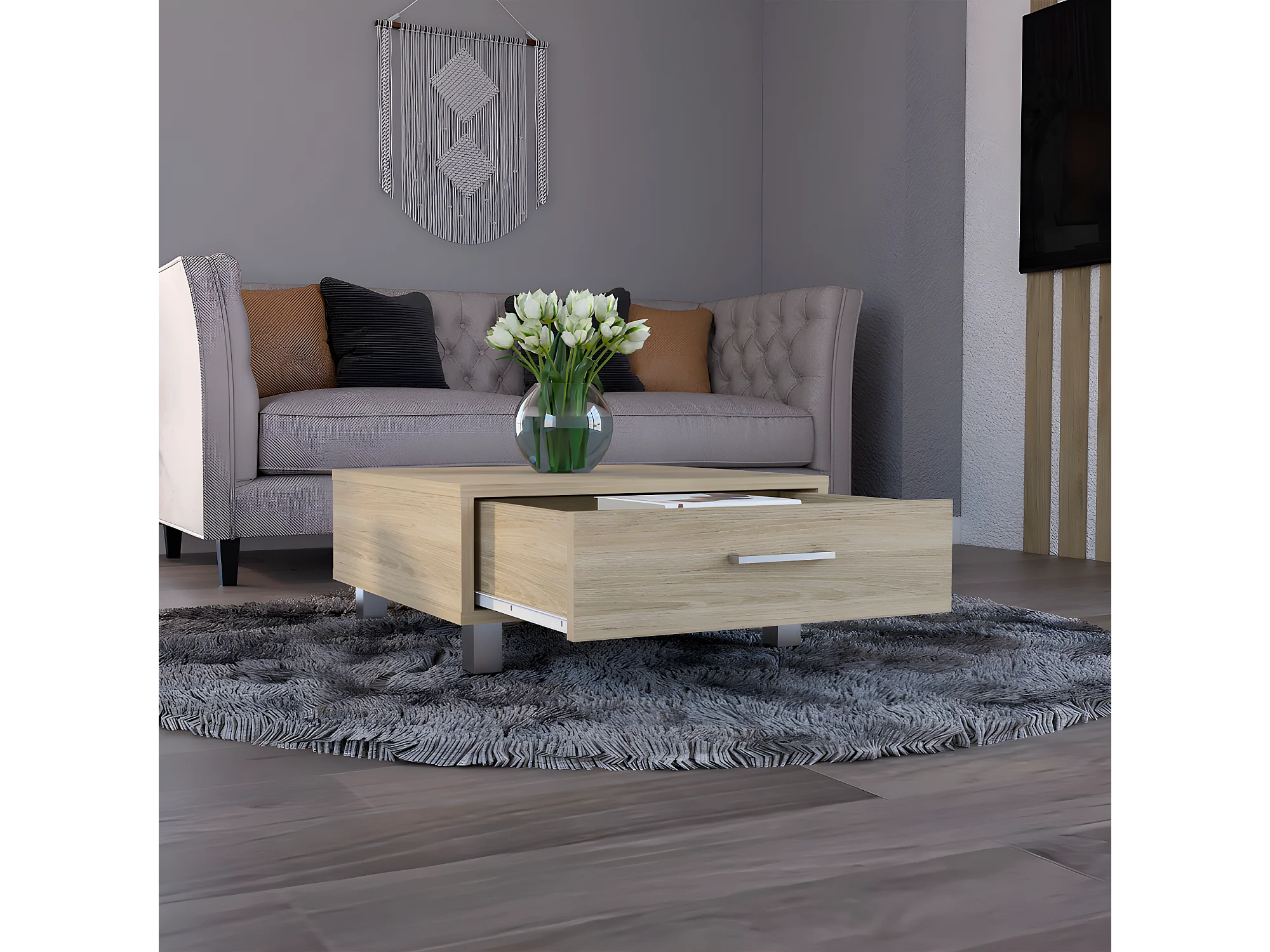 Table basse 85 cm blanc / table de salon en chêne avec rangements table basse