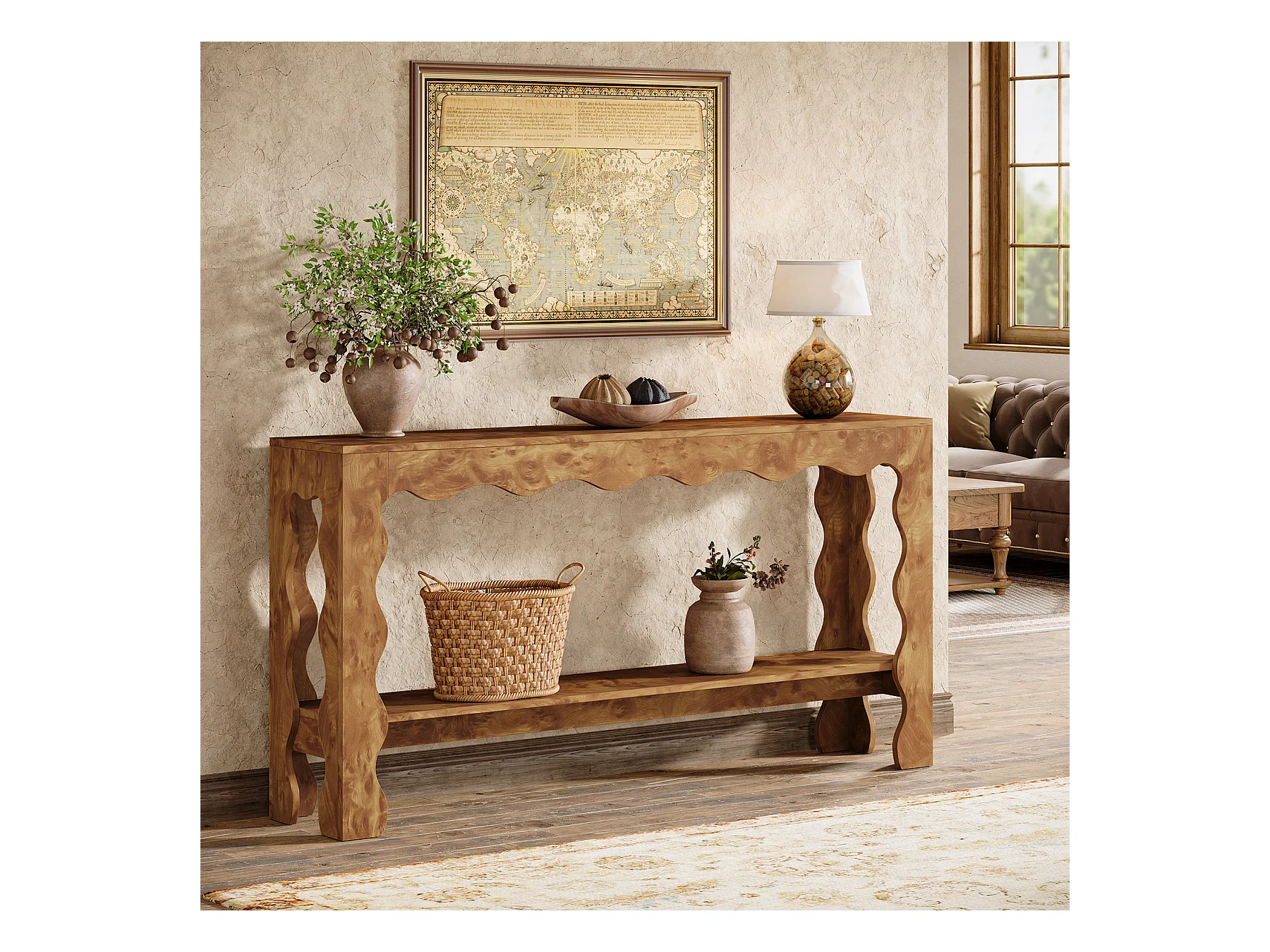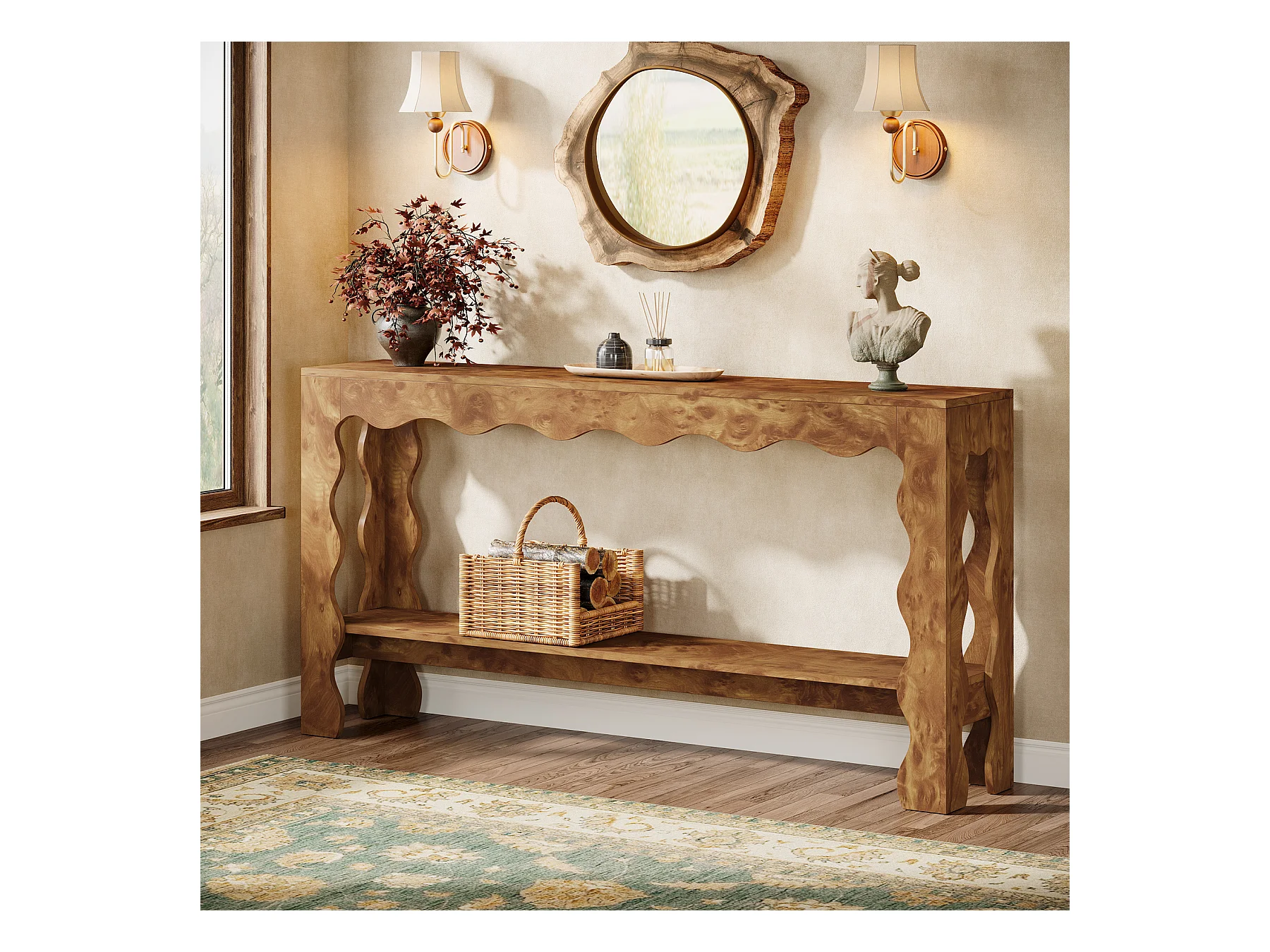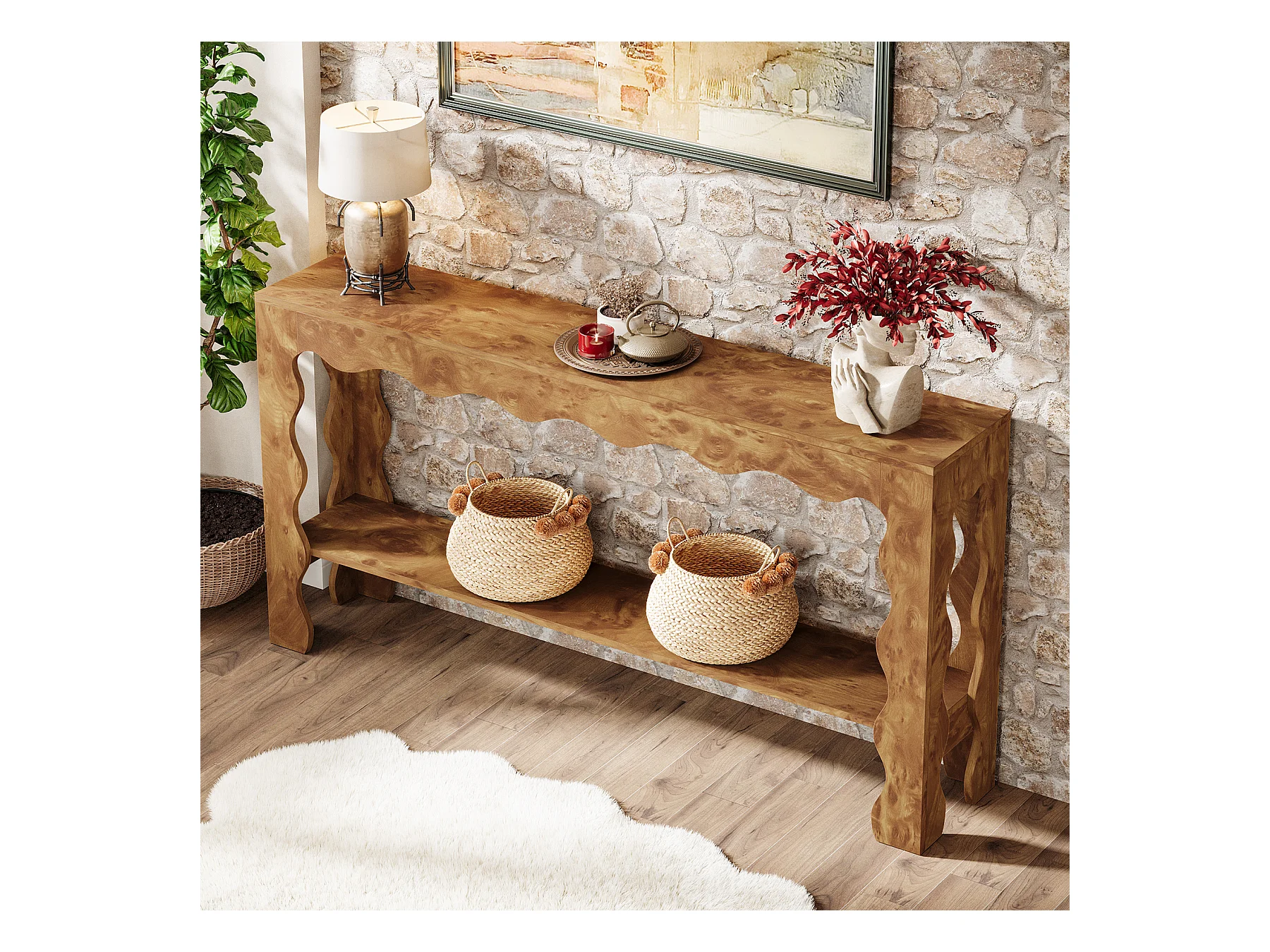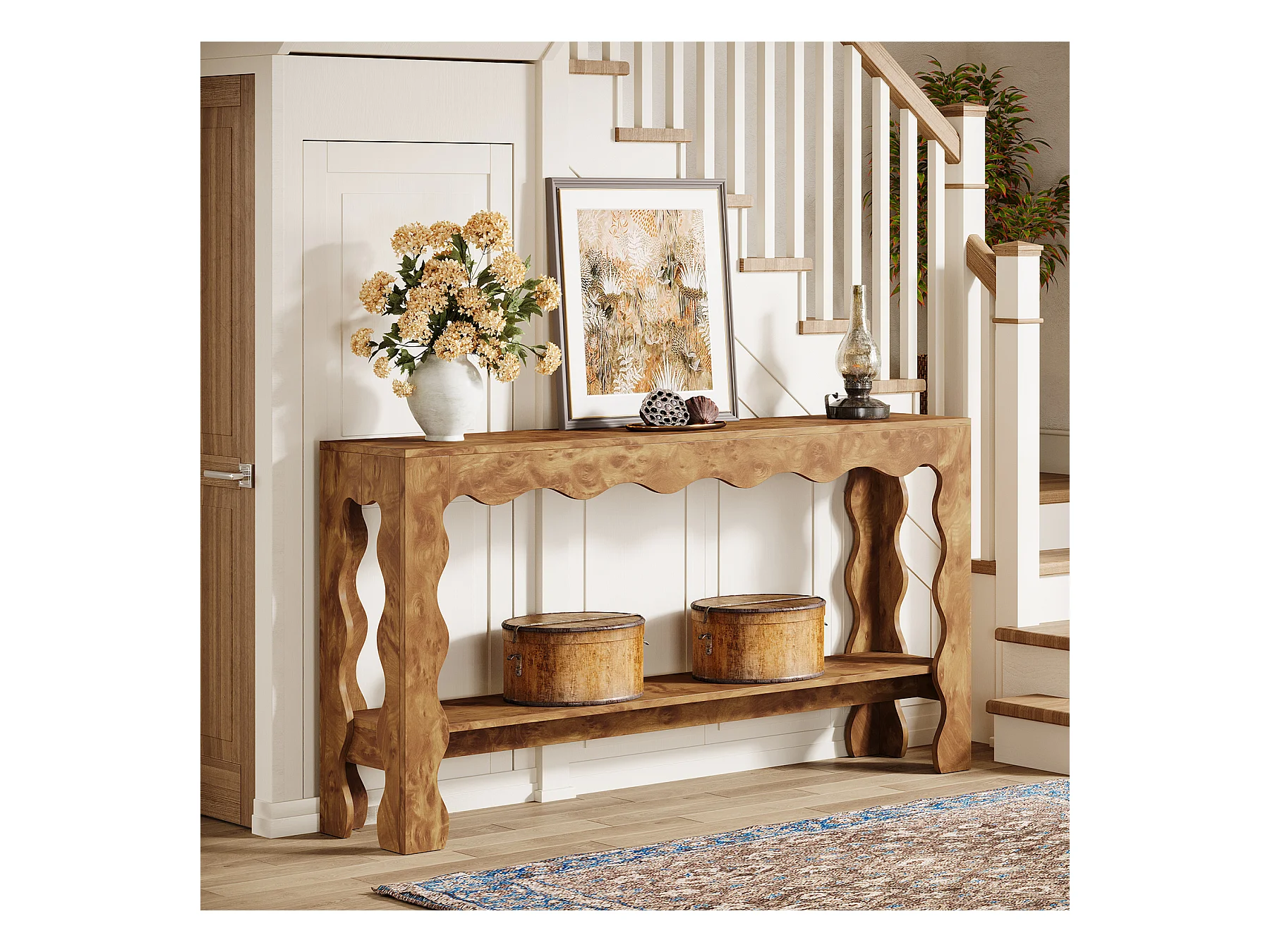 Table console de 160 cm, table d'entrée étroite à 2 niveaux avec pieds festonnés