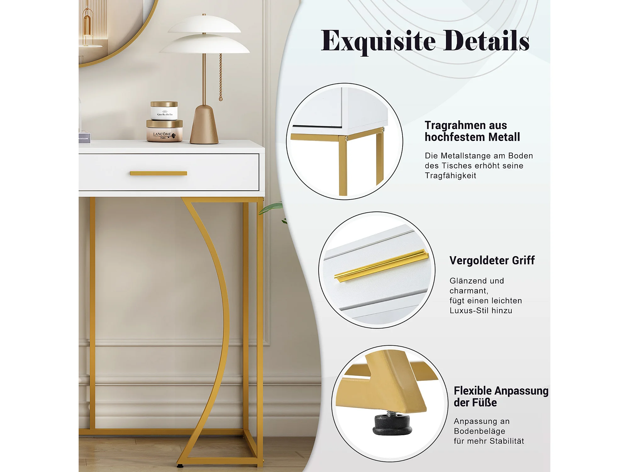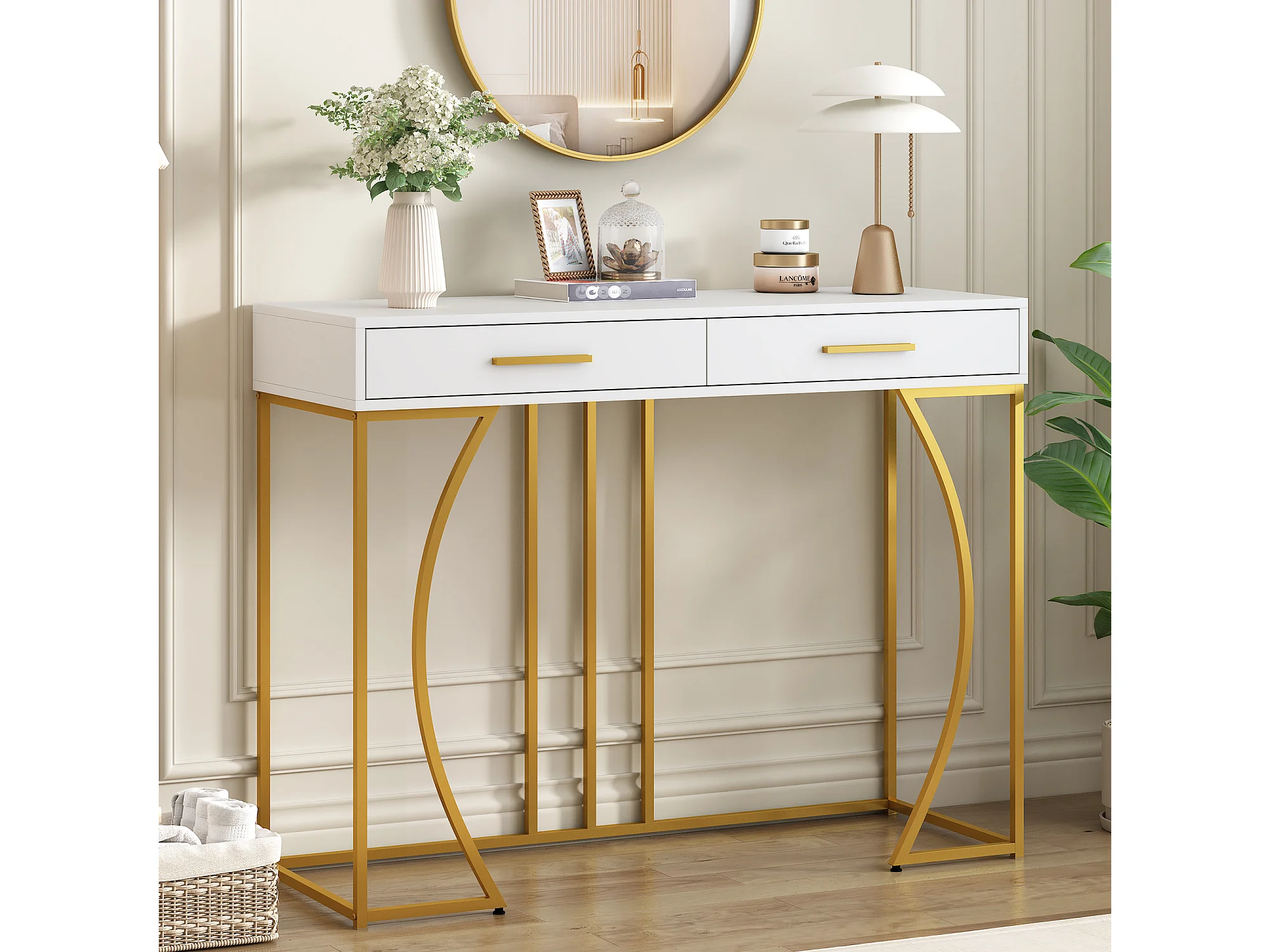 Table Console de Luxe avec 2 Tiroirs, Table d'Entrée en Métal et MDF, Table d'Appoint Élégante, Design Moderne, Blanc/Or