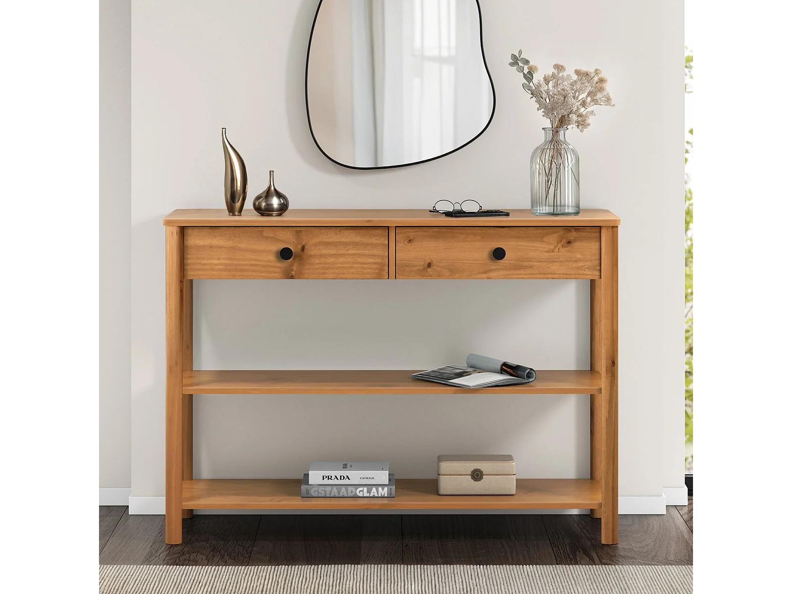 Table console d'entrée APOANA L 110 cm en bois massif coloris chêne avec 2 tiroirs et 2 tablettes, Design naturel