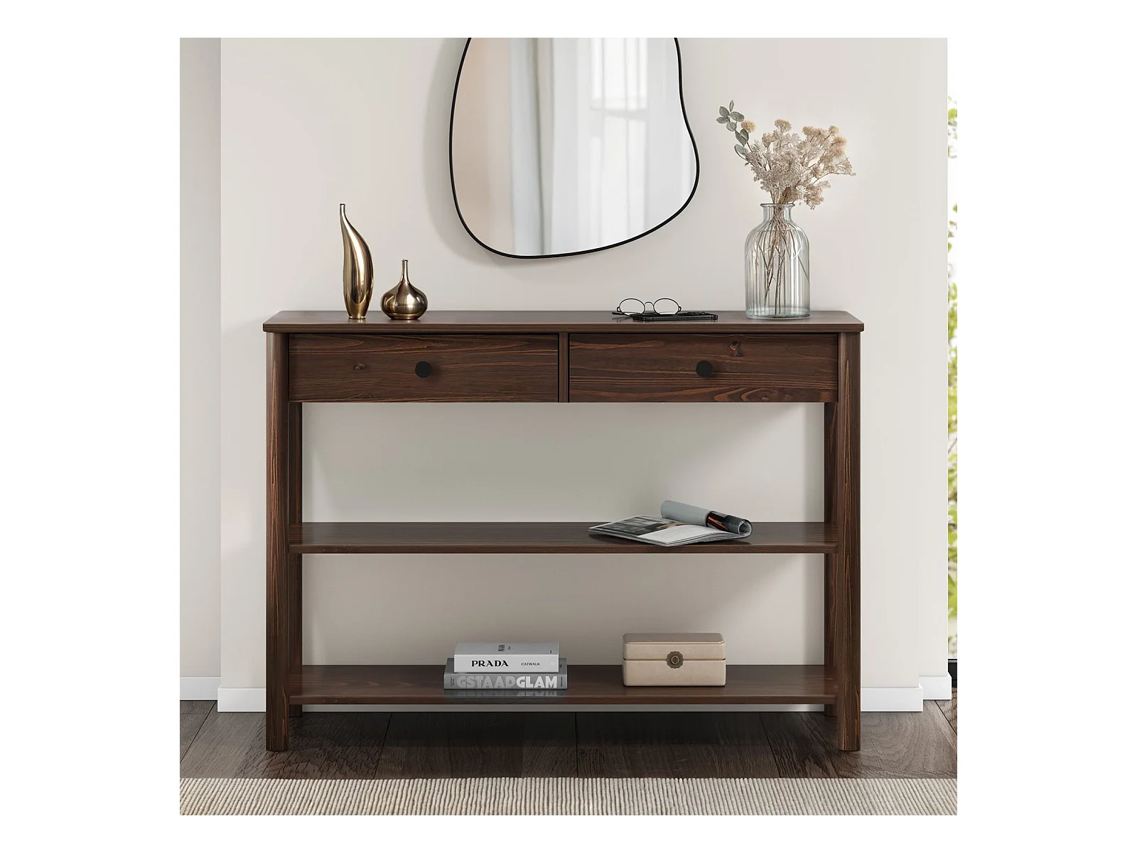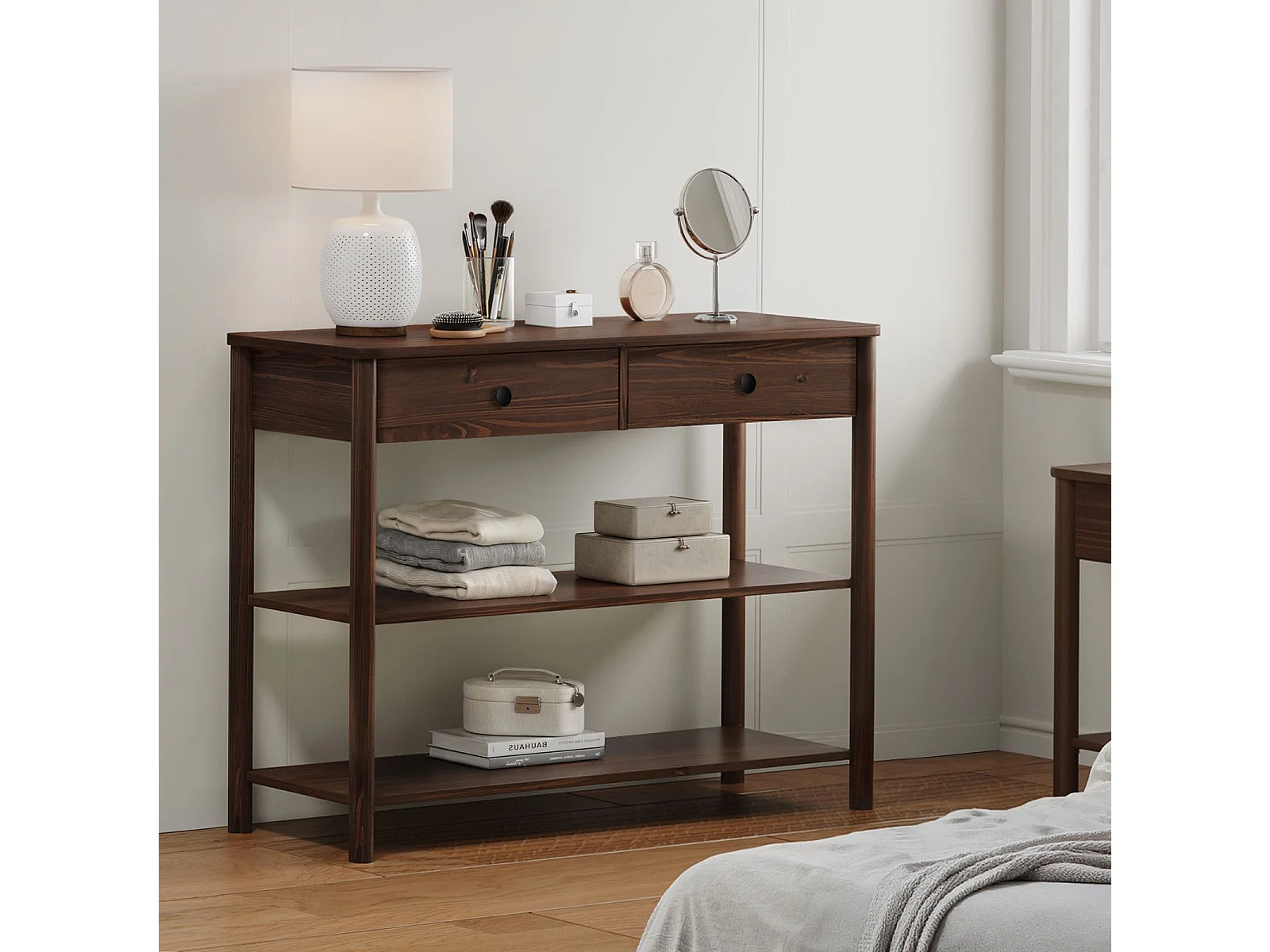 Table console d'entrée APOANA L 110 cm en bois massif coloris noyer avec 2 tiroirs et 2 tablettes, Design naturel