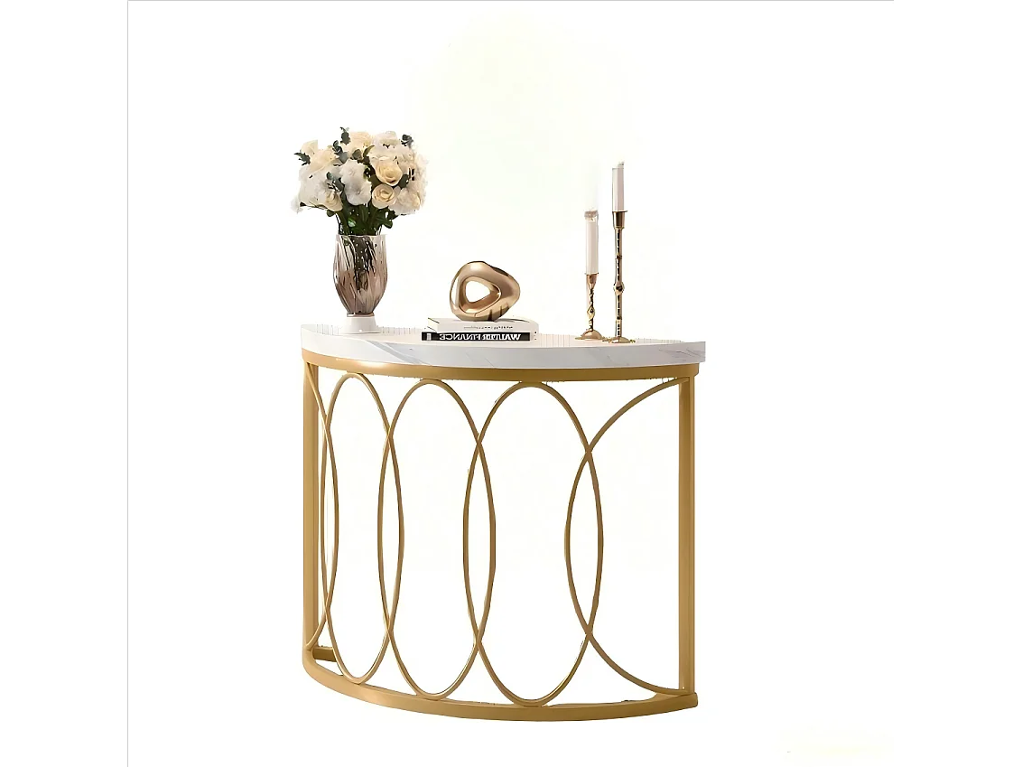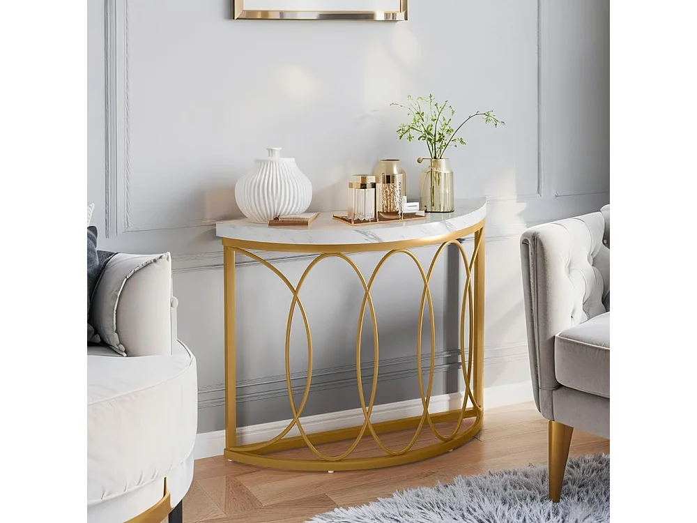 Table console dorée avec en marbre artificie, cadre en métal et design demi-lune, table d'appoint fine pour salon, couloir, entrée,chambre