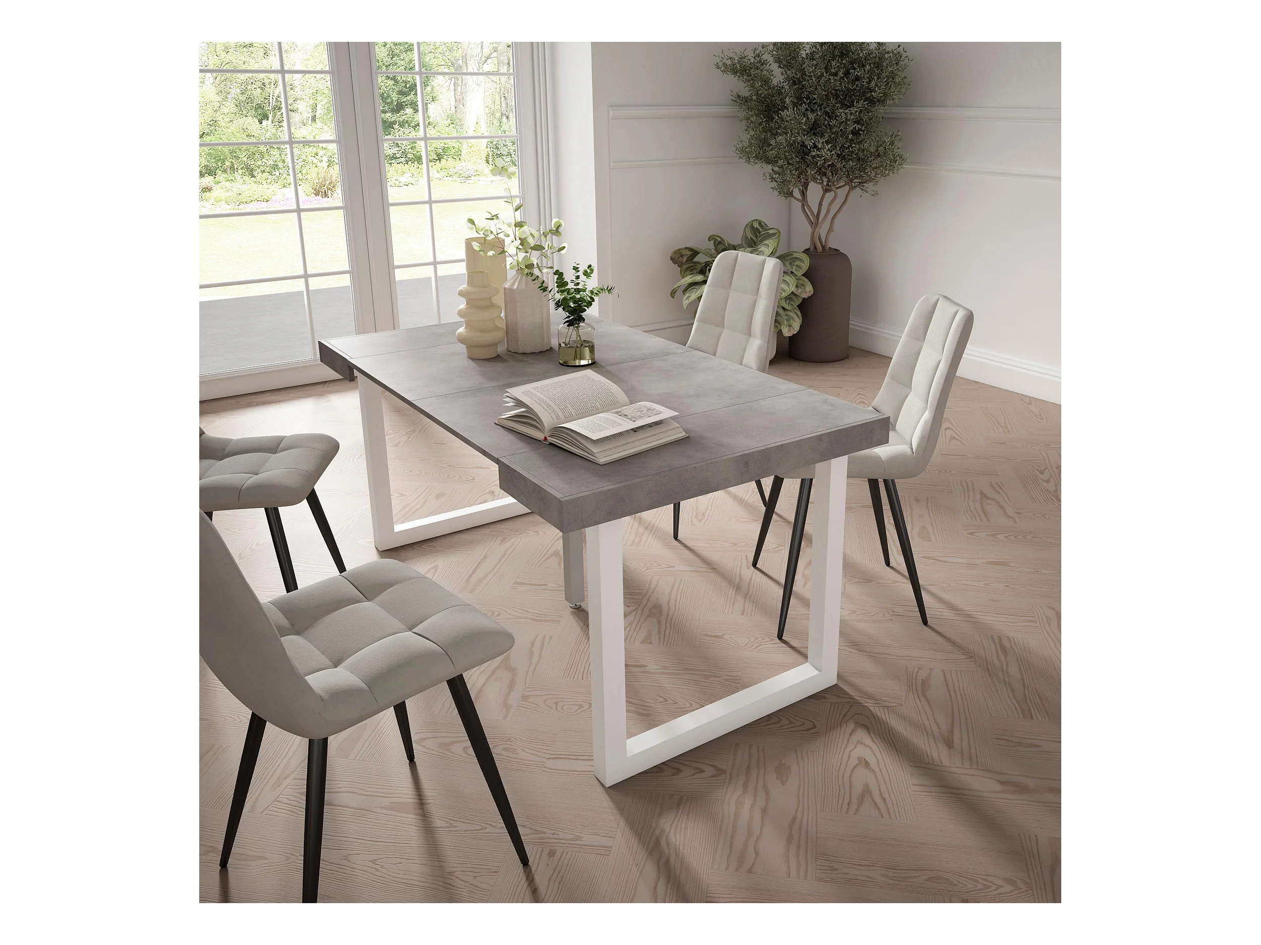 Table console extensible, 160x90x73cm, Pour 8 personnes, Pieds bois massif, Ciment