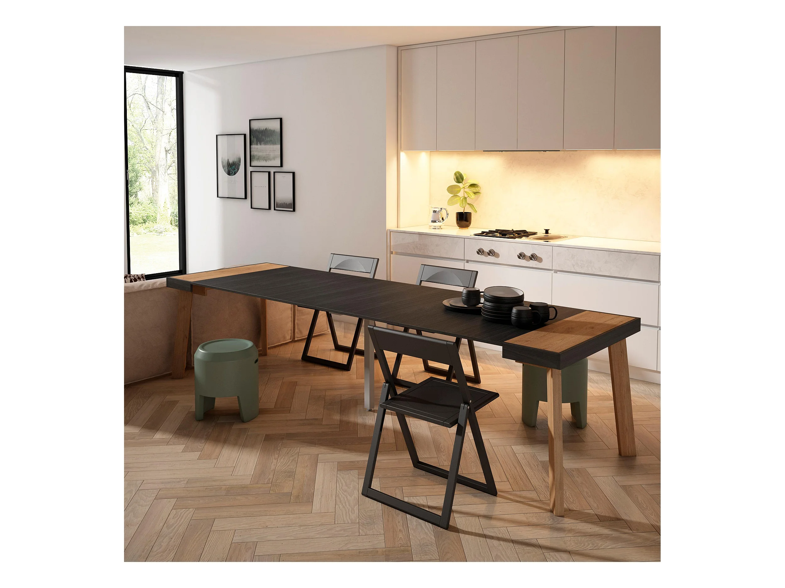 Table console extensible, 302x90x73cm, Pour 14 personnes, Pieds en bois, Chêne et noir