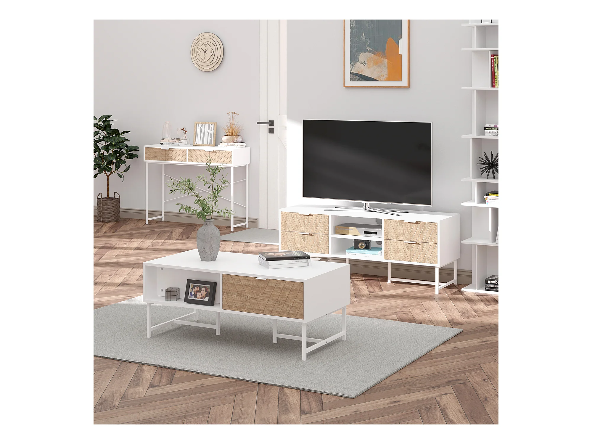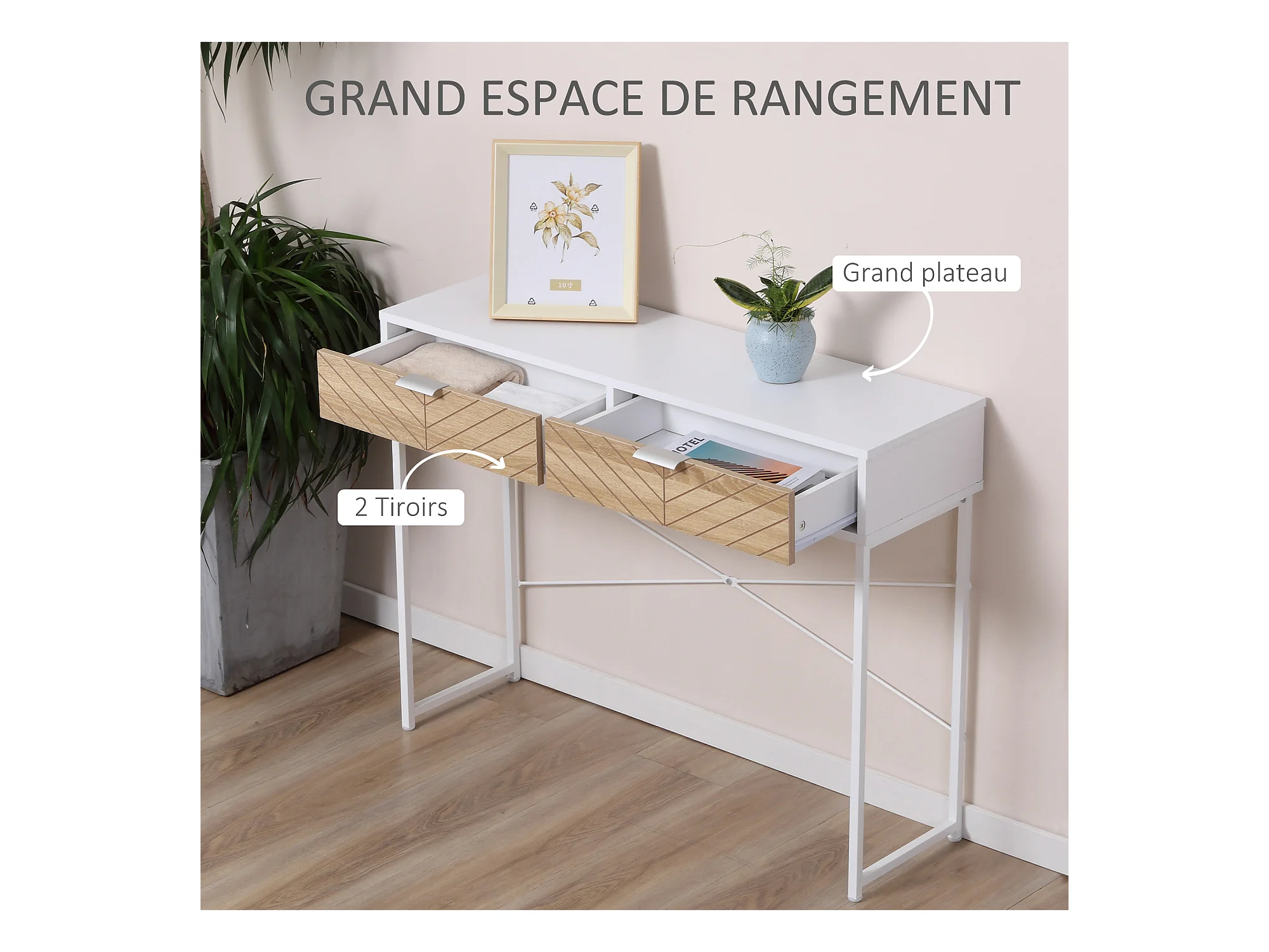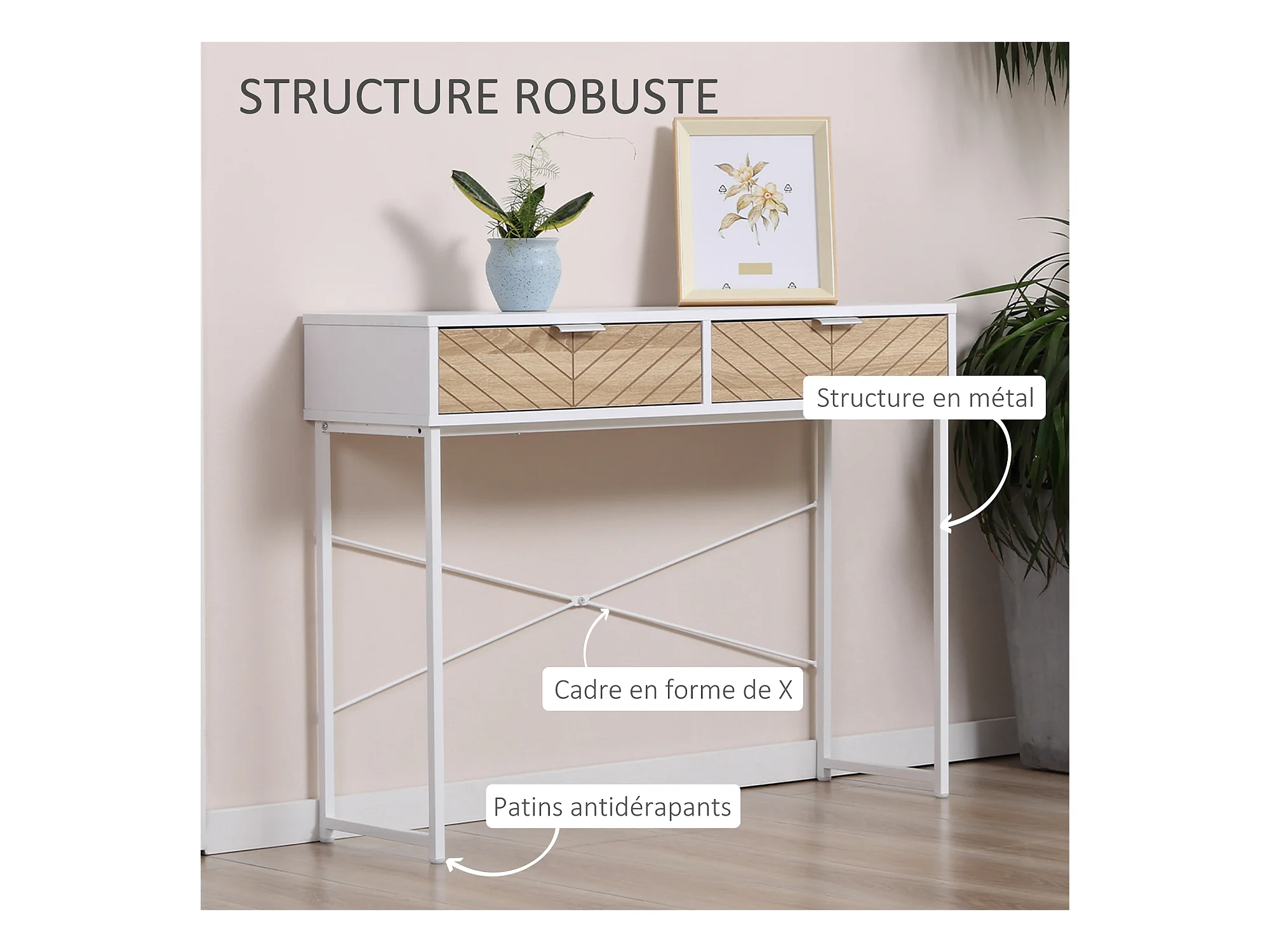 Table console industriel 2 tiroirs aspect bois de chêne sculpté motif à chevrons piètement métal blanc
