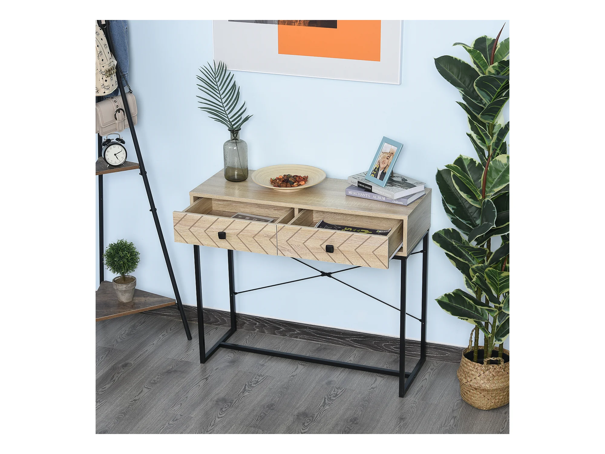 Table console industriel 2 tiroirs bois naturel pieds métal dim. 90 x 35 x 76 cm