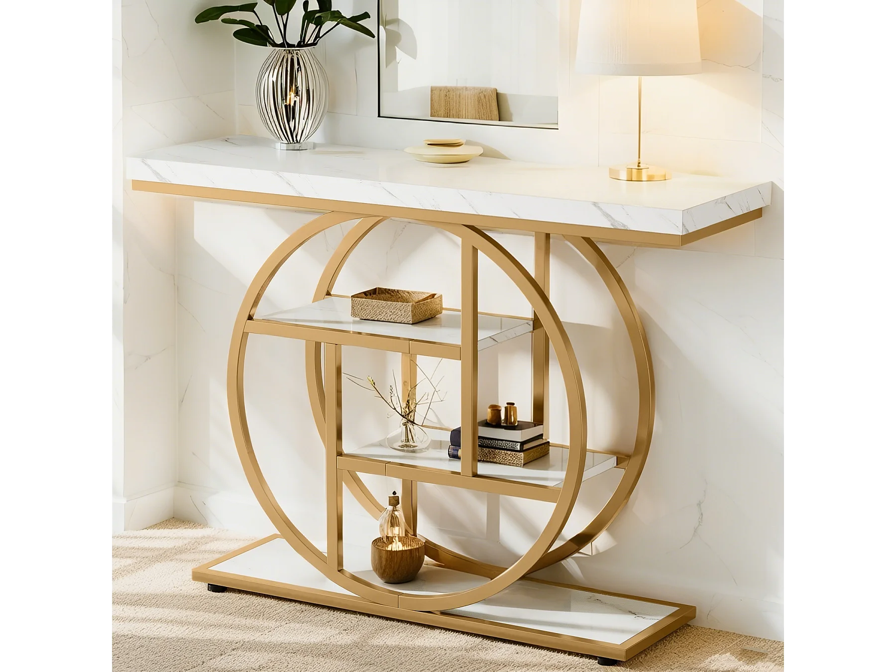 Table Console Industrielle 4 Niveaux avec Base Circulaire Dorée - Table d'Appoint Étroite en Bois avec Étagères pour Salon,Blanc et Doré