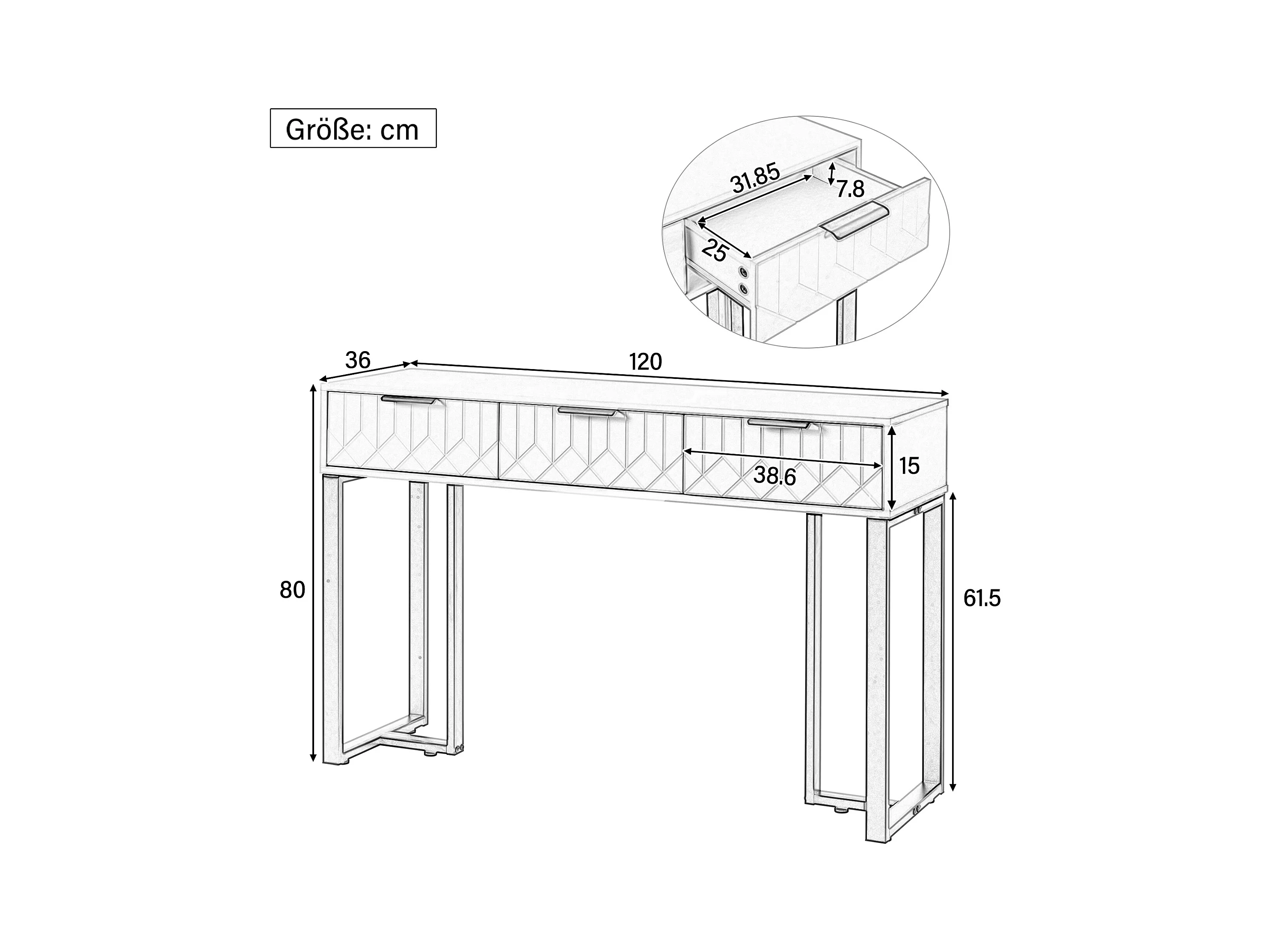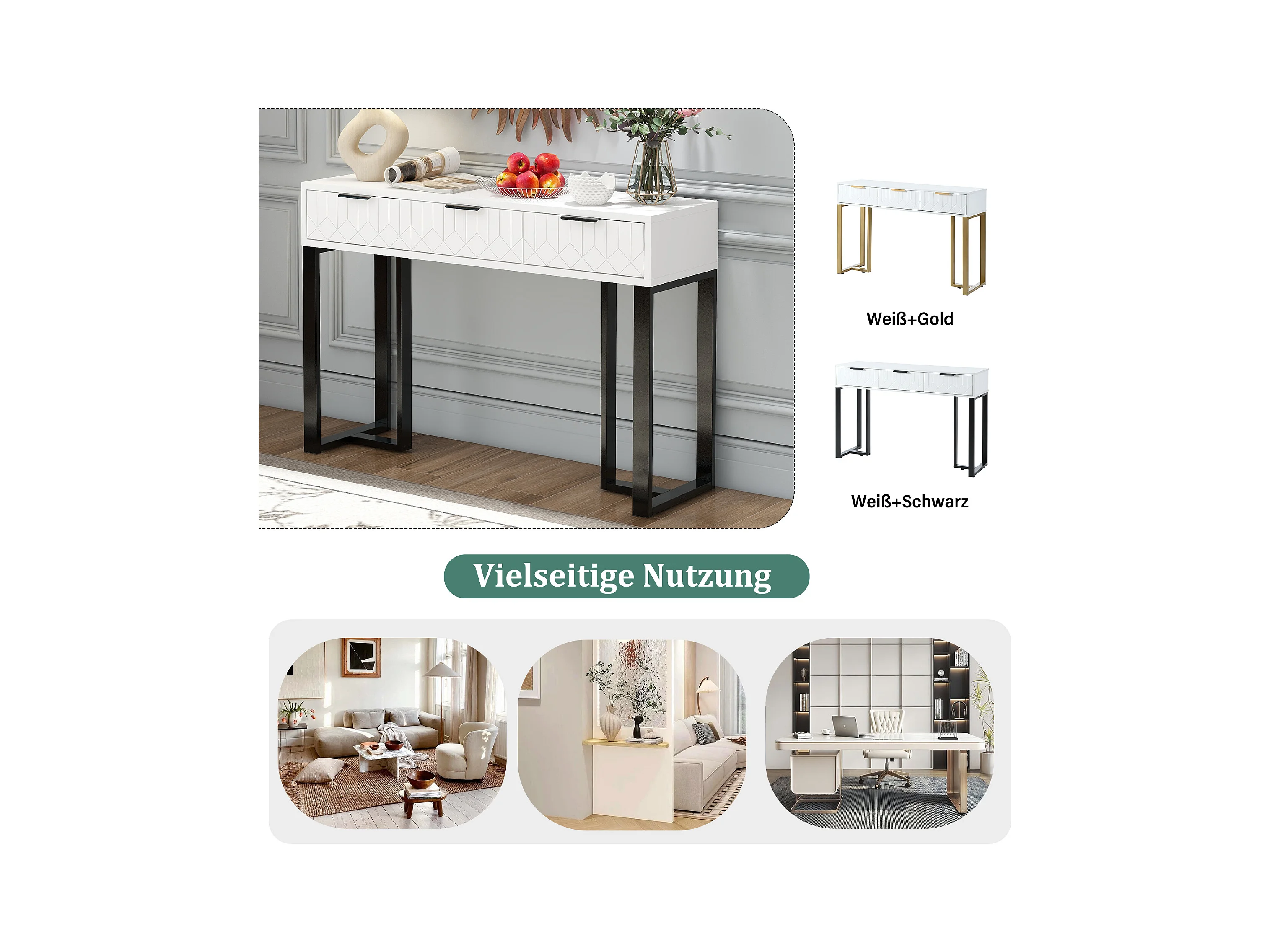 Table Console Moderne avec Tiroirs, Cadre Métallique Doré, Pieds Ajustables, Poignées Élégantes (Blanc + Noir)