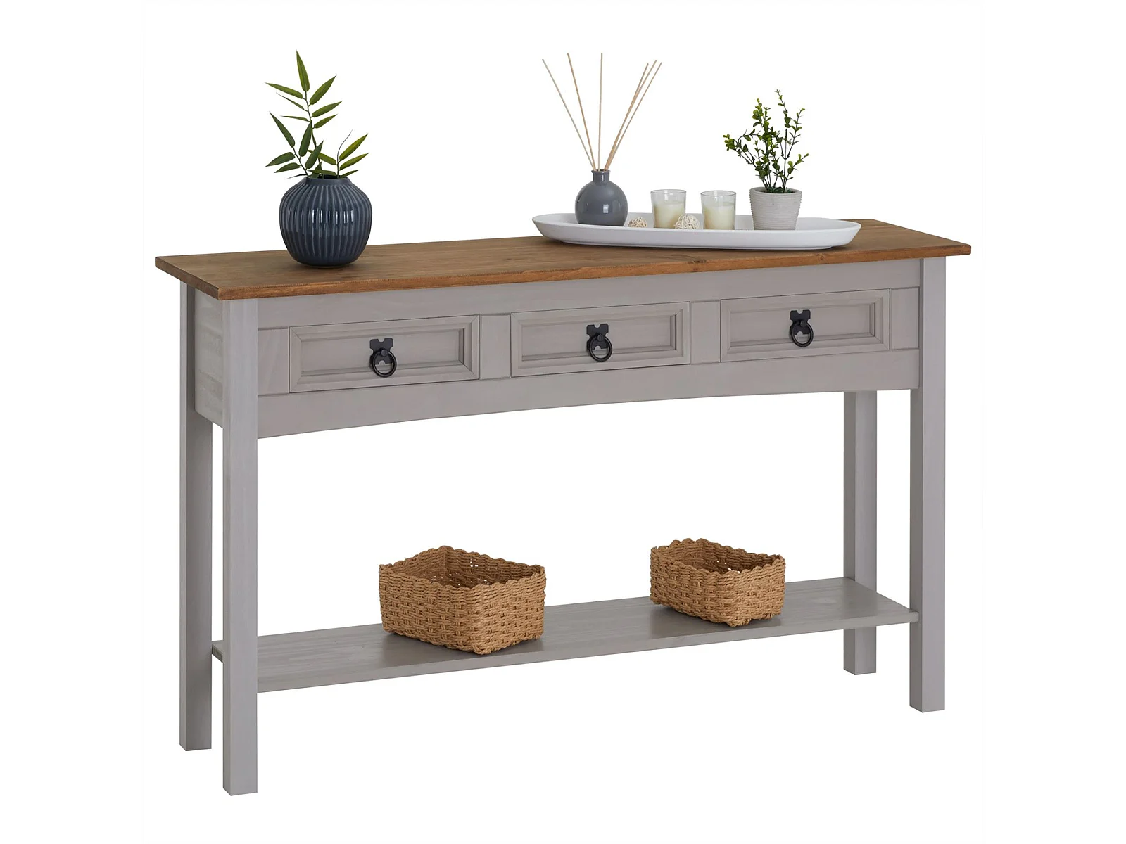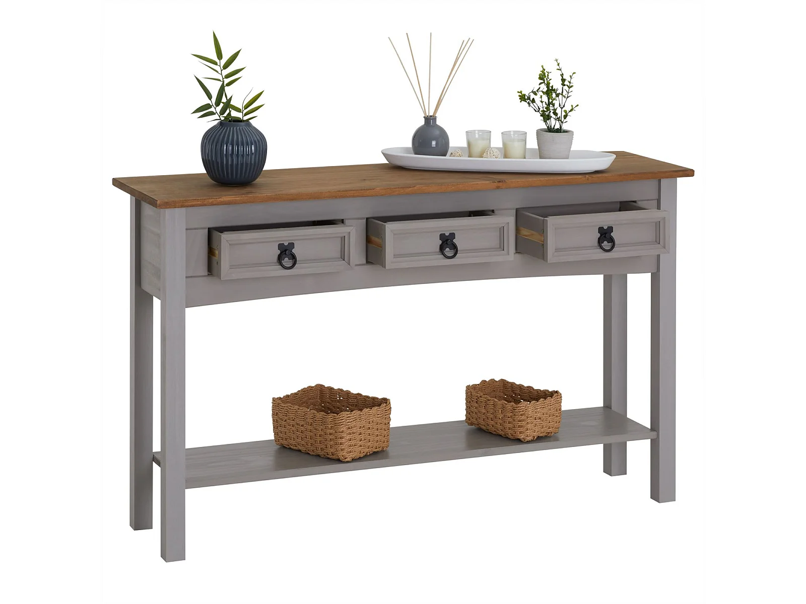 Table console RAMON table d'appoint rectangulaire en pin massif gris et brun avec 3 tiroirs, meuble d'entrée style mexicain en bois