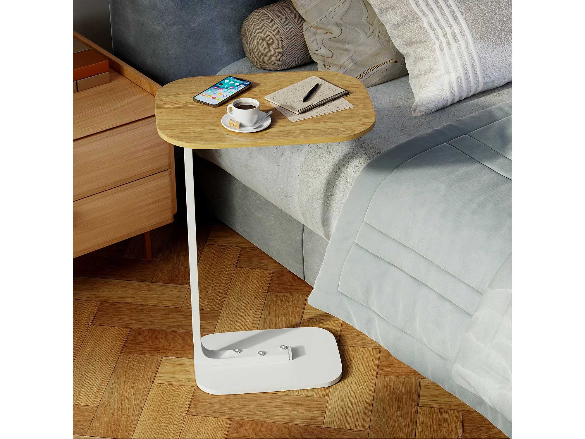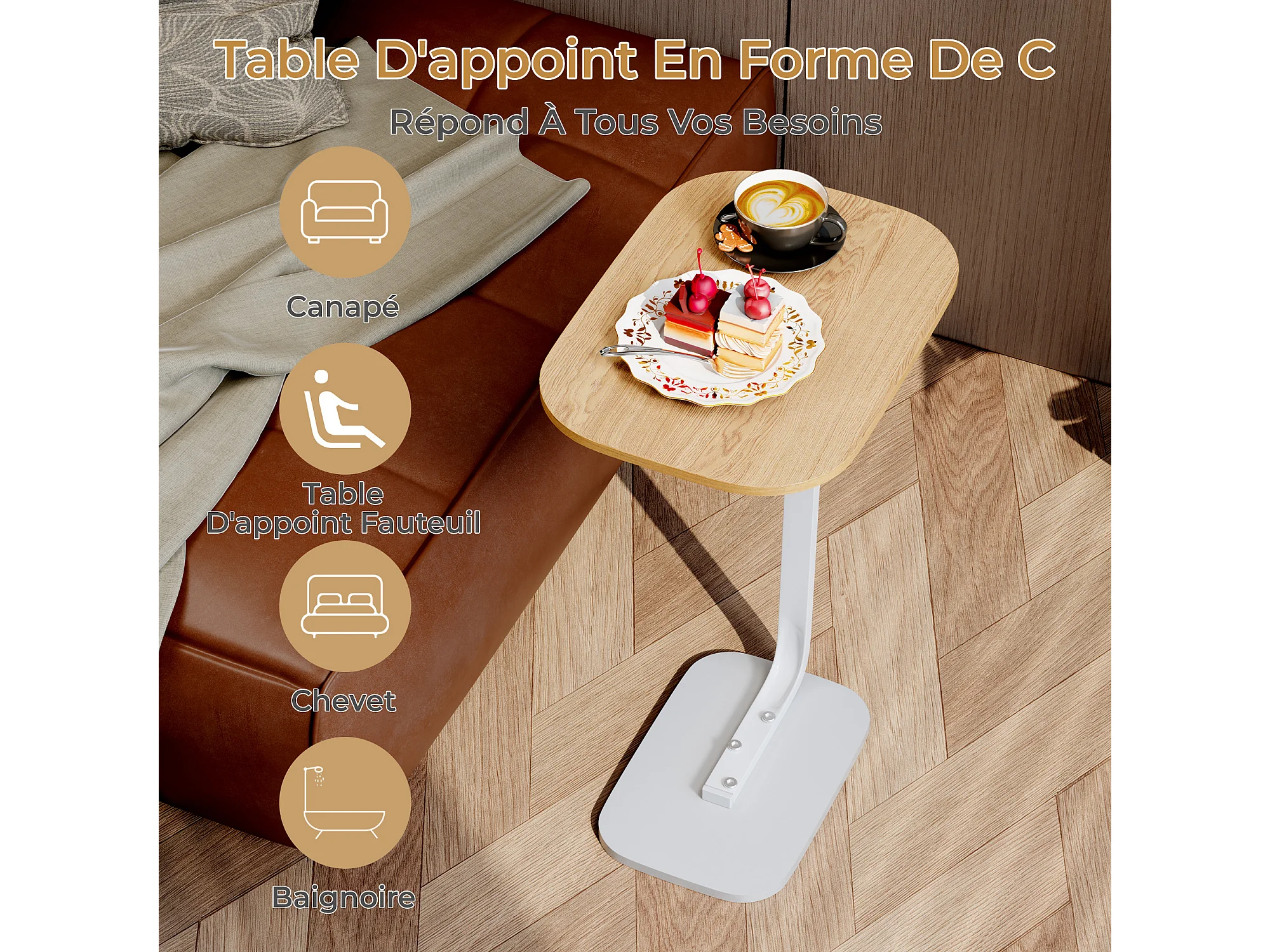 Table d’appoint en forme C pour canapé – Plateau effet bois - Couleur bois cliar et blanc