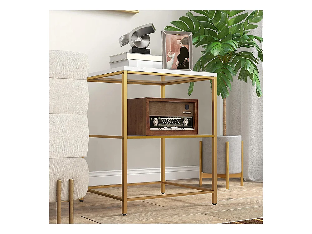 Table d'appoint bout de canapé avec 2 étagères effet marbre et structure en métal doré
