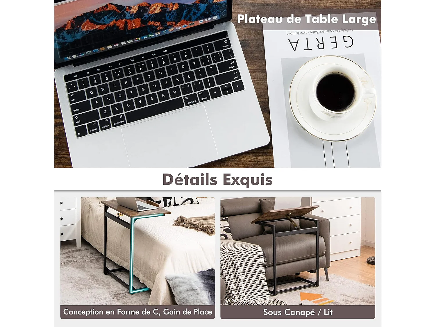 Table d’appoint en forme de c, plateau réglable à 5 positions, brun