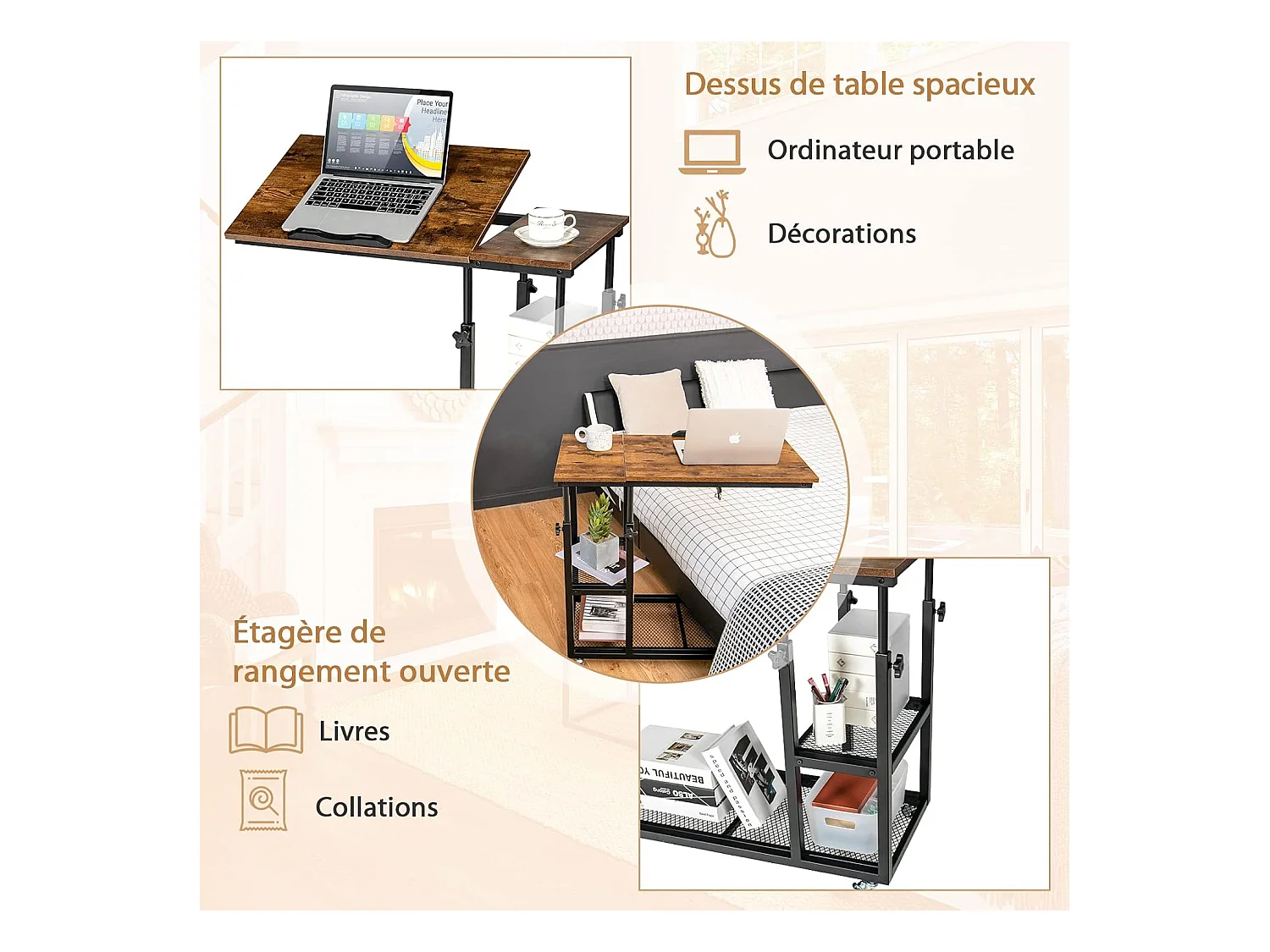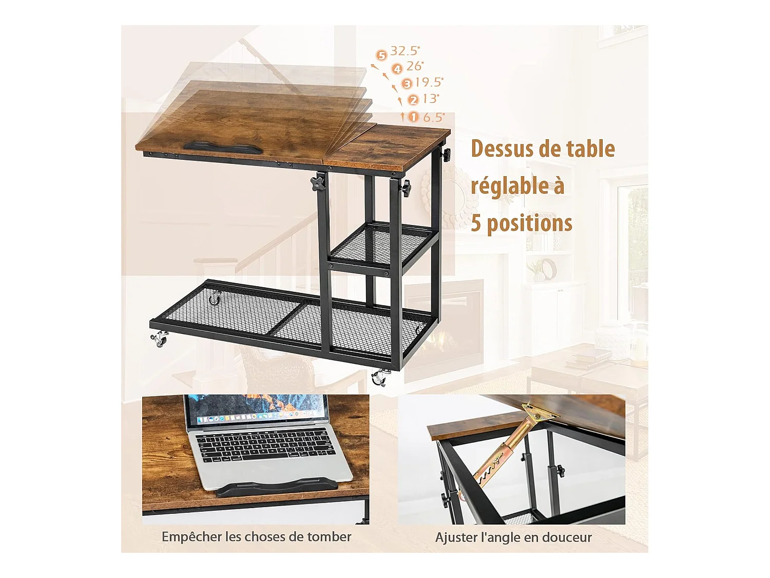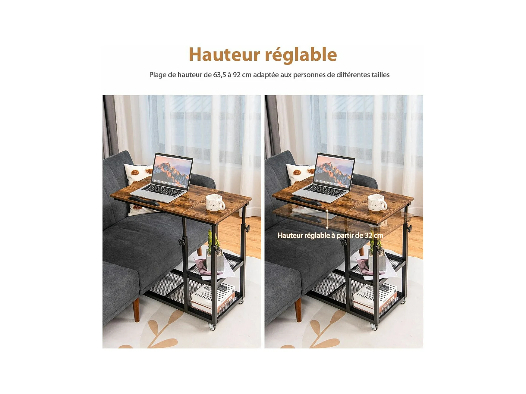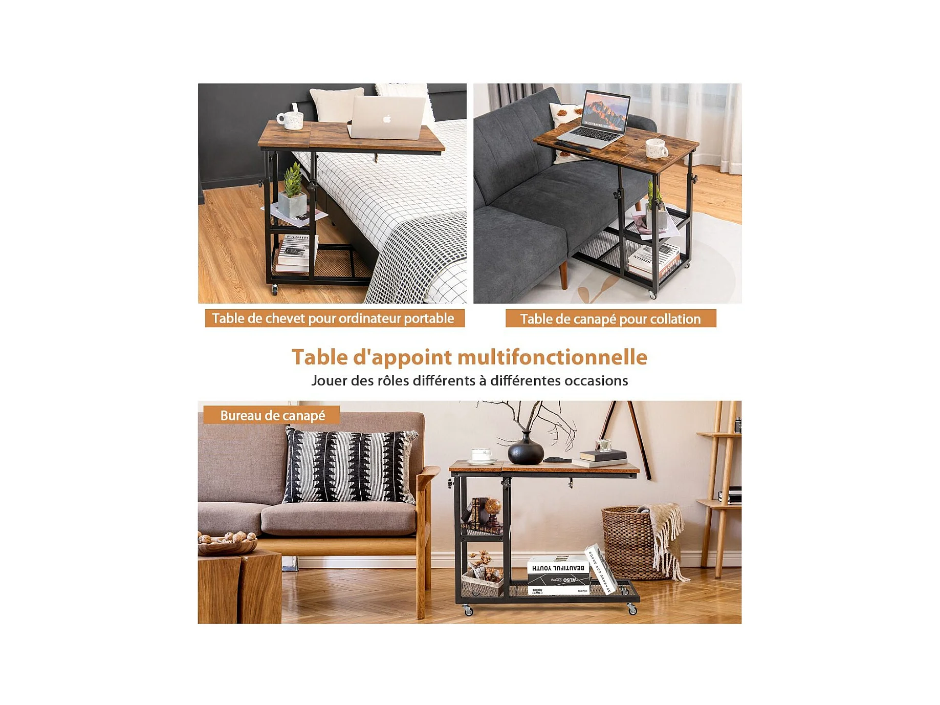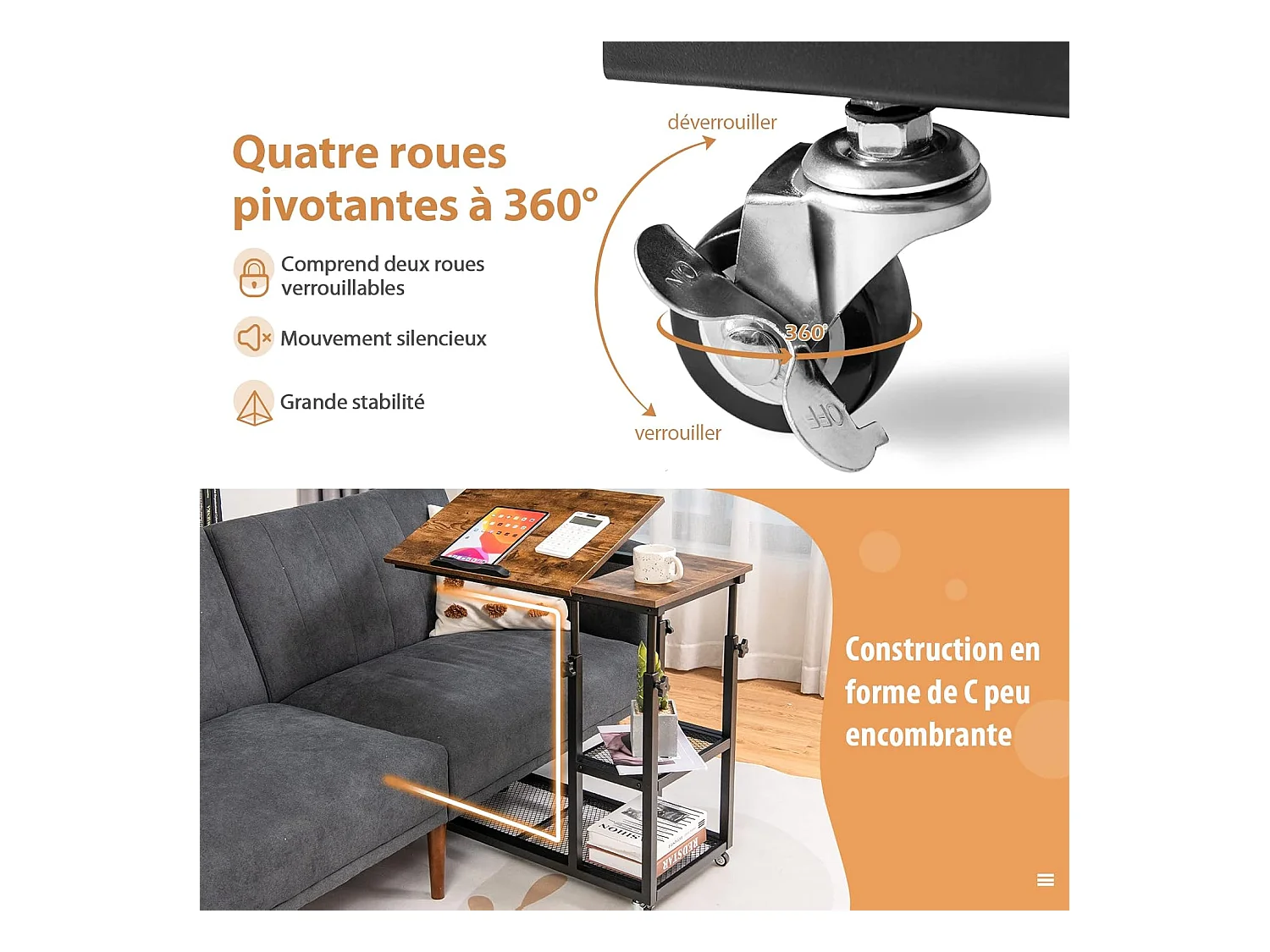 Table d’Appoint, Bout de Canapé en Forme C, Plateau Réglable en 5 Angles, Hauteur Réglable 64-92cm, 2 Étagères, Table de Lit à Roulette, Style Industriel (Brun)