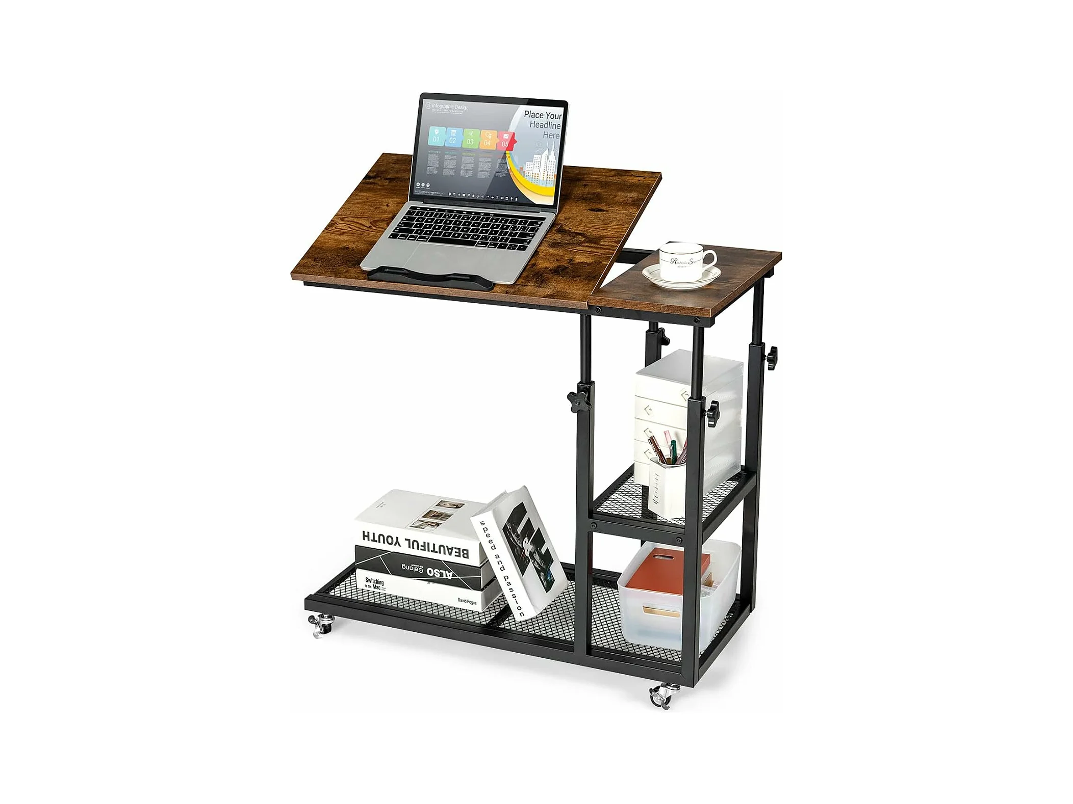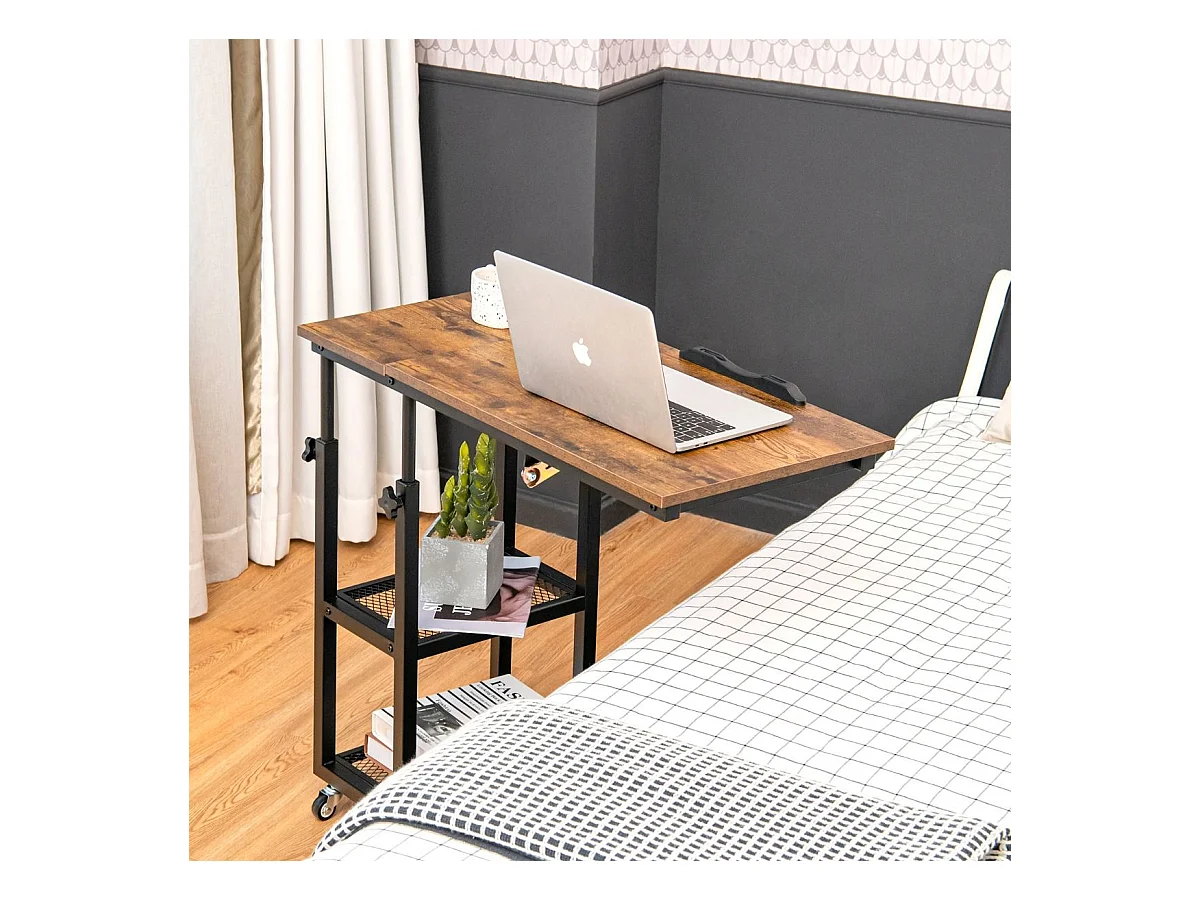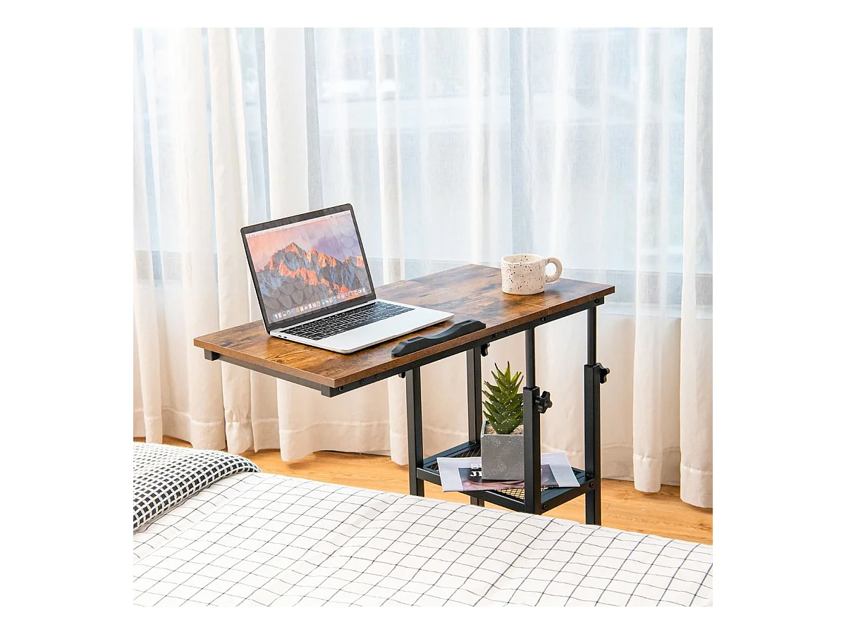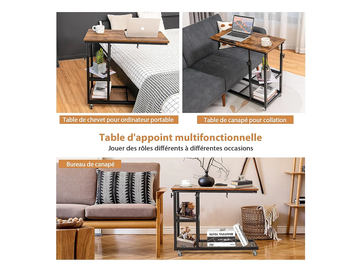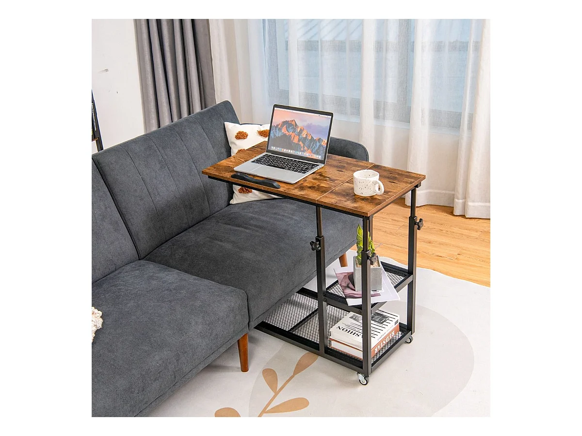 Table d’Appoint, Bout de Canapé en Forme C, Plateau Réglable en 5 Angles, Hauteur Réglable 64-92cm, 2 Étagères, Table de Lit à Roulette, Style Industriel (Brun)